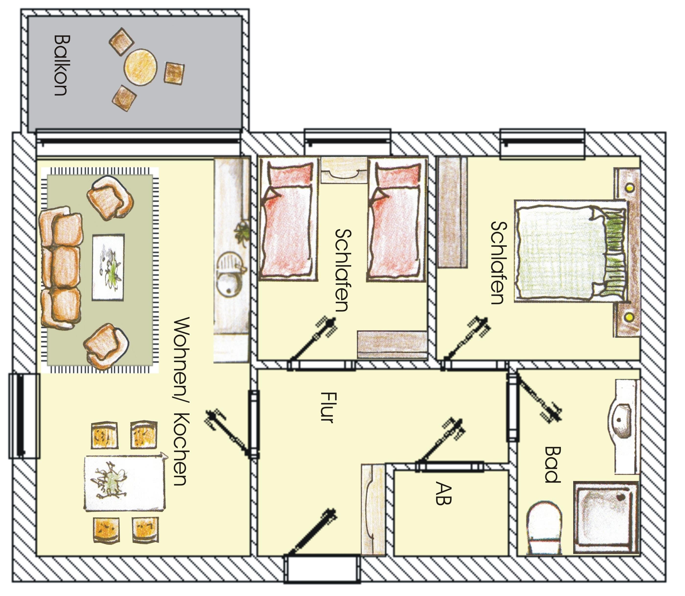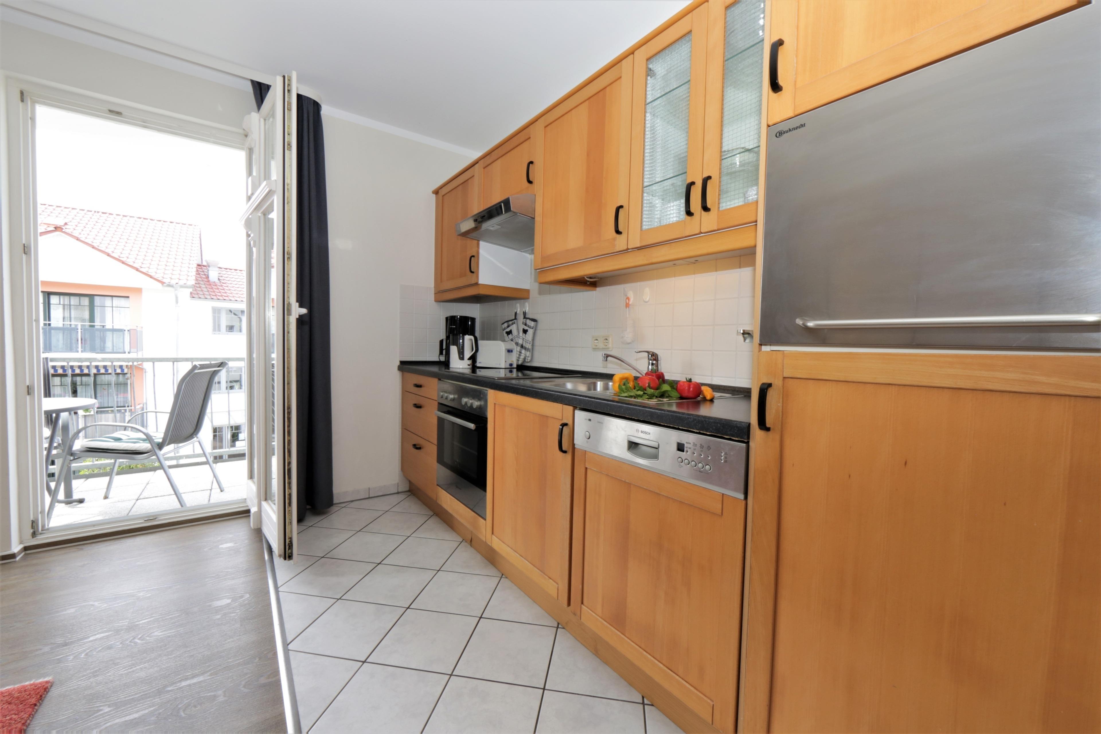 Dieses 64 qm große 3-Zimmer-Appartement im 2. Obergeschoss können Sie über den Fahrstuhl erreichen. Das großzügige gemütliche Wohnzimmer mit einem Sofa und großem Esstisch bietet bis zu 4 Personen Platz zum Essen und Relaxen. Die Vollküche ist ebenfalls offen im Wohnraum integriert und mit Geschirrspüler, Backofen mit Cerankochfeld, Kühlschrank etc. ausgestattet. Das größere Schlafzimmer ist mit einem Doppelbett mit getrennten Matratzen (90 x 200), das kleinere mit zwei Einzelbetten (90 x 200) sowie ausreichend Schrankraum ausgestattet. Im Bad stehen Ihnen Dusche und Waschbecken/WC zur Verfügung. Von dem westlich ausgerichteten Balkon, der vom Wohnraum zu betreten ist, können Sie einen Blick auf die Ostsee erhaschen. Ein PKW-Stellplatz befindet sich in der zum Haus gehörigen Tiefgarage und ist der Wohnung zugeordnet. Ein Fahrradständer steht den Gästen im Kellergeschoss ebenso zur Verfügung wie Waschmaschine und Trockner gegen Gebühr.