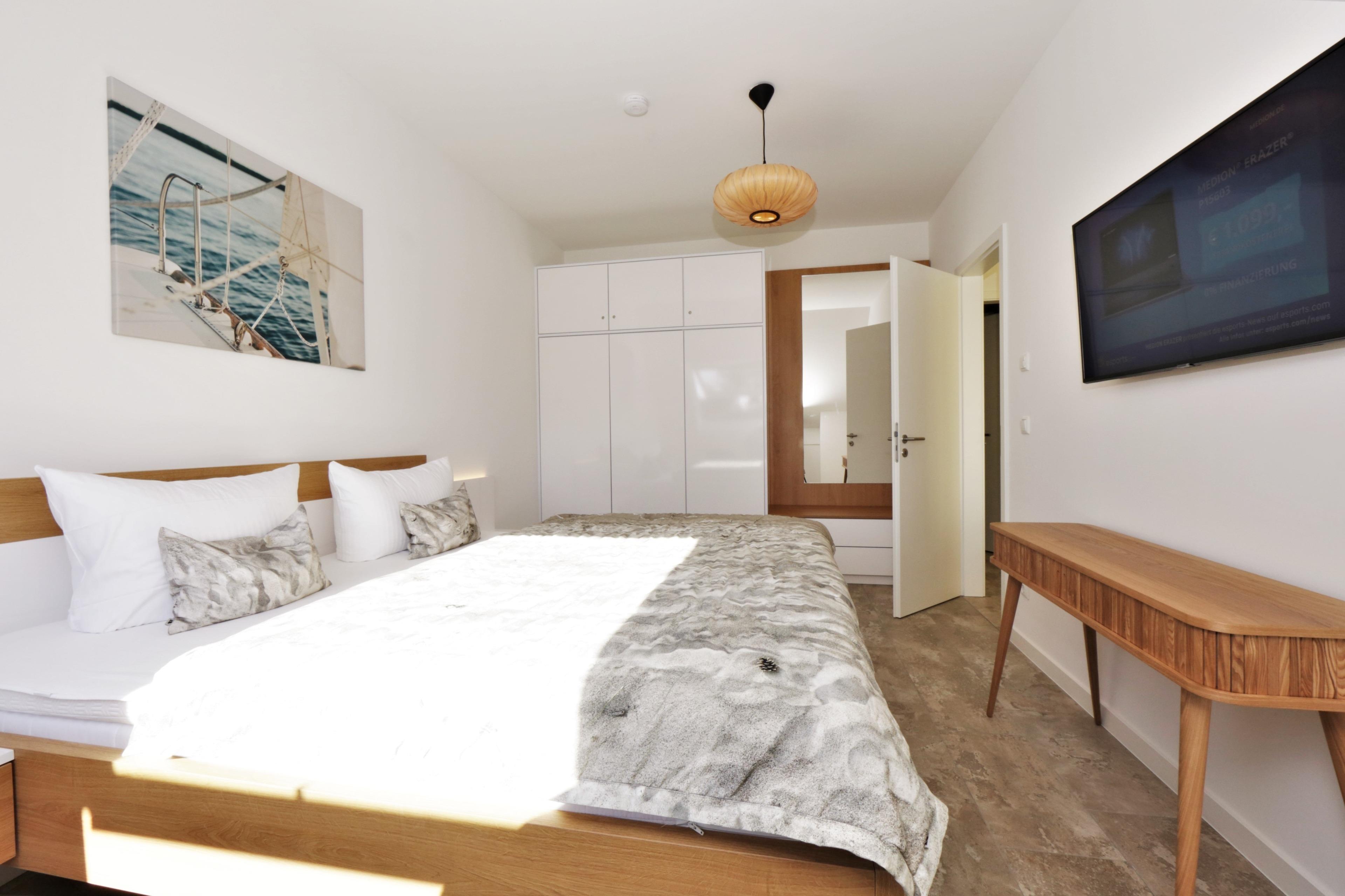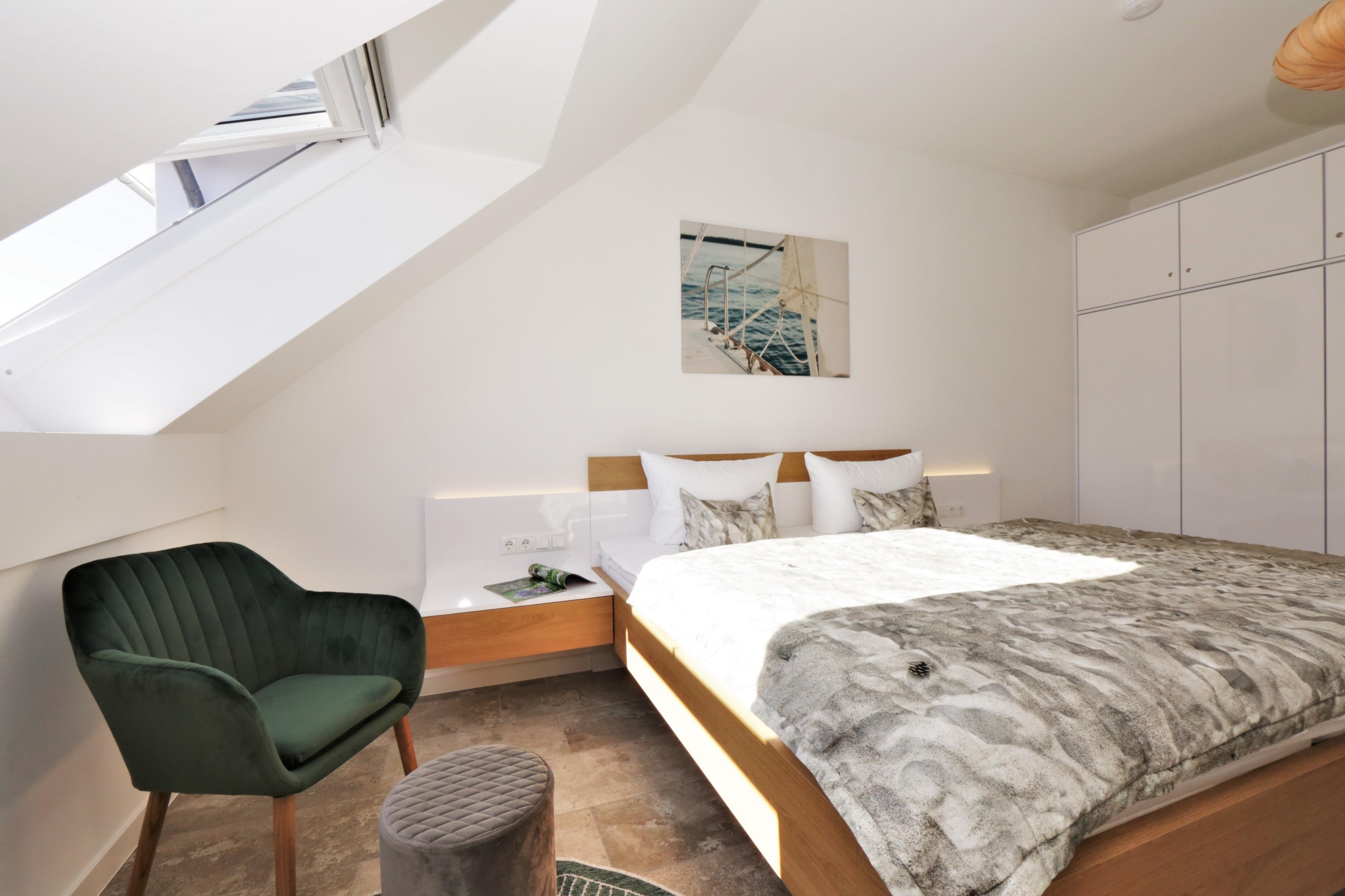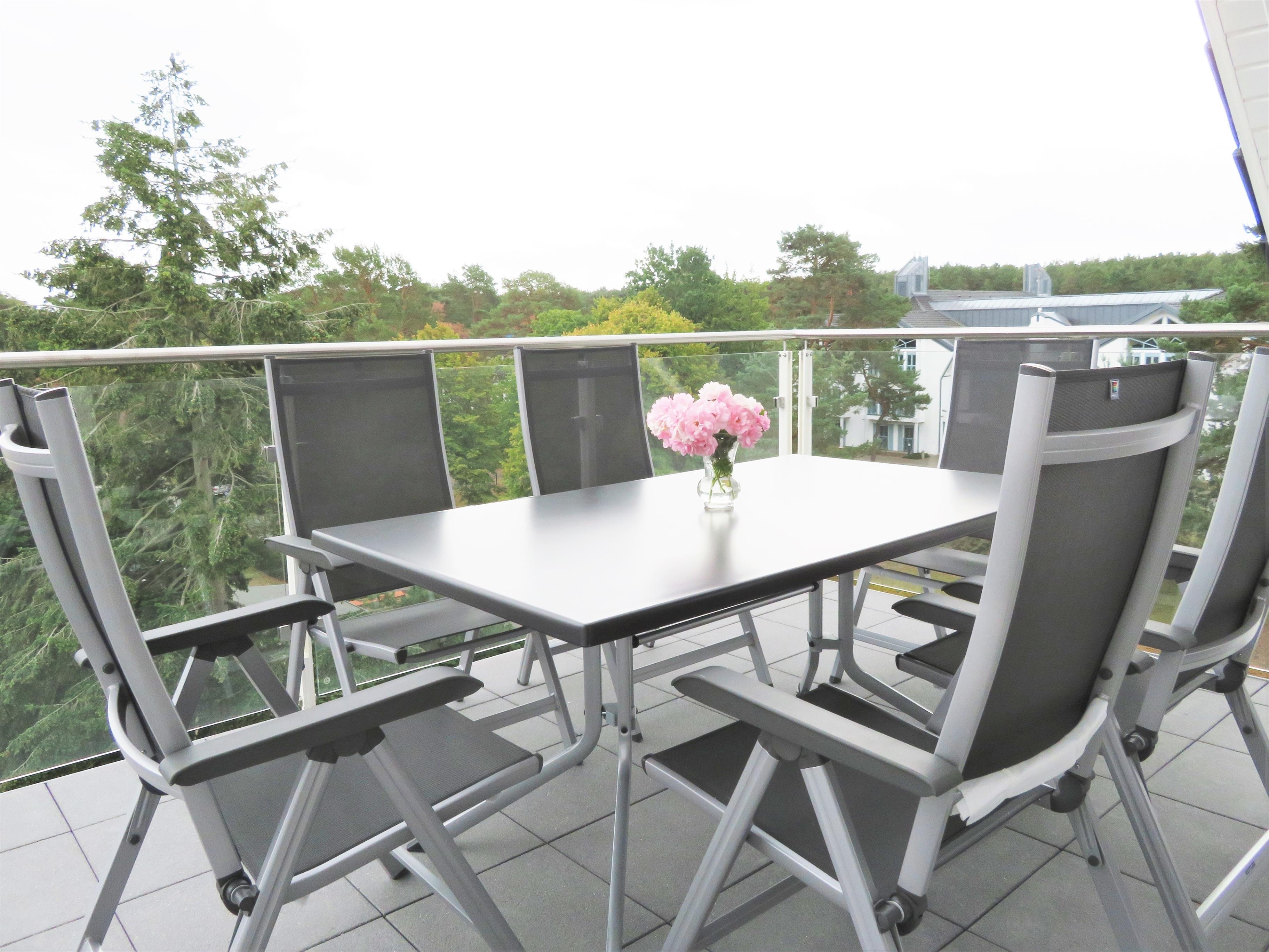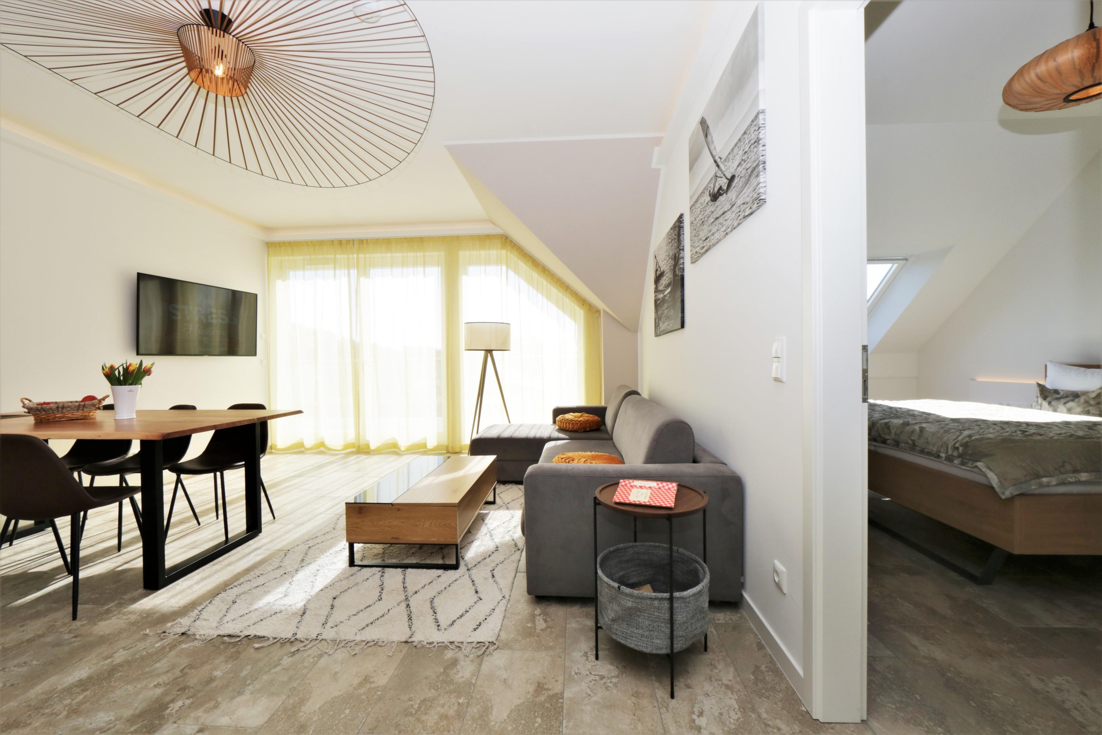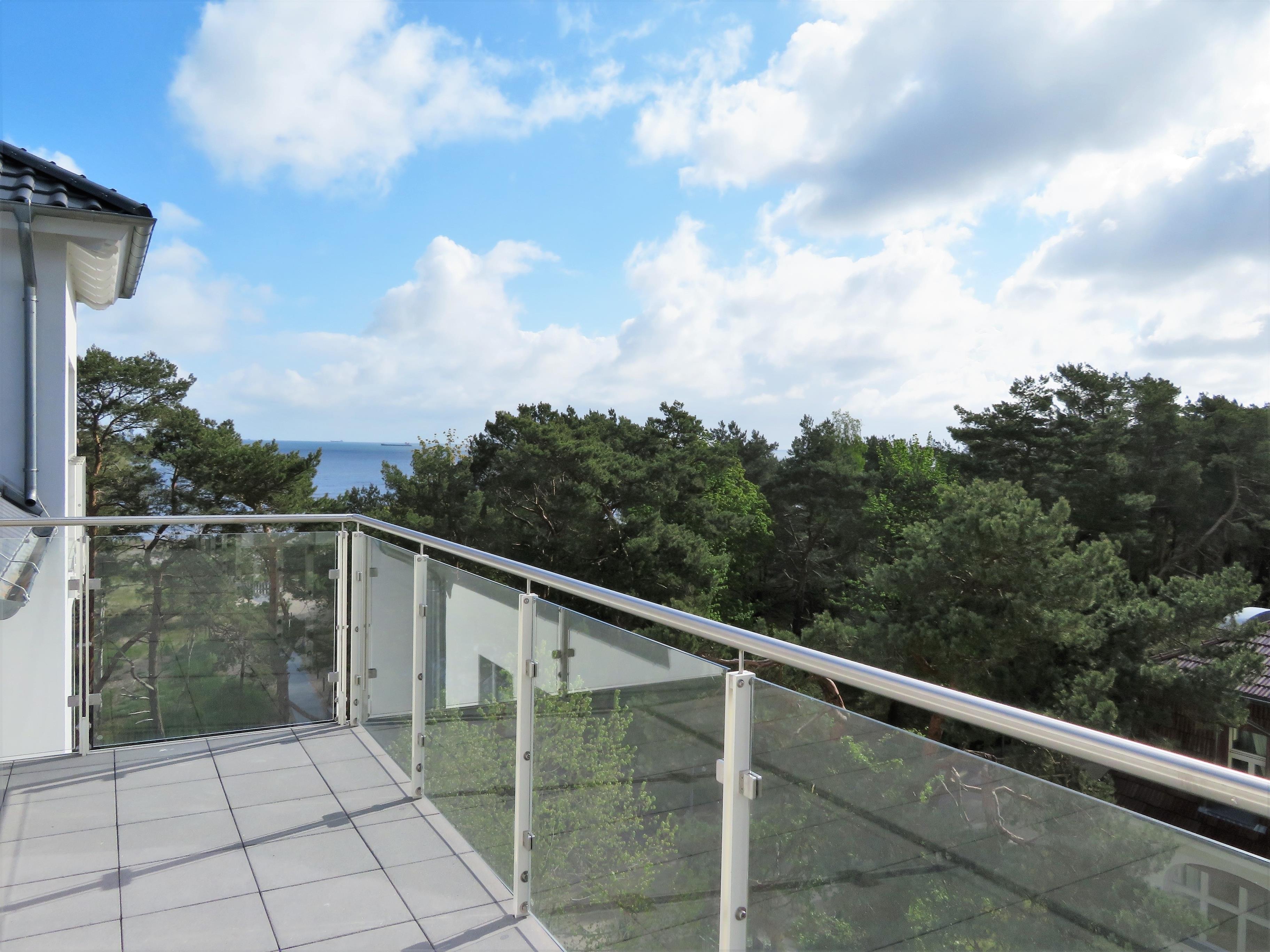 Dieses mit 77 qm großzügige 3-Zimmer Appartement befindet sich im Dachgeschoss der 2018 neu erbauten Strandresidenz und bietet 4 bis maximal 5 Personen reichlich Komfort. Genießen Sie Ihren Urlaub direkt am Meer in dieser hochwertig und sehr geschmackvoll eingerichteten Wohnung. Im Wohnbereich mit großer Fensterfront erwartet Sie eine bequeme Polstergarnitur bestehend aus Sofa (mit Schlaffunktion 140 x 190) und Sessel, ein Couchtisch und großer Flat TV sowie ein gemütlicher Esstisch für gemeinsame Mahlzeiten. Ein Gaskamin sorgt ebenso für Gemütlichkeit wie für zusätzliche Wärme bei Bedarf. Die moderne Küche mit Cerankochfeld, Backofen, Geschirrspüler, Kühlschrank etc. ist offen im hinteren Wohnbereich integriert. Beide Schlafzimmer verfügen jeweils über ein komfortables Doppelbett mit getrennten Matratzen (Topper 180 x 200), reichlich Schrankraum sowie einen zusätzlichen großen Flat TV. Über den Wohnbereich sowie eines der Schlafzimmer erreichen Sie den riesigen zum Osten ausgerichteten Balkon, der am Vormittag viele Sonnenstunden verspricht und Sie zum Frühstücken im Freien einlädt. Genießen Sie den Blick auf die Promenade und auf die Ostsee zwischen den Baumkronen hindurch. Die Glaseinfassung am Balkon schützt Sie vor möglichem Wind. Beide Badezimmer sind mit einer bodengleichen Dusche mit Echtglasabtrennung und Waschtisch/WC ausgestattet.