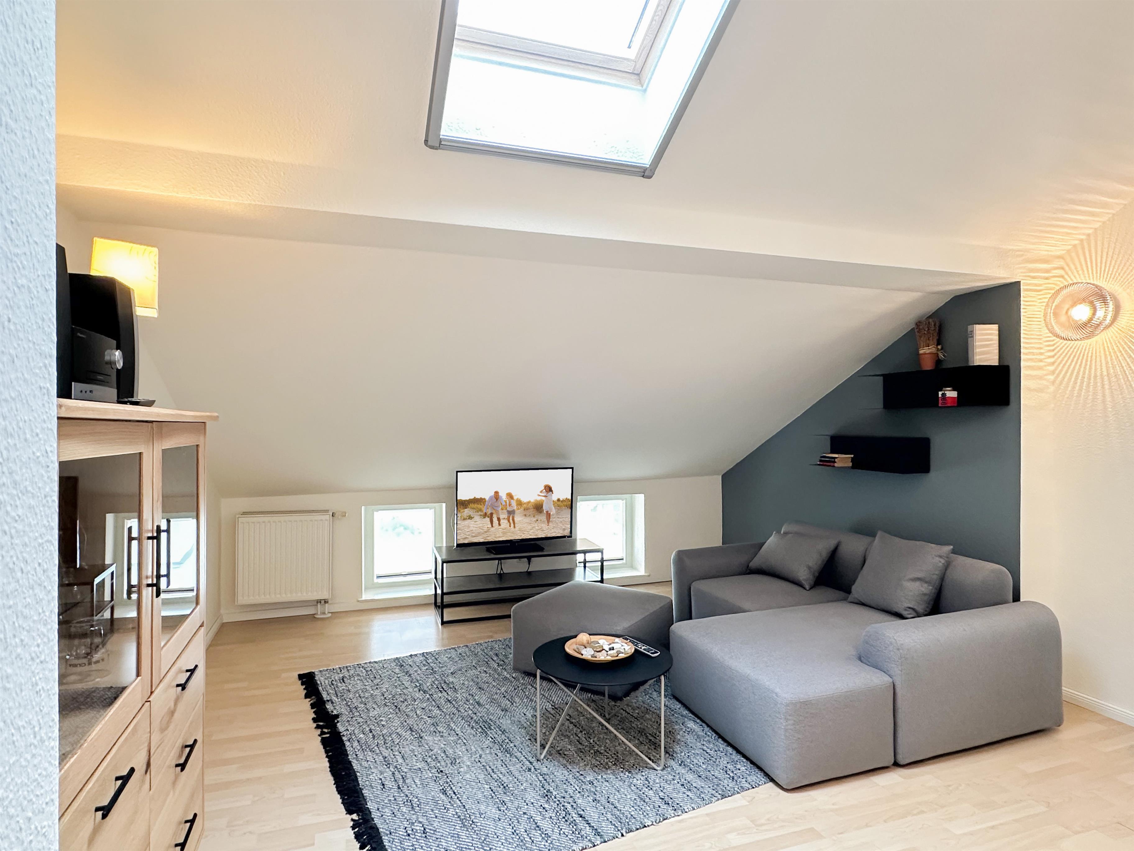 Diese interessante, großzügige Dachgeschoss-Wohnung (Achtung eingeschränkte Deckenhöhe) im 2. Obergeschoß, über den Dächern von Ahlbeck, bietet Ihnen zwei gemütliche Wohnräume, drei Schlafräume und 2 Loggien. Ein heller freundlicher Wohnraum empfängt Sie mit einer großzügigen Polstergruppe (Schlafplatz für die 6. Person) und Flat TV. Die angrenzende Loggia lädt auf ein Gläschen Wein oder zum Lesen und Spielen ein. Im kleineren Wohnraum, ebenfalls mit Sitzgruppe und TV, ist die moderne Küche incl. Geschirrspüler, Cerankochfeld, Backofen Kühlschrank offen integriert. Ein separater Esstisch steht Ihnen in der angrenzenden Loggia mit schönem Blick über die Dächer von Ahlbeck zur Verfügung. Zwei Schlafräume sind mit einem Doppelbett mit getrennten Matratzen (90x200) und ein Schlafzimmer mit einem Einzelbett (90 x 190) eingerichtet. Das kleine Schlafzimmer mit dem Einzelbett ist ein Durchgangszimmer. Zwei gleichwertige Bäder mit Dachfenster bieten eine Dusche und Waschbecken/WC.