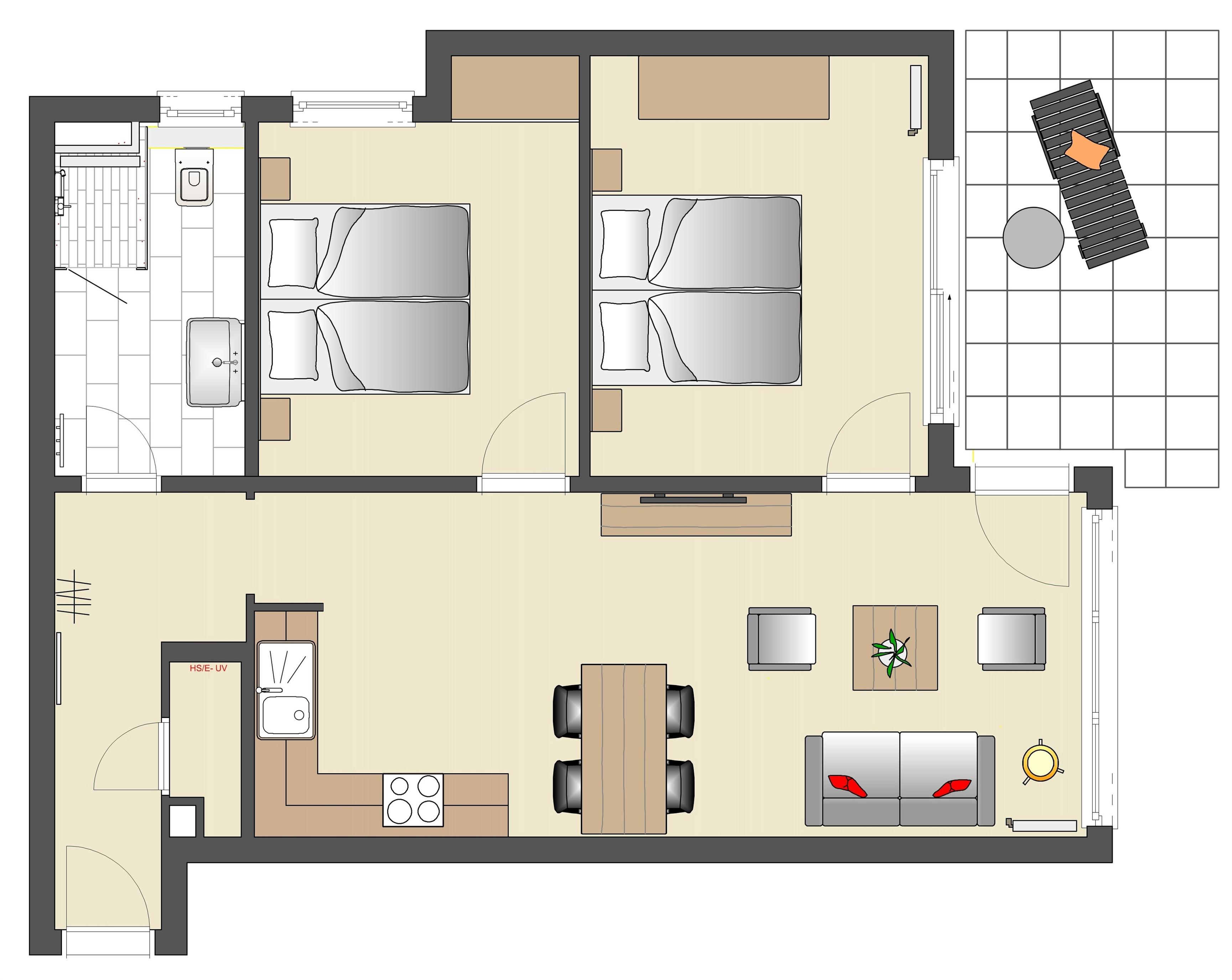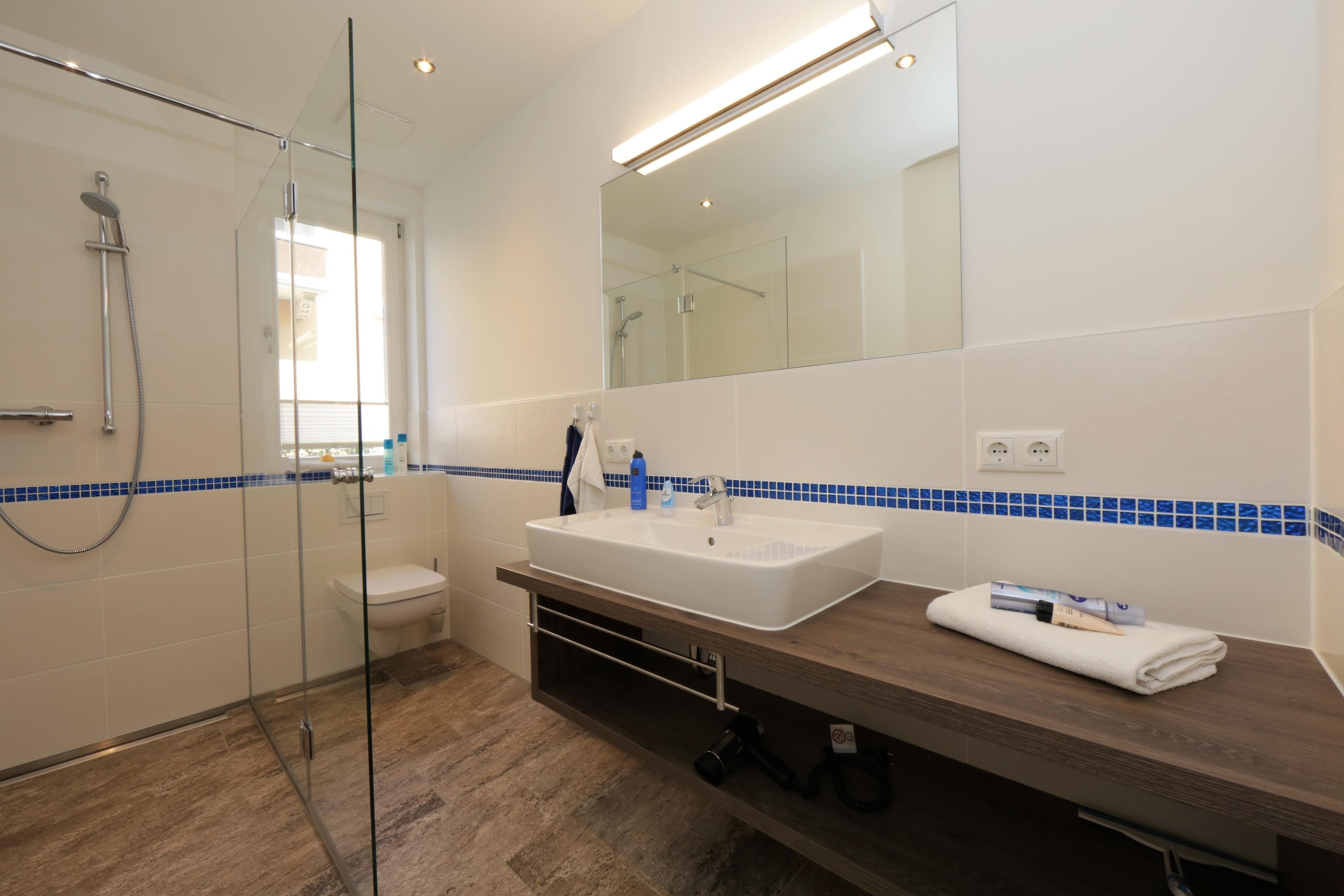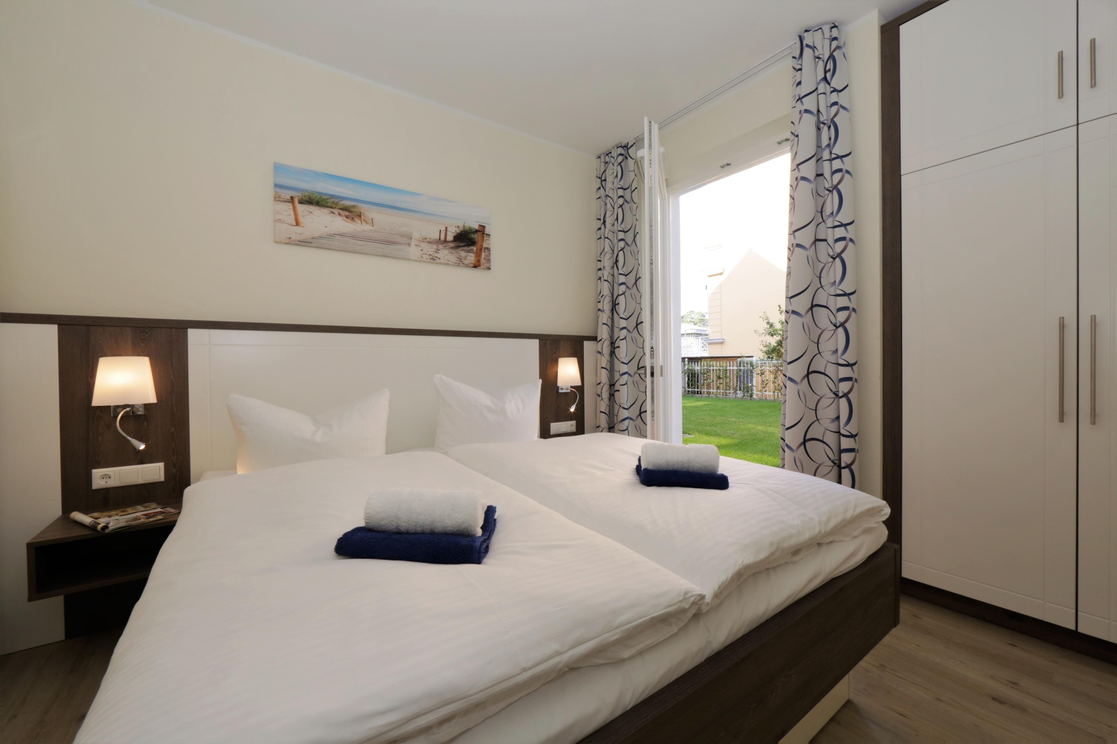 Dieses hochwertige, moderne 3-Zimmer Appartement ist 63 qm groß und befindet sich im Erdgeschoss der 2018 neu erbauten Strandresidenz. Die Wohnung mit 2 Schlafzimmern bietet 4 Personen reichlich Komfort im Urlaub. Im Wohnbereich erwartet Sie eine bequeme Polstergarnitur mit Couchtisch und Flat TV sowie ein Esstisch für gemeinsame Mahlzeiten. Die Küche mit Cerankochfeld, Backofen, Mikrowelle, Geschirrspülmaschine, Kühlschrank etc. ist ebenfalls offen im Wohnraum integriert. Über den Wohnbereich sowie eines der Schlafzimmer erreichen Sie die zur Promenade ausgerichtete überdachte Terrasse. Hier haben Sie bereits zum Frühstück alles im Blick. Die Schlafzimmer verfügen jeweils über ein komfortables Doppelbett mit getrennten Matratzen (90 x 200) und einen Kleiderschrank. Eines der Schlafzimmer ist mit einem zusätzlichen Flat TV ausgestattet. Das großzügige moderne Badezimmer ist mit einer bodengleichen Dusche mit Echtglasabtrennung und Waschtisch/WC ausgestattet.
