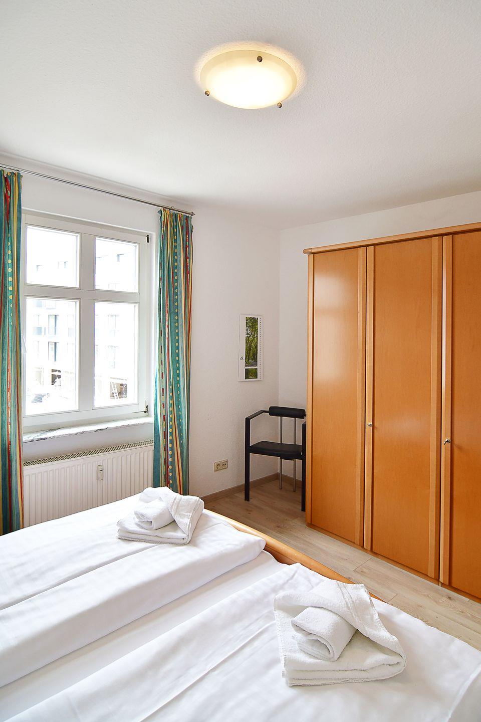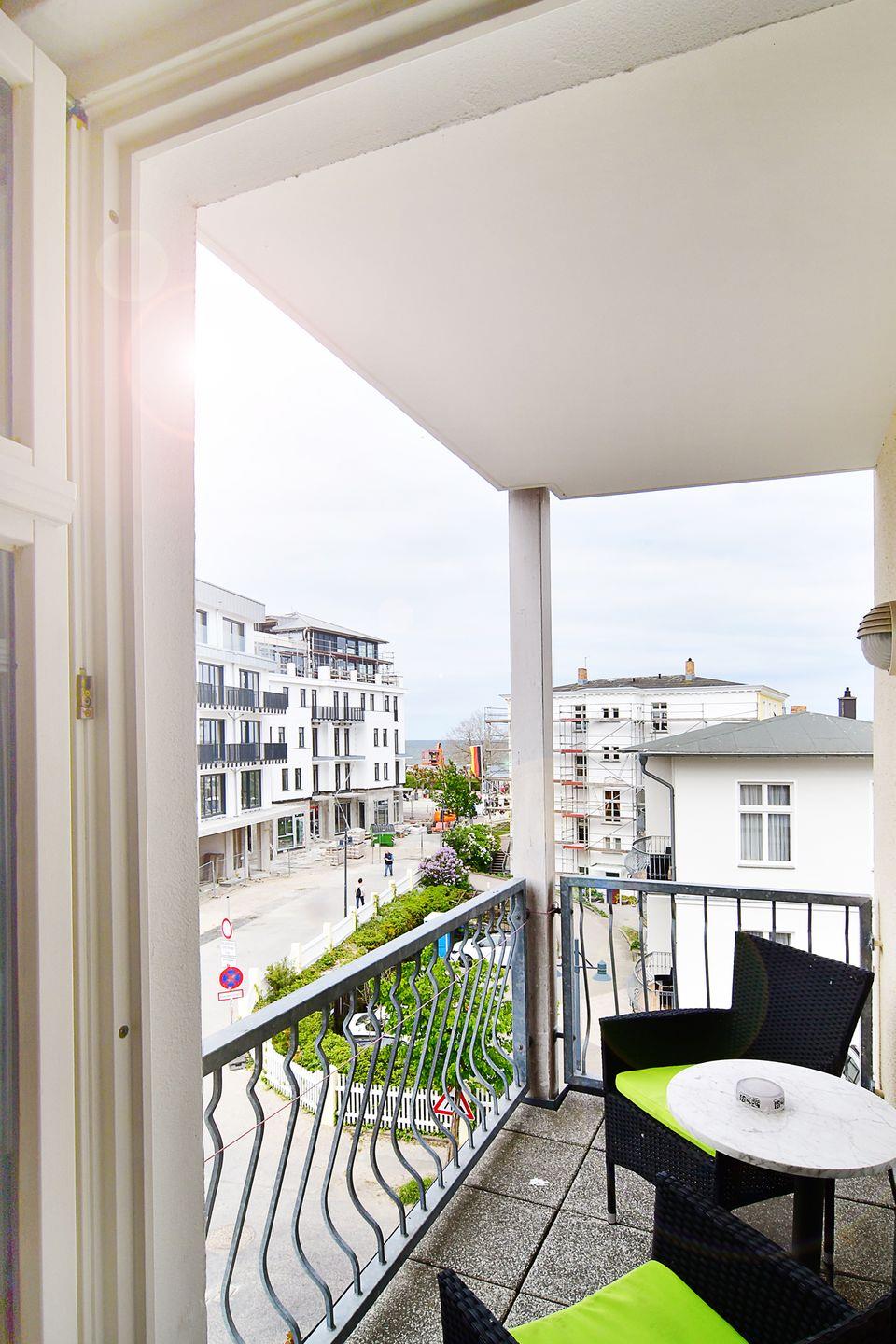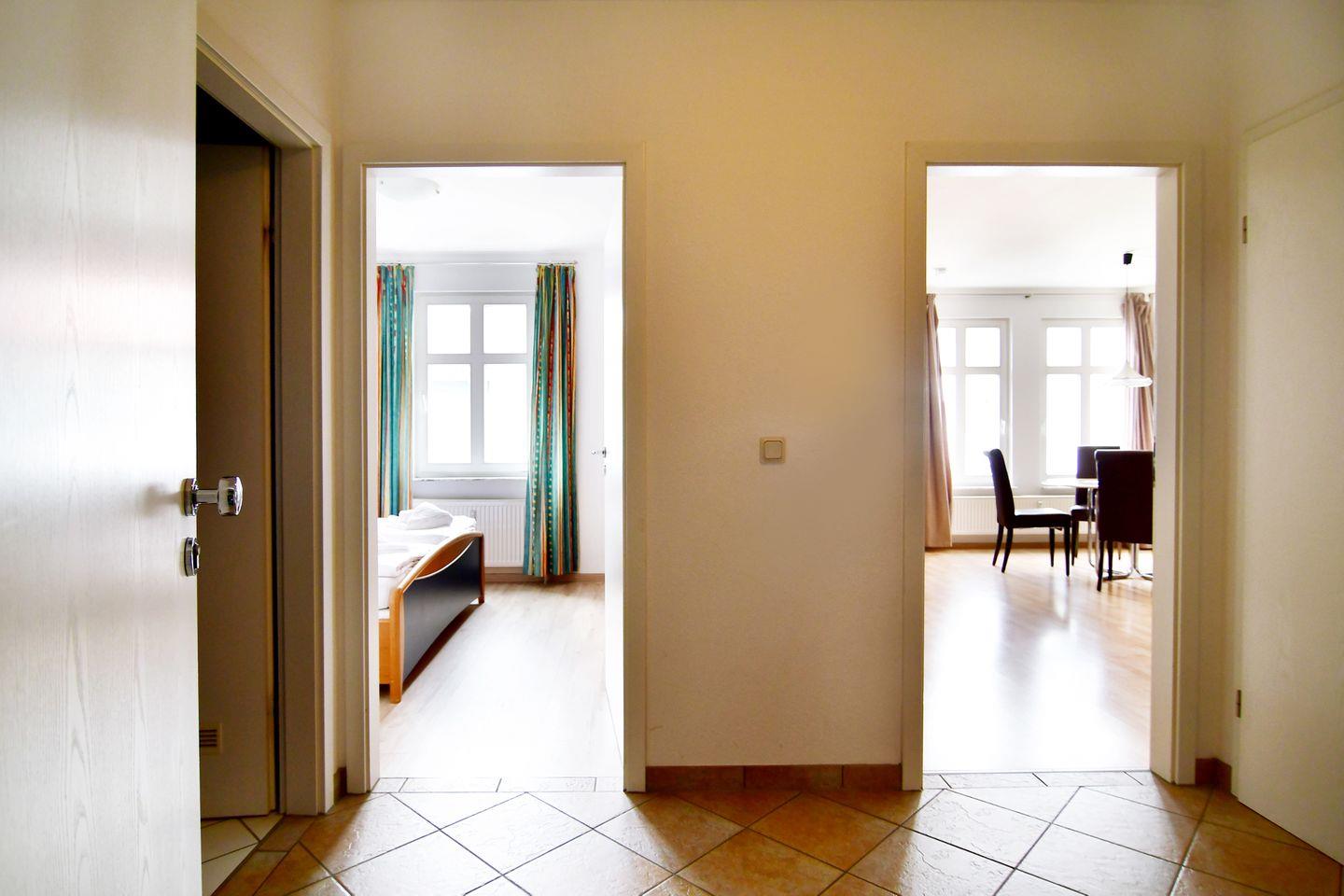 Die 63 m² große Ferienwohnung 21 liegt im 2.OG des Hauses und verfügt über einen Balkon, der einen (kleinen) Blick auf die Ostsee ermöglicht. Ein großzügiger Wohnbereich mit voll ausgestatteter Küchenzeile (neu seit 2020), Essplatz und Schrankbett, ein Schlafraum (Doppelbett) und ein Duschbad