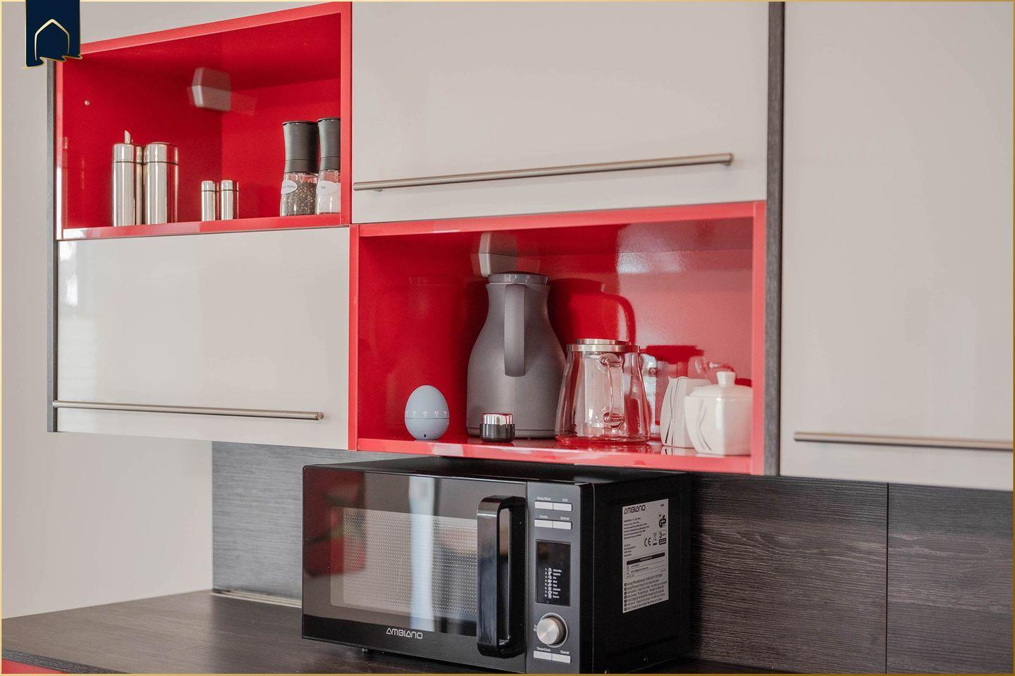 Die Küche ist komplett eingerichtet – mit Herd, Backofen, Gefrierfach, Wasserkocher, Kaffeemaschine und Toaster ist für alles gesorgt, was Sie für ein entspanntes Frühstück oder ein Abendessen mit der Familie benötigen. Vom überdachten Balkon aus genießen Sie den Blick ins Grüne – perfekt für laue Sommerabende oder ein entspanntes Frühstück im Freien. Auch Gartenmöbel stehen zur Verfügung. Für zusätzlichen Komfort sorgen Waschmaschine, Trockner, Haartrockner sowie ein Staubsauger.