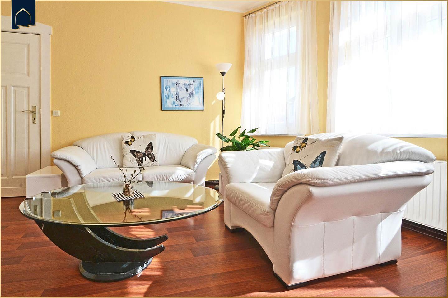 Die helle, modern eingerichtete Wohnung verfügt über ein separates Schlafzimmer mit gemütlichem Bett und viel Stauraum, sowie über ein Badezimmer mit Dusche, Waschbecken, WC und Haartrockner. Im Wohnzimmer erwartet Sie eine komfortable Sofaecke mit TV und Esstisch – ideal zum Entspannen oder für gemeinsame Mahlzeiten.