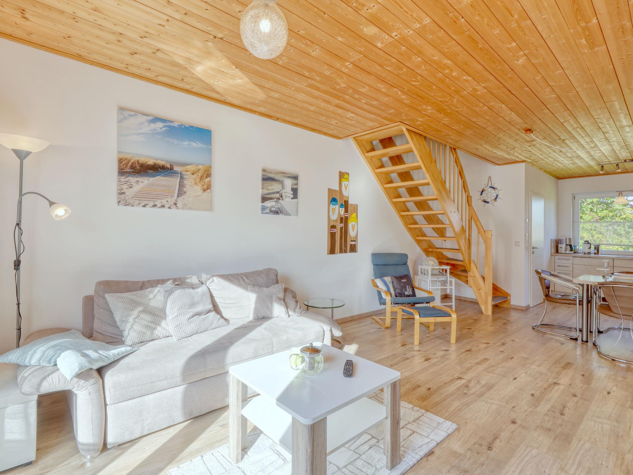 3-room semi-detached house 65 m2 on 2 levels. Bright, modern furnishings: living/dining room with dining table and satellite TV (flat screen), radio. Exit to the terrace. 1 room with sloping ceilings with 1 double bed and satellite TV. 1 room with sloping ceilings with 2 beds. Kitchenette (oven, dishwasher, 4 ceramic glass hob hotplates, kettle, microwave, electric coffee machine). Shower/WC, sep. WC. Gas heating, underfloor heating. Terrace. Terrace furniture, barbecue (portable). Facilities: washing machine, dryer, children's high chair, baby cot. Internet (WiFi, free). Please note: non-smoking house. Maximum 2 pets/ dogs allowed. Smoke alarm.