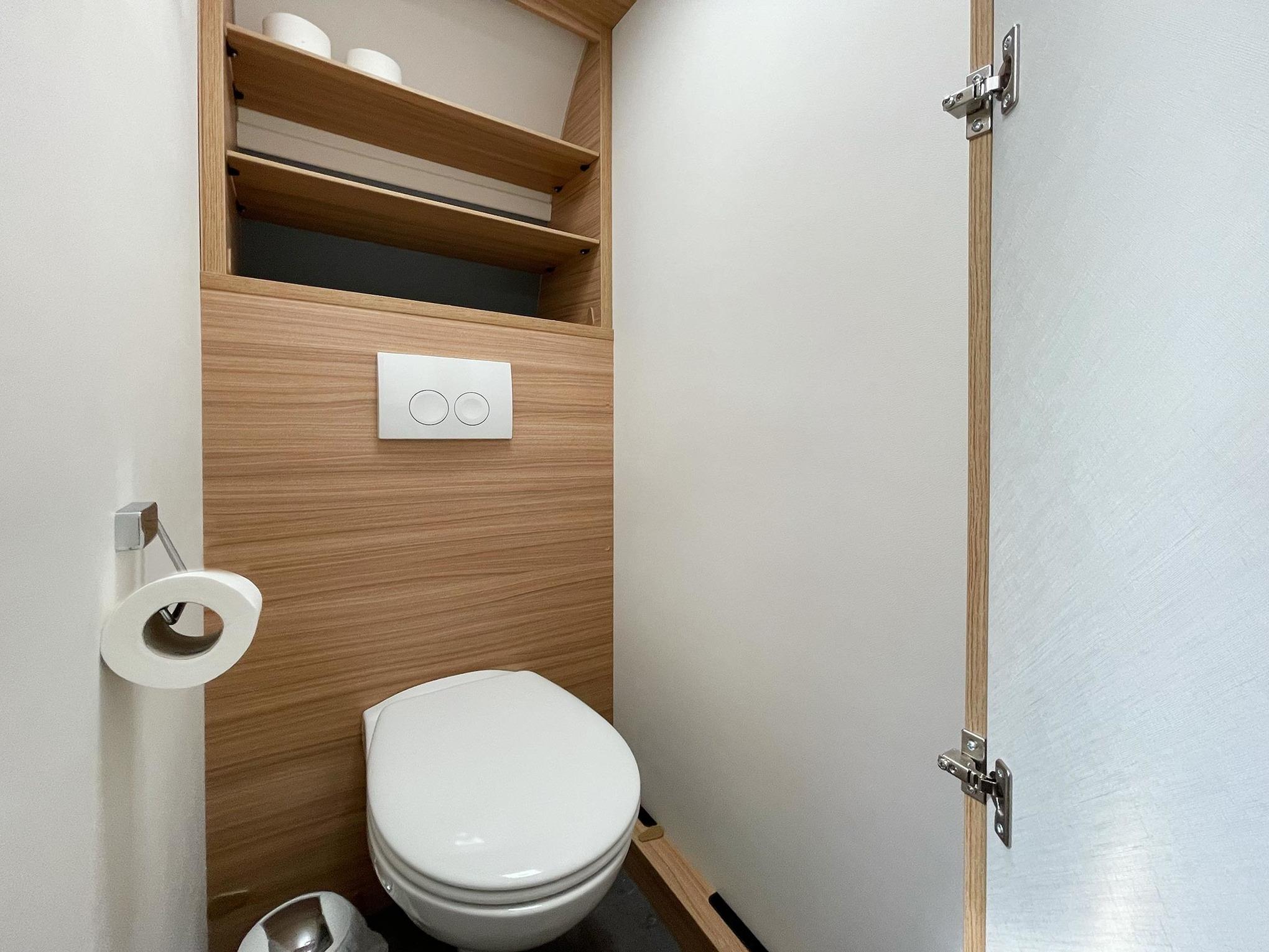 Im hinteren Teil des Wohnwagens befindet sich separat eine Toilette; ein Waschbecken steht im Schlafraum zur Verfügung. Des Weiteren befindet sich im mittleren Teil des Wohnwagens ein Tisch mit großzügiger Sofaecke und einem Fernseher, der auch zum Vorzelt hin schwenkbar ist und somit das Fußballspiel auch im Vorzelt genossen werden kann. Dank des durchdachten Designs bietet das Innere des Wohnwagens viel Stauraum.