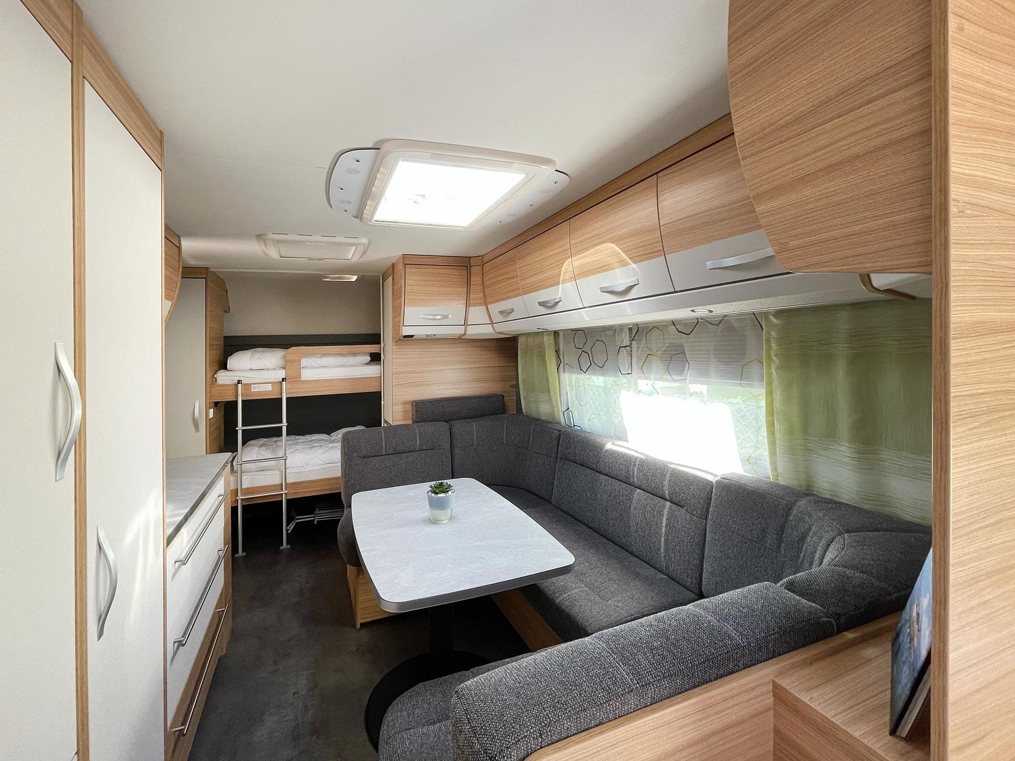 Als Schlafmöglichkeit dient ein großzügiges Ehebett und ein Doppelstockbett.