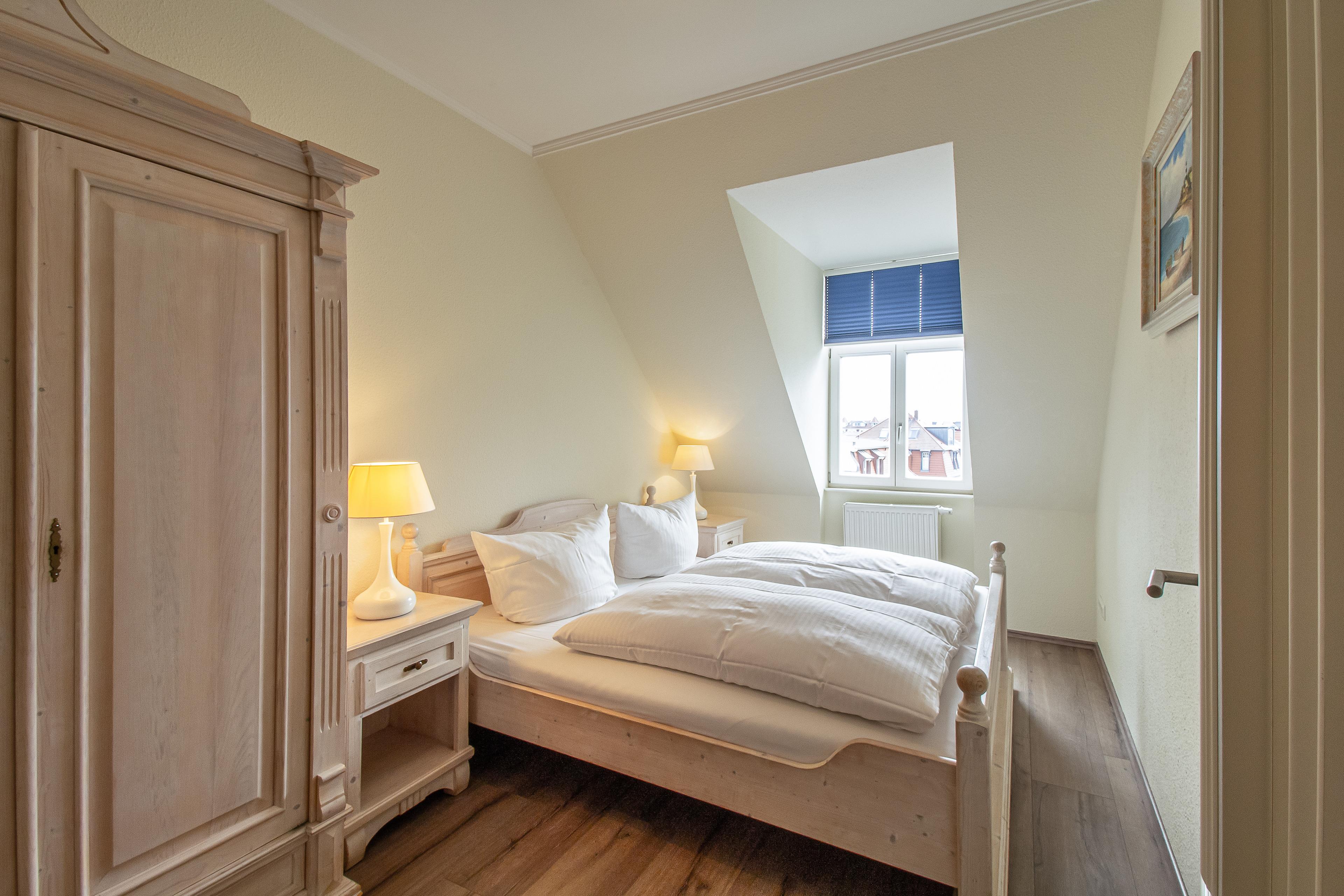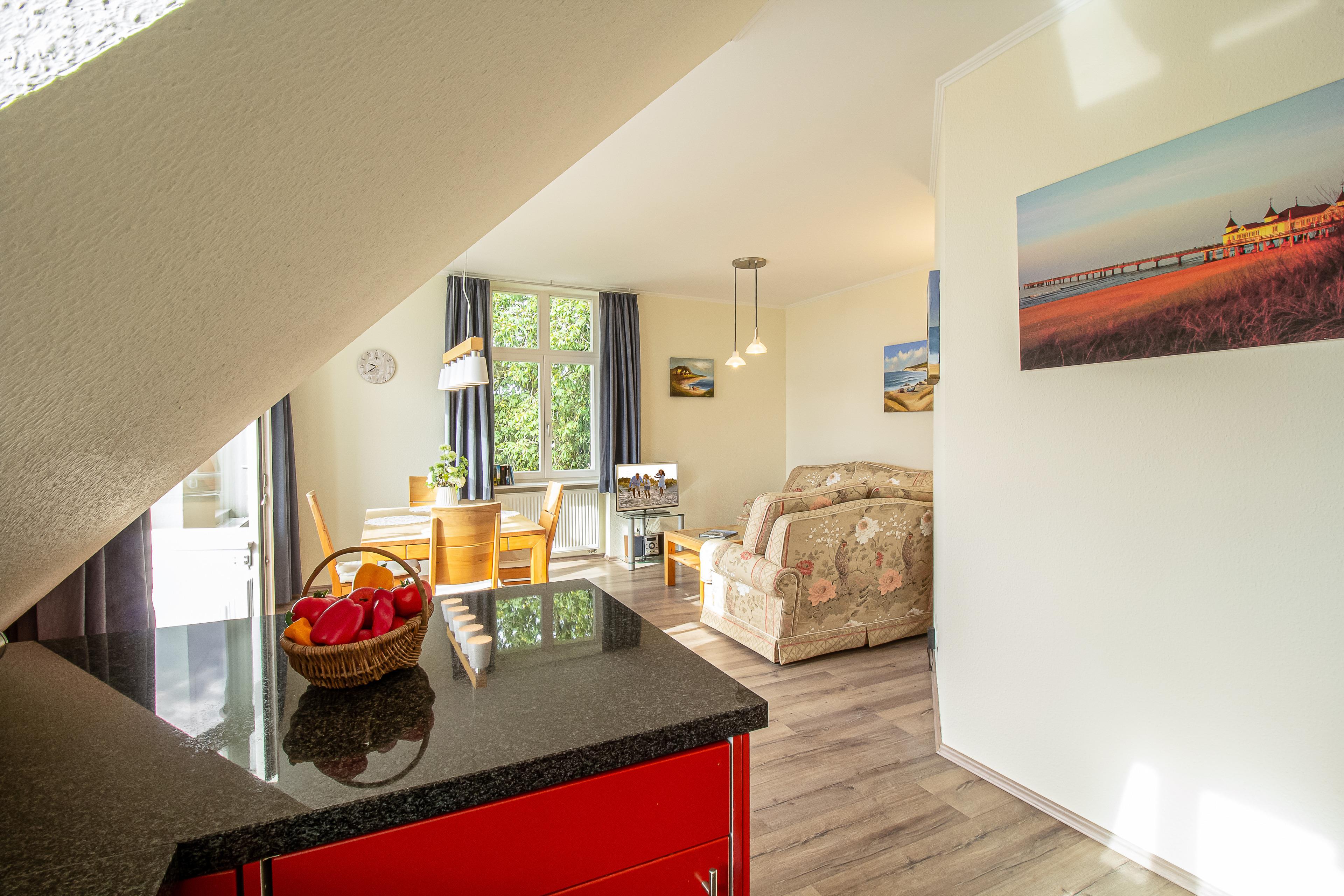 Die bezaubernde Wohnung erstreckt sich auf der dritten Etage in der Villa Frisia. Bereits beim Betreten des geräumigen Flurs wird man von einem Gefühl von Großzügigkeit und Offenheit begrüßt. Die Tür zum Wohnzimmer öffnet sich zu einem atemberaubenden Raum, der zum Verweilen einlädt. Zwei einladende Sofas schaffen eine gemütliche Atmosphäre, perfekt für entspannte Abende. Ein Fernseher bildet das Zentrum dieses Rückzugsortes der Behaglichkeit. Die nahtlose Verbindung zum offenen Küchenbereich ist ein Meisterwerk des modernen Designs. Die Küche selbst ist mit einer eindrucksvollen Palette von Annehmlichkeiten ausgestattet, darunter ein Geschirrspüler, ein elegantes Cerankochfeld und ein zuverlässiger Backofen. Ein wundervoller Esstisch, groß genug für vier Personen, fügt dem Raum eine gesellige Note hinzu, wo kulinarische Erlebnisse zu unvergesslichen Momenten werden. Der Blick aus den Fenstern der Wohnung ist schlichtweg sensationell und gewährt einen Panoramablick über die Dächer von Bansin. Dieses natürliche Gemälde kann in seiner vollen Pracht vom Balkon aus genossen werden. Ein großer Tisch mit vier bequemen Stühlen lädt dazu ein, die Aussicht zu bewundern und gleichzeitig die frische Luft zu genießen. Die Wohnung beherbergt zwei charmante Schlafzimmer. In einem der Schlafzimmer befindet sich ein großes Doppelbett mit getrennten Matratzen der Größe 90x200, das ultimativen Schlafkomfort verspricht. Im anderen Schlafzimmer warten zwei Einzelbetten derselben Größe (90x200), perfekt arrangiert für eine flexible Unterkunft. Ein Badezimmer, komplett ausgestattet mit einer erfrischenden Dusche, einem WC und einem stilvollen Waschbecken, vervollständigt die Annehmlichkeiten dieser Ferienwohnung. Zusätzlich ergänzt ein separates Gäste-WC das Angebot an Annehmlichkeiten. Mit ihrem beeindruckenden Raumangebot, der spektakulären Aussicht und den durchdachten Details verspricht sie einen unvergesslichen Aufenthalt inmitten der Schönheit von Bansin.