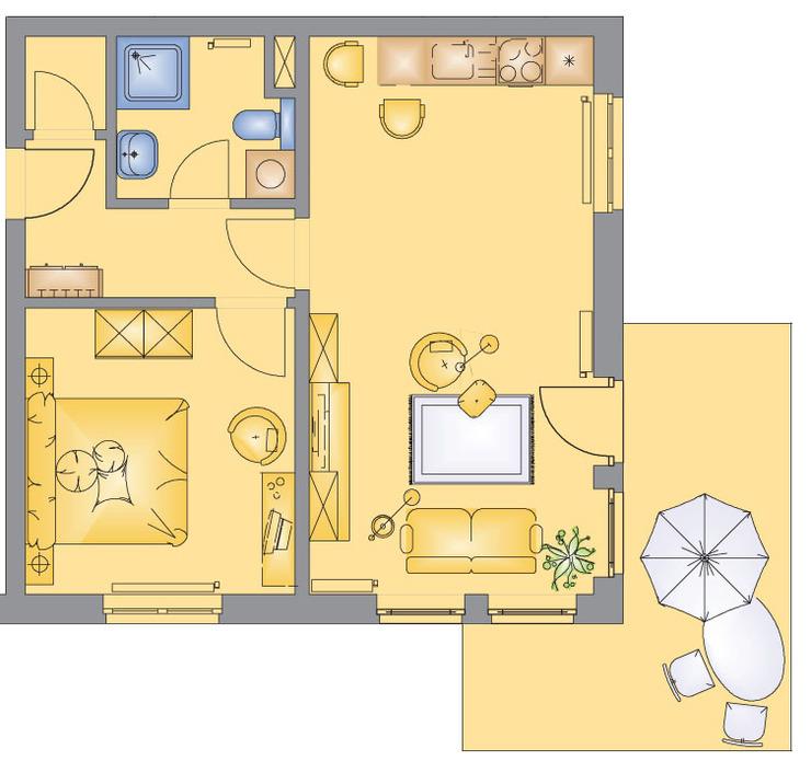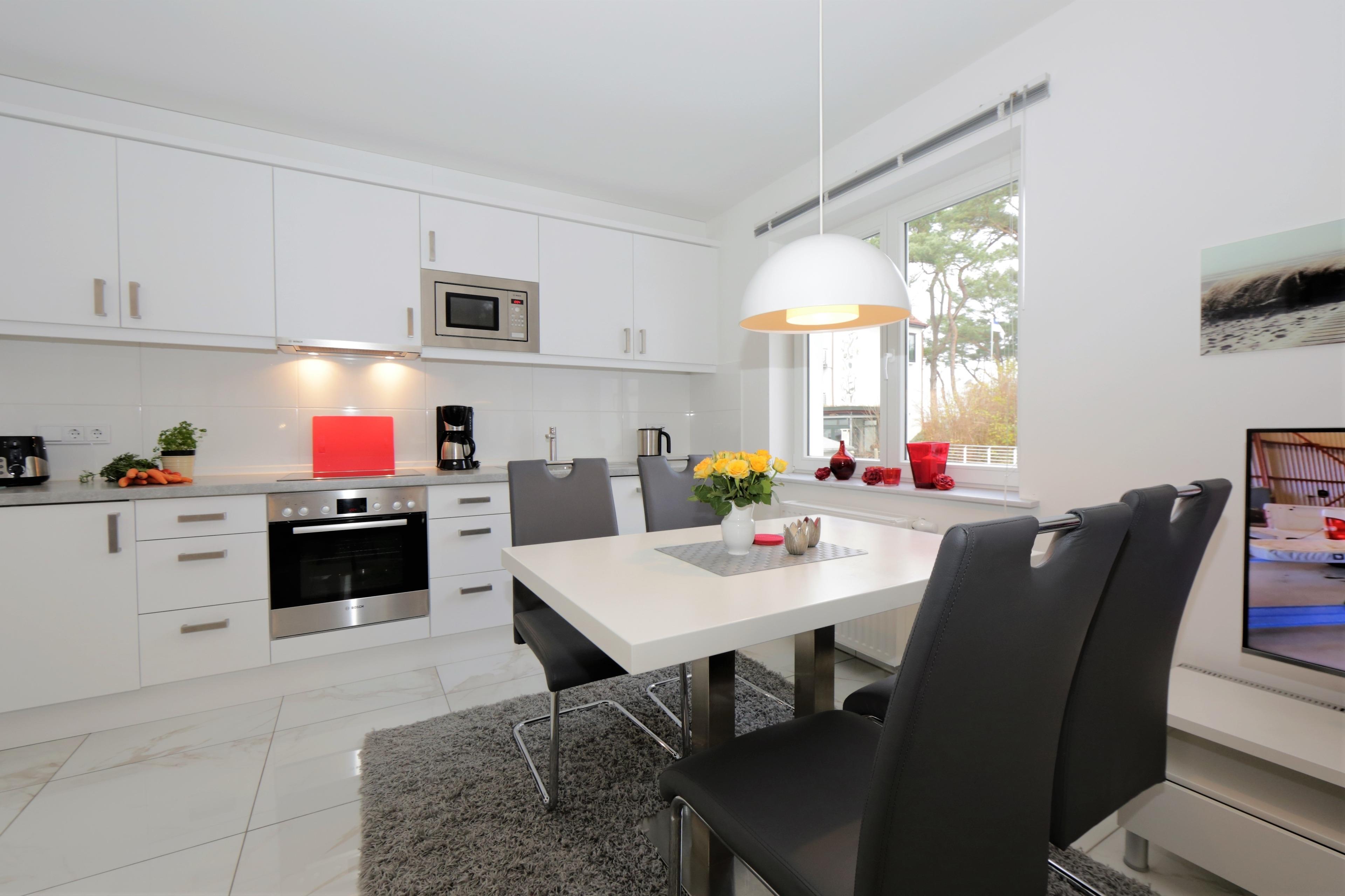 Diese gepflegte und modern eingerichtete 51 qm große 2-Zimmer-Wohnung ist ein beliebtes Feriendomizil für 2 Personen. Der mit reichlich Fenstern ausgestattete Wohnraum ist mit einer Wohnlandschaft und Relaxsessel eingerichtet. Flat TV ist selbstverständlich. Der östlich ausgerichtete möblierte Balkon greift um die Ecke, so dass die Gäste der Sonne folgen können. Auch der Essplatz und die moderne Küche mit Geschirrspüler, Kühlschrank, Backofen mit Ceranfeld, Mikrowelle etc. sind im Wohnraum integriert. Das Schlafzimmer ist mit einem modernen Doppelbett mit getrennten Matratzen (160 x 200) und reichlich Schrankraum eingerichtet. Eine ebenerdige Dusche sowie Waschbecken/WC finden sich im innenliegenden Bad. Ein Pkw-Außenstellplatz befindet sich auf dem Grundstück und ist der Wohnung zugeordnet. Ihre eigenen oder gemieteten Fahrräder können Sie in einem separaten Fahrradraum direkt im "Haus Nordic" geschützt unterbringen.