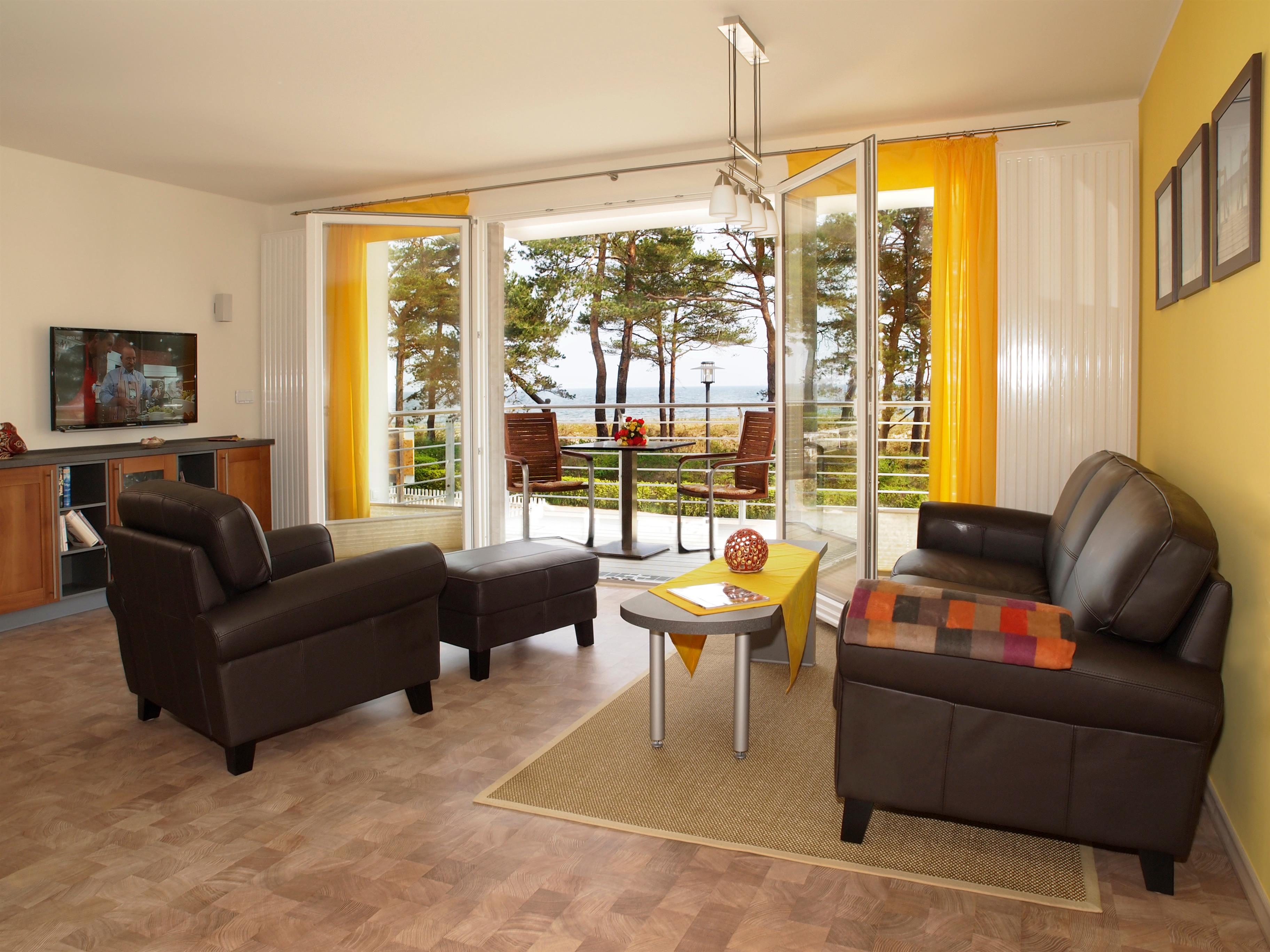 Dieses gemütlich eingerichtete 59 qm große Zwei-Zimmer-Appartement befindet sich im 2. Obergeschoss. Das helle Wohnzimmer mit großer Fensterfront zur Ostsee ist mit einer gemütlichen Couchecke mit Flat-TV sowie Radio eingerichtet. Der Essplatz und die offene Vollküche sind im Wohnraum integriert und mit Backofen/ Ceranfeld, Kühlschrank, Geschirrspüler, Mikrowelle p.p. ausgestattet. Der große zur Promenade ausgerichtete möblierte Balkon mit Meerblick ist vom Wohnraum begehbar. Das Schlafzimmer verfügt über ein Doppelbett und ausreichend Schrankraum. Das Badezimmer ist mit Dusche, Waschbecken und WC ausgestattet. Der Pkw-Stellplatz befindet sich auf dem Grundstück und ist der Wohnung zugeordnet. Fahrräder können im Fahrradkeller untergestellt werden.