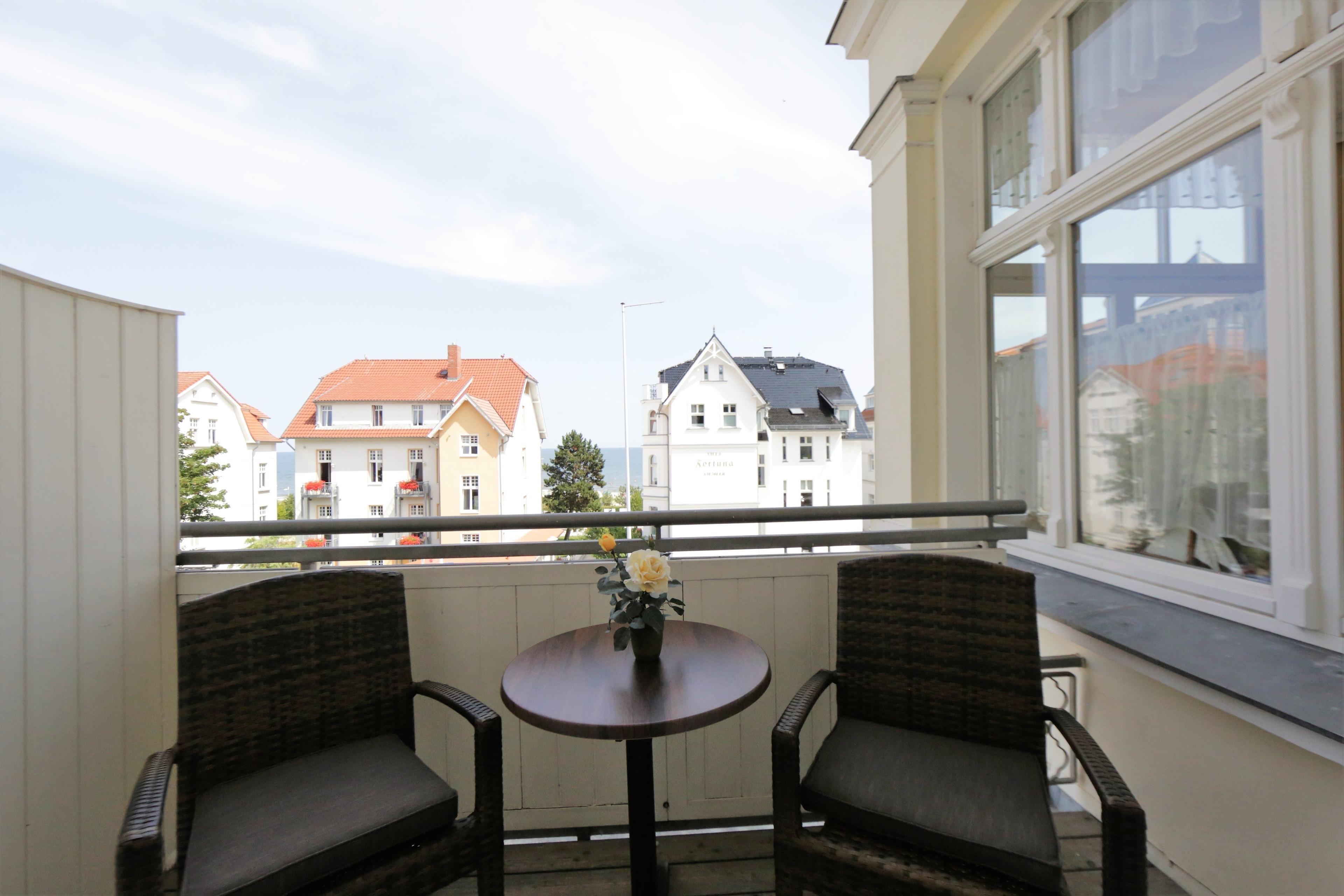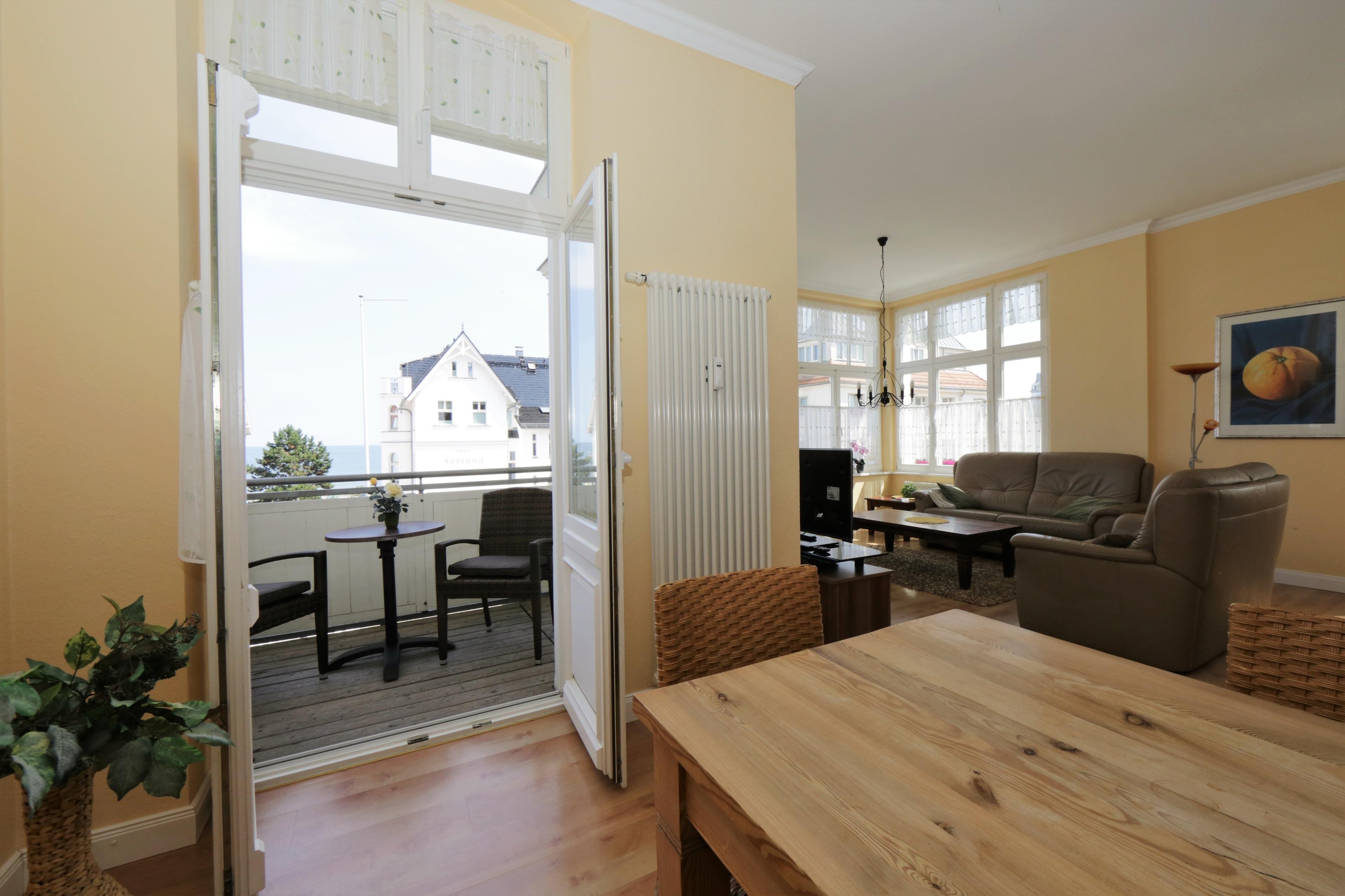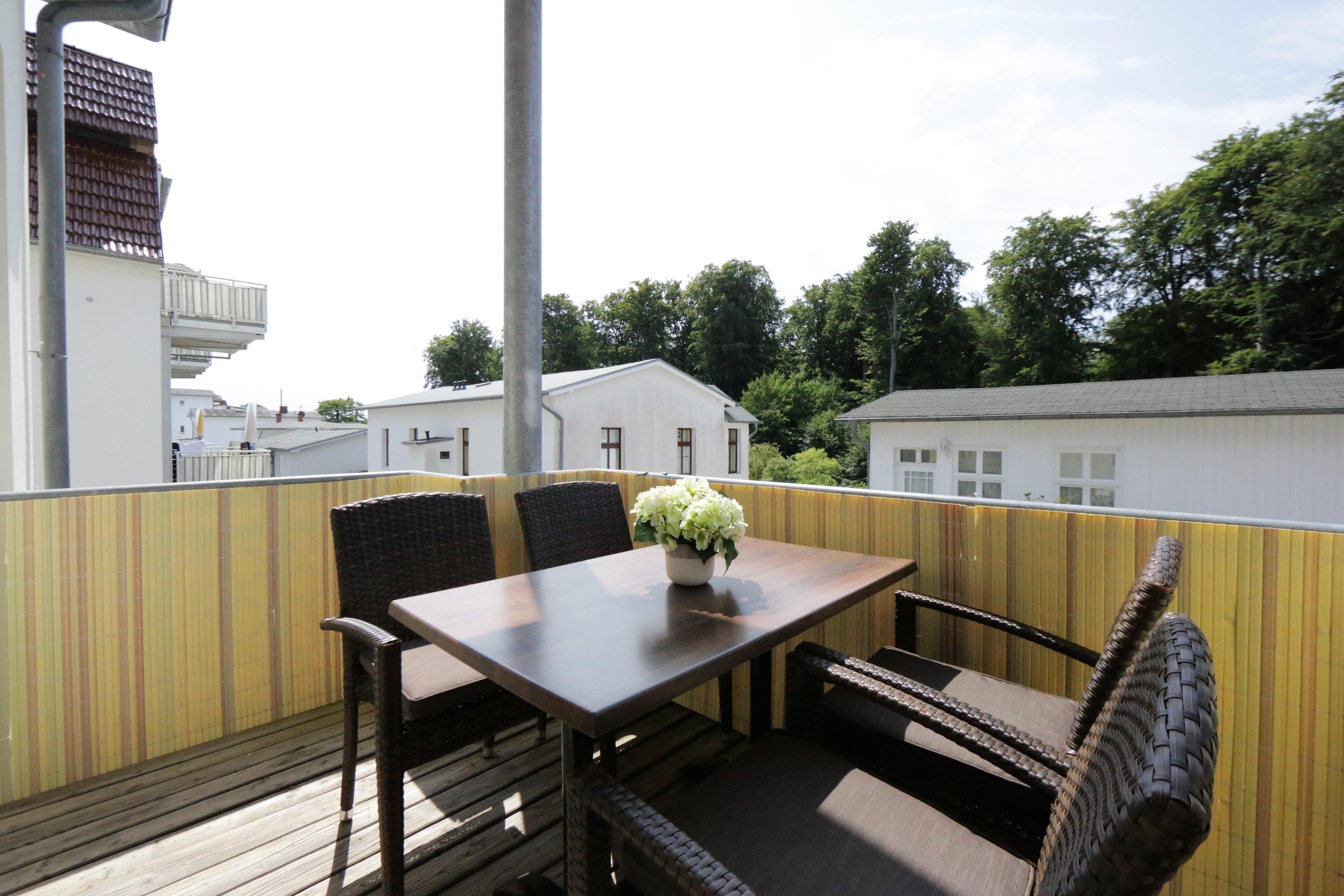 Dieses helle großzügige 90 qm große Appartement bietet 4 Personen reichlich Platz für einen erholsamen Urlaub am Meer. Der Wohnraum ist mit einer gemütlichen Sitzgarnitur, Couchtisch und Flat-TV sowie einem Essplatz eingerichtet. Von hier betreten Sie einen kleineren Balkon mit Ausrichtung zur Bergstraße und auf die Ostsee, die Sie zwischen den Häusern der ersten Reihe teilweise sehen können. Ebenfalls im Wohnraum offen integriert ist eine Vollküche incl. Geschirrspüler, Backofen, Mikrowelle, elektrischem Grill, Sandwichmaker etc., die auch mehreren Köchen gleichzeitig Platz bietet. Beide Schlafzimmer sind mit einem Doppelbett mit getrennten Matratzen 90 x 200 und Schrankraum ausgestattet. Das größere Schlafzimmer verfügt über ein Bad en suite mit Wanne und Waschbecken/WC. Von hier aus ist auch der größere Südbalkon erreichbar, der viel Sonne verspricht und die Gäste schon zum Frühstück ins Freie lockt. Zusätzlich steht den Gästen ein kleineres Bad mit Dusche und Waschbecken/WC zur Verfügung. Im Keller befinden sich Waschmaschine und Trockner. Der Pkw-Stellplatz befindet sich auf dem Grundstück direkt am Haus.