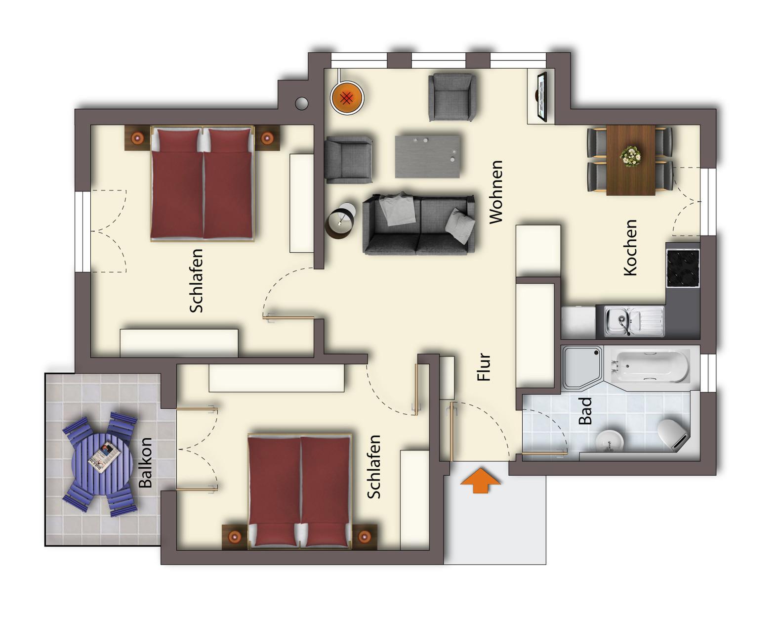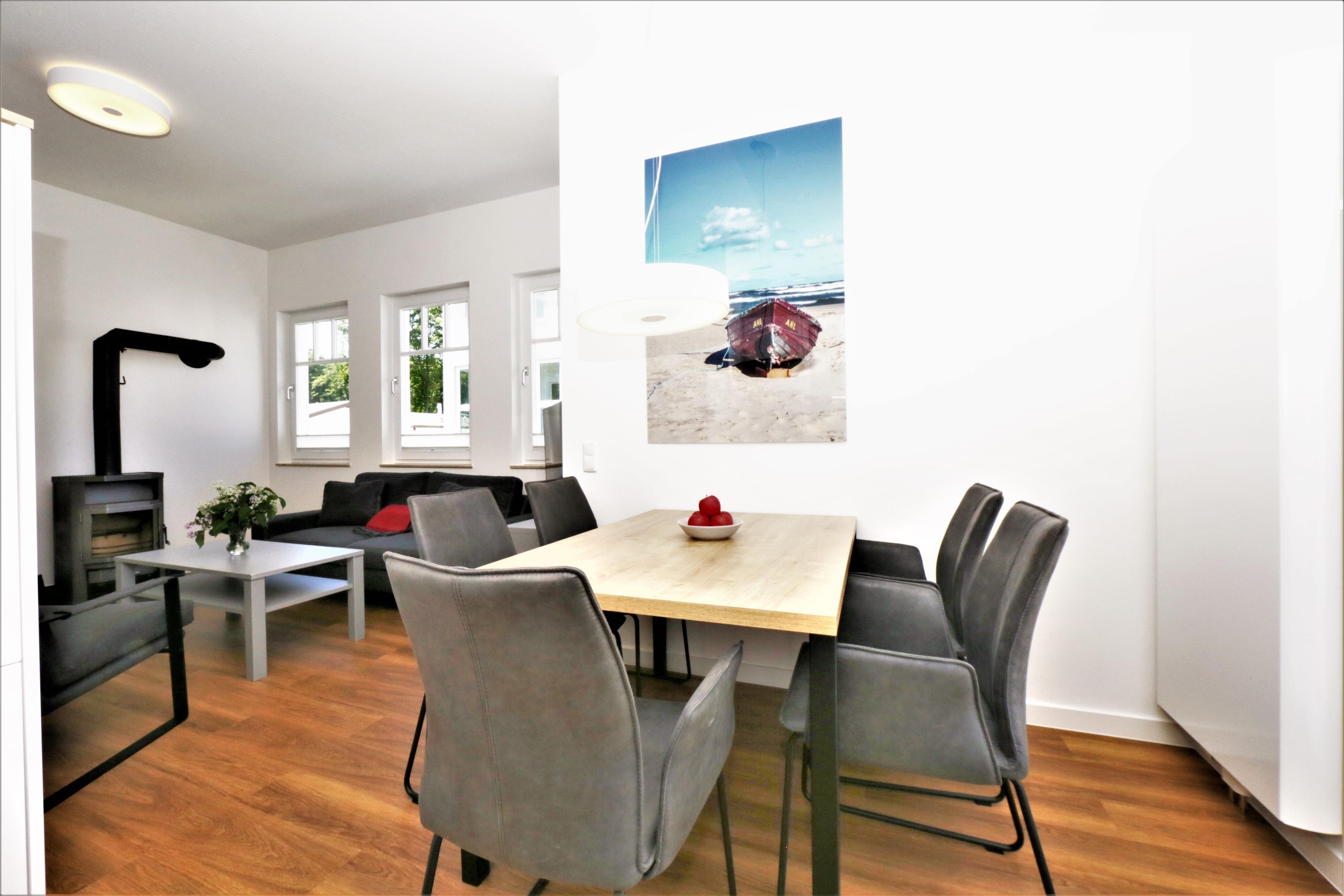 Dieses hochwertige, moderne 3-Zimmer Appartement ist 69 qm groß und befindet sich im 2. Obergeschoss. Die Wohnung mit 2 Schlafzimmern bietet 4 Personen reichlich Platz für einen erholsamen Urlaub am Meer. Im Wohnbereich erwartet Sie ein Kaminofen, eine bequeme Polstergarnitur mit Couchtisch und Flat TV. Der Essplatz am Fenster lädt zu gemeinsamen Mahlzeiten ein. Zum Frühstück begleitet Sie schon das Rauschen des Meeres. Die Küche mit Cerankochfeld, Backofen, Mikrowelle, Geschirrspülmaschine, Kühlschrank etc. ist ebenfalls offen im Wohnraum integriert. Von hier aus haben Sie zwischen den Häusern der ersten Reihe einen Blick auf den Strand und die Ostsee. Über eines der Schlafzimmer erreichen Sie den südlich ausgerichteten Balkon. Hier ist Sonne garantiert. Die Schlafzimmer verfügen jeweils über ein komfortables Doppelbett mit getrennten Matratzen (90 x 200), einen Kleiderschrank sowie Kofferablage. Eines der Schlafzimmer ist mit einem zusätzlichen TV ausgestattet. Das Badezimmer mit Fenster ist mit Badewanne, Dusche und Waschtisch/WC ausgestattet. Ein Pkw-Stellplatz, der der Wohnung zugeordnet ist, steht den Gästen vor dem Haus zur Verfügung. Der Fahrradraum als auch Waschmaschine und Trockner im Keller kann von den Gästen genutzt werden.