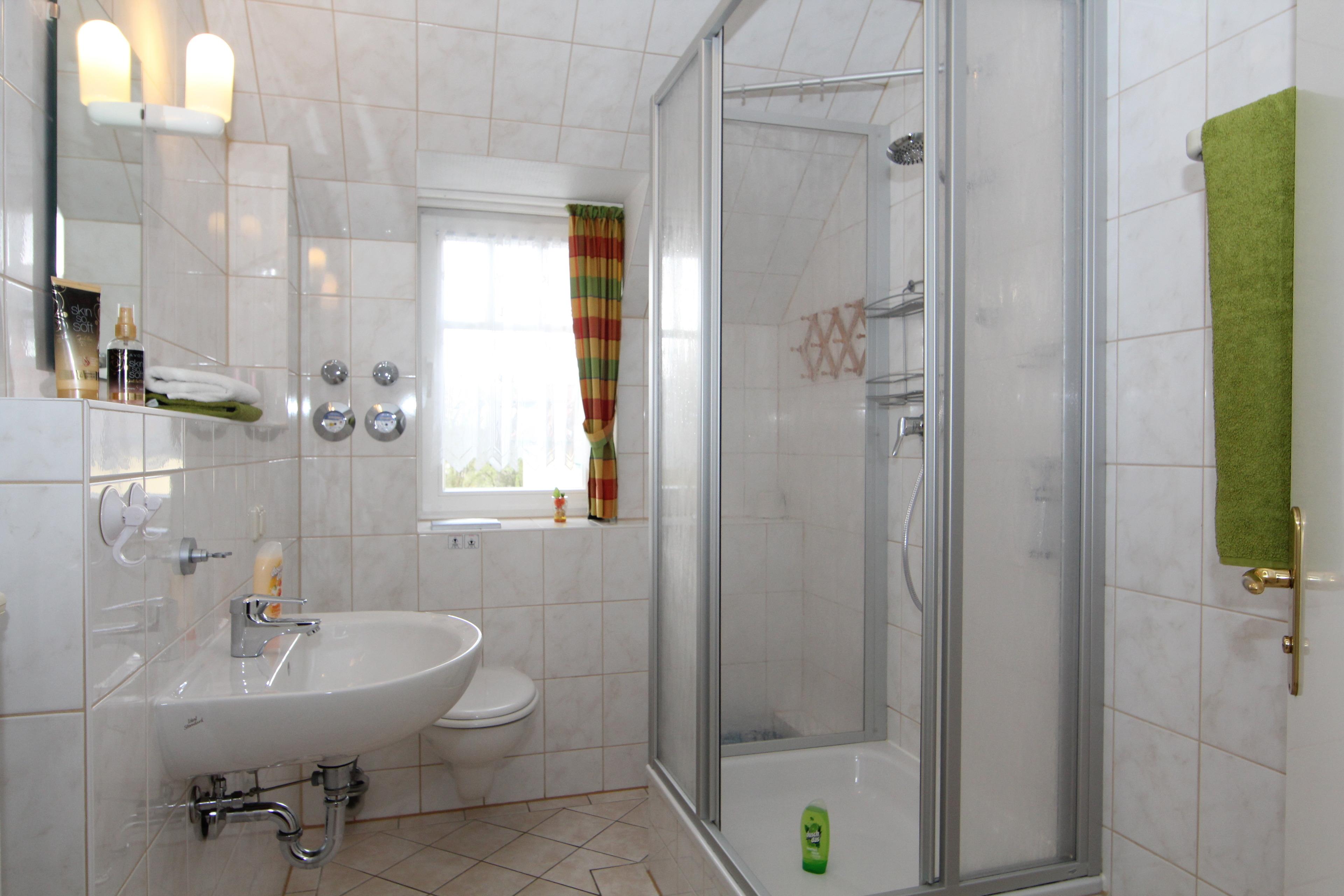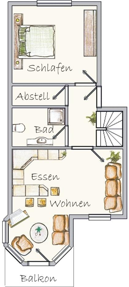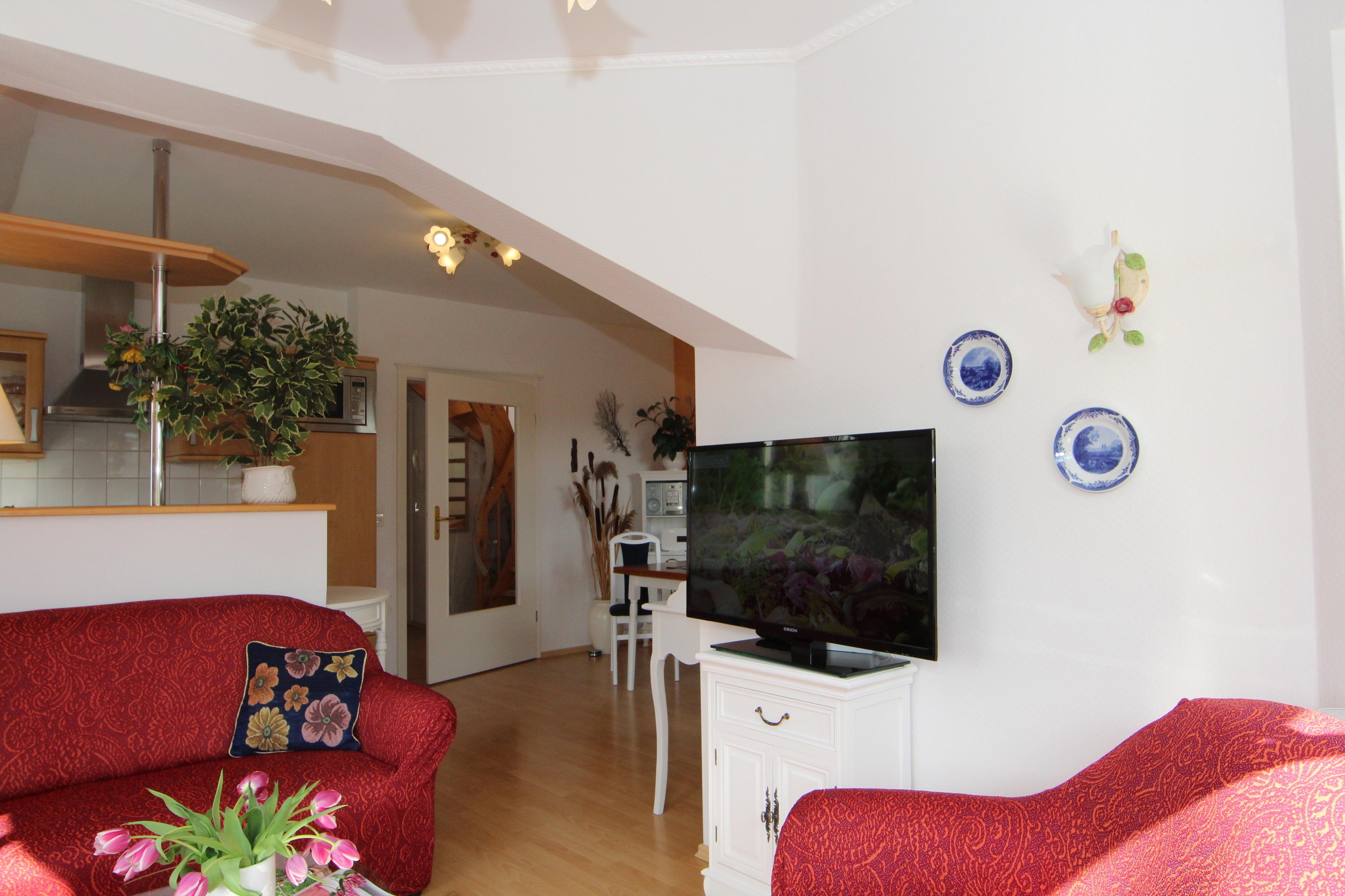 Diese herrlich sonnige Maisonettwohnung bietet mit Ihren 78 qm 2 – 4 Personen allen Komfort für einen erholsamen Ferienaufenthalt. Im unteren Bereich befindet sich ein großzügiger heller Wohnbereich. Die gemütliche Couchecke steht vor den süd-östlich ausgerichteten Fenstern. TV und Radio sind selbstverständlich. Von hier aus finden die Gäste auch Zugang zu dem ruhigen Balkon, der ins Grüne schaut und erholsame Sonnenstunden verspricht. Der Essplatz für 4 Personen sowie eine Vollküche incl. Kühlschrank, Geschirrspüler, Backofen mit Ceranfeld, Mikrowelle etc. sind ebenfalls im Wohnbereich integriert. Essplatz und Küche gestatten auch wieder einen Blick nach draußen. Das großzügige Schlafzimmer ist mit einem Doppelbett mit getrennten Matratzen (90 x 200) und ausreichend Schrankraum eingerichtet. Das Duschbad mit Waschbecken/WC befindet sich ebenfalls auf der unteren Ebene. Eine komfortable Treppe aus dem Flur führt in das Penthouse im oberen Bereich, der als Wohn-/Schlafbereich dient und einen Rundumblick erlaubt. Eine Couchgarnitur mit einem zweiten TV sowie Radio lädt zum Entspannen oder Zurückziehen ein. Der helle schöne Raum eignet sich hervorragend zum Lesen. Die Couch sowie eine Einzelliege können zum Schlafen genutzt werden. Ein PKW-Stellplatz sowie ein Fahrradschuppen befinden sich direkt vor der Haustür.