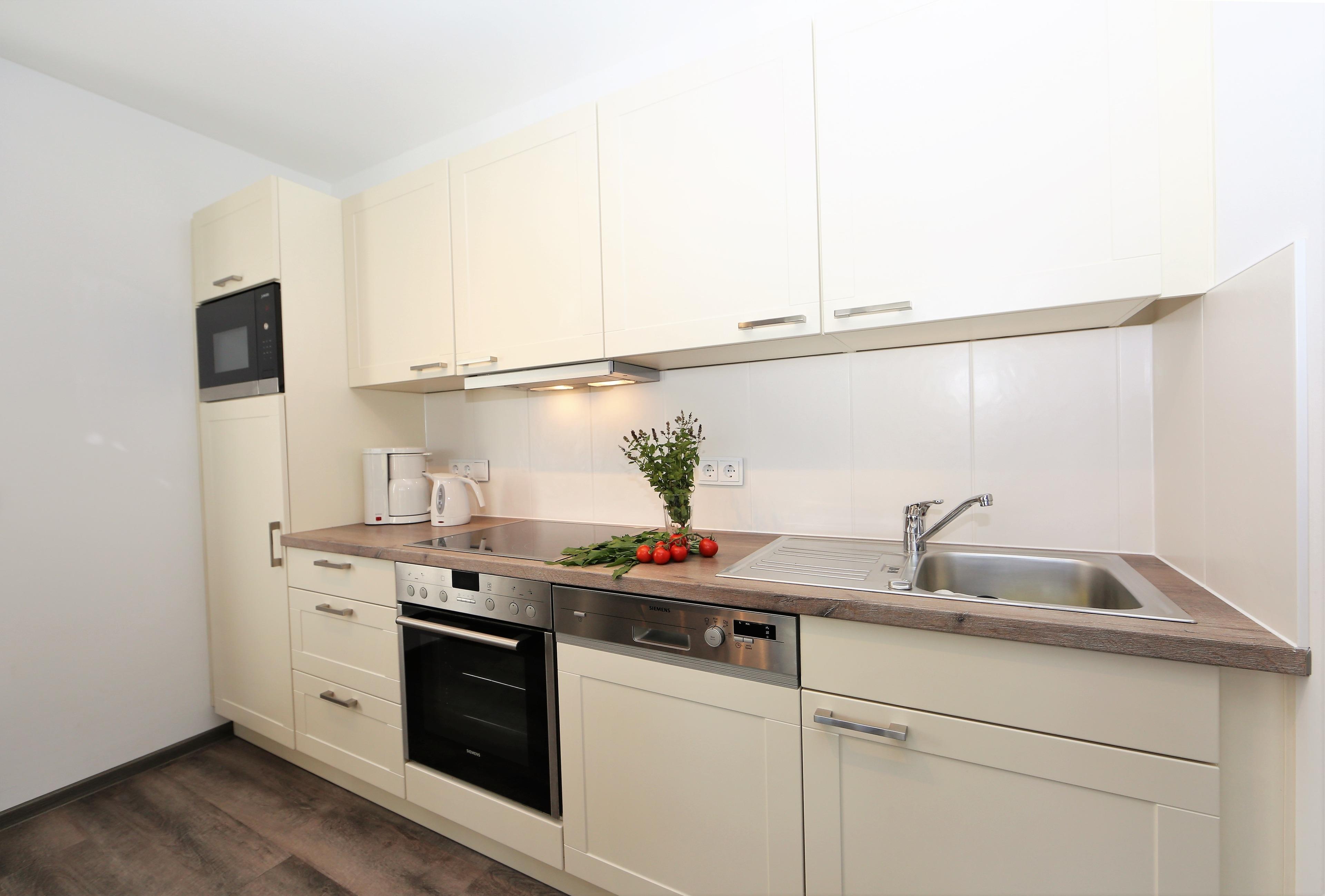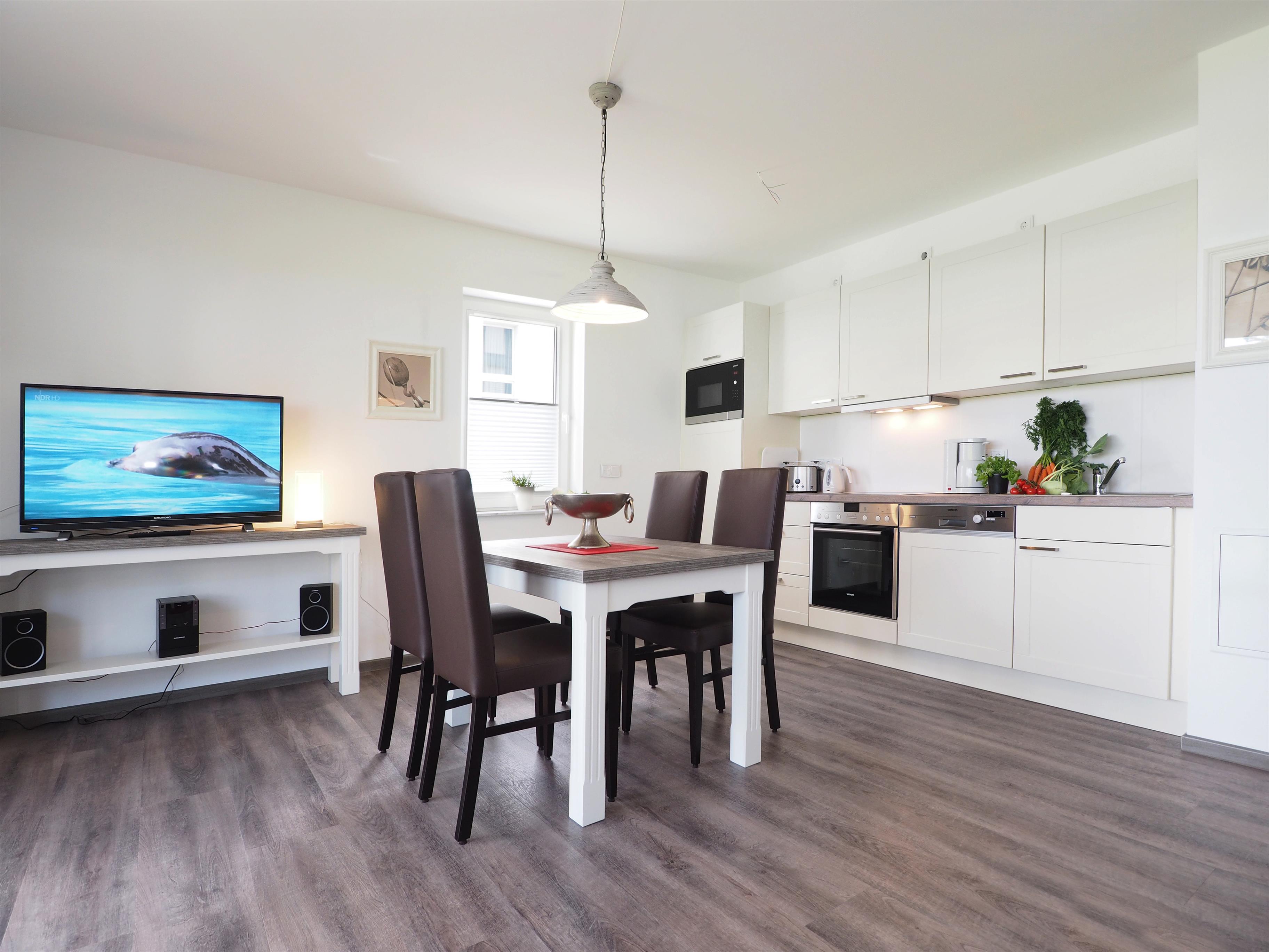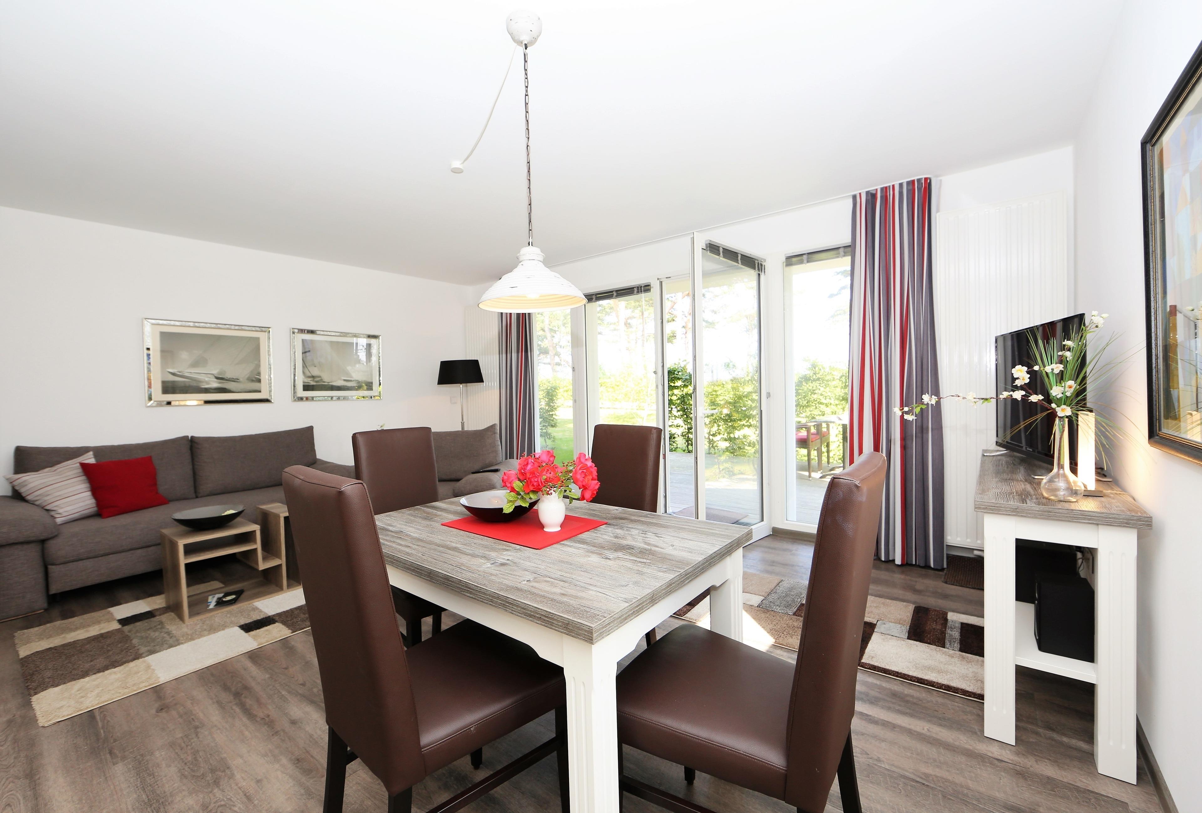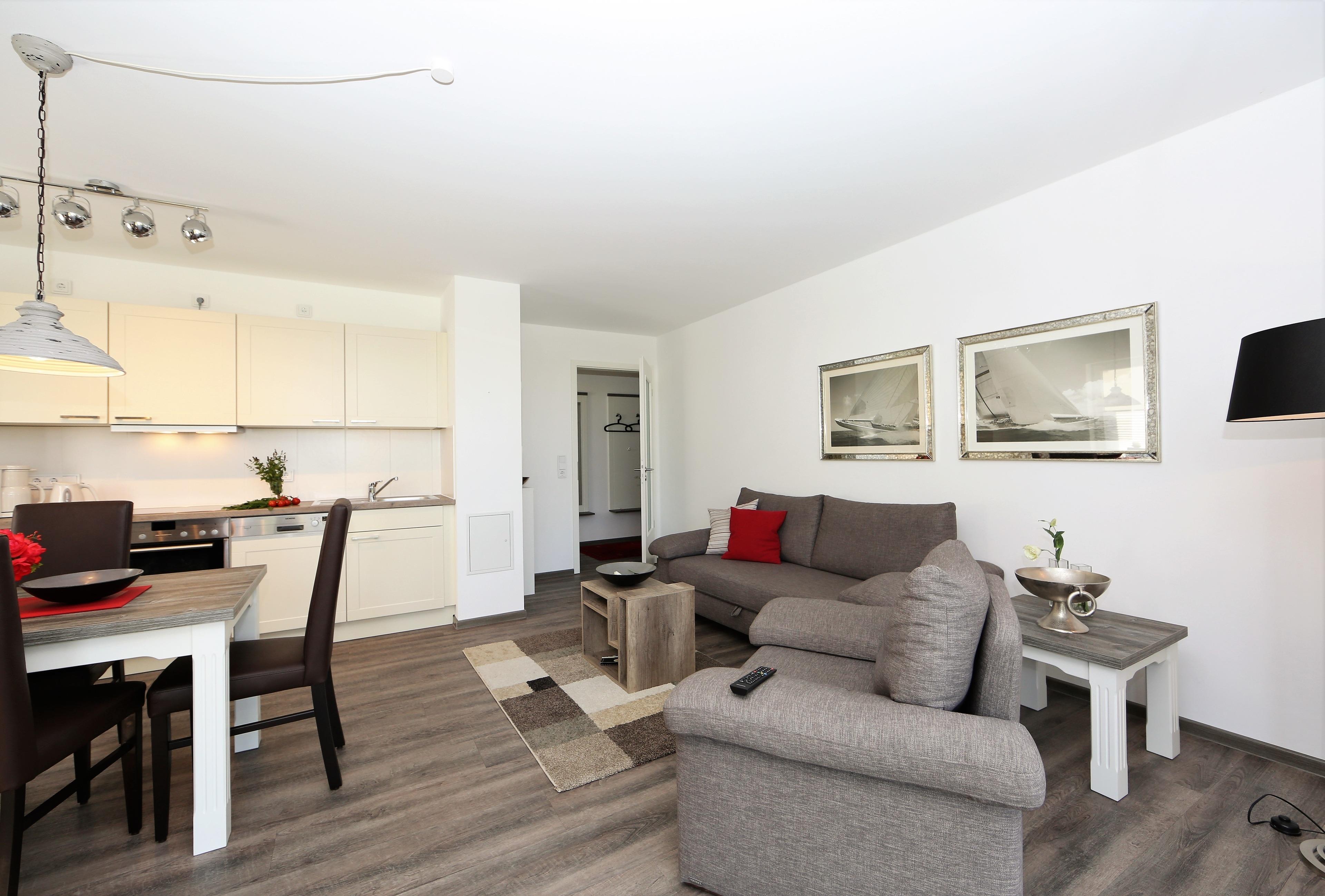 Diese modern eingerichtete 59 qm große Zwei-Zimmer-Terrassenwohnung befindet sich im Promenadengeschoss. Das helle Wohnzimmer mit großer Fensterfront ist mit einem Esstisch, der 4 Personen Platz bietet und einer gemütlichen Couchecke eingerichtet. Flat-TV sowie Radio/CD sind selbstverständlich. Die offene Vollküche ist im Wohnraum integriert und mit Backofen/ Ceranfeld, Kühlschrank, Geschirrspüler, Mikrowelle p.p. ausgestattet. Die große zur Promenade ausgerichtete möblierte Terrasse ist vom Wohnraum begehbar. Das Schlafzimmer verfügt über ein Doppelbett mit getrennten Matratzen und ausreichend Schrankraum. Das Badezimmer ist mit einer ebenerdigen Dusche, Waschbecken und WC ausgestattet. Der Pkw-Stellplatz befindet sich auf dem Grundstück und ist der Wohnung zugeordnet. Fahrräder können im Fahrradkeller untergestellt werden.