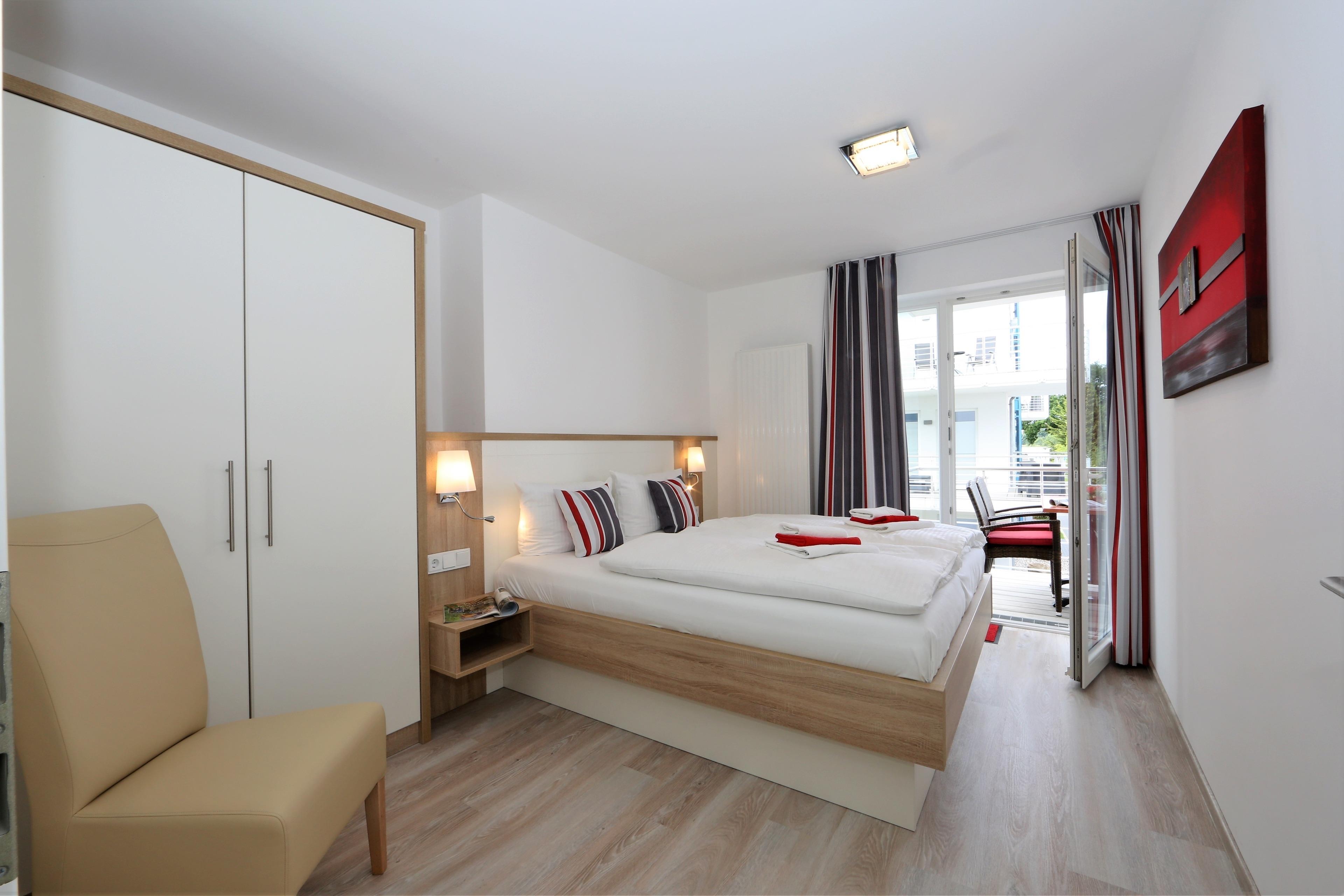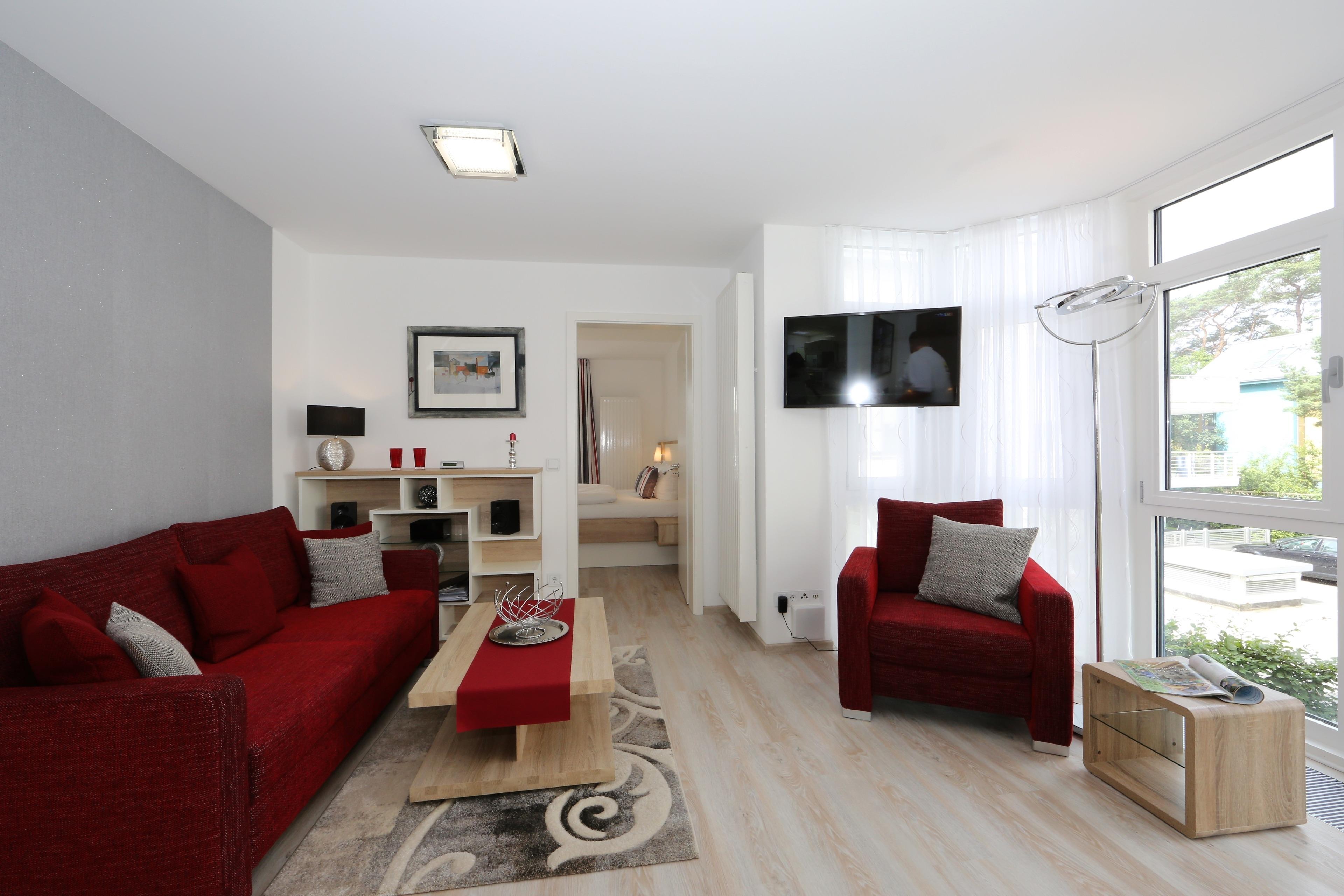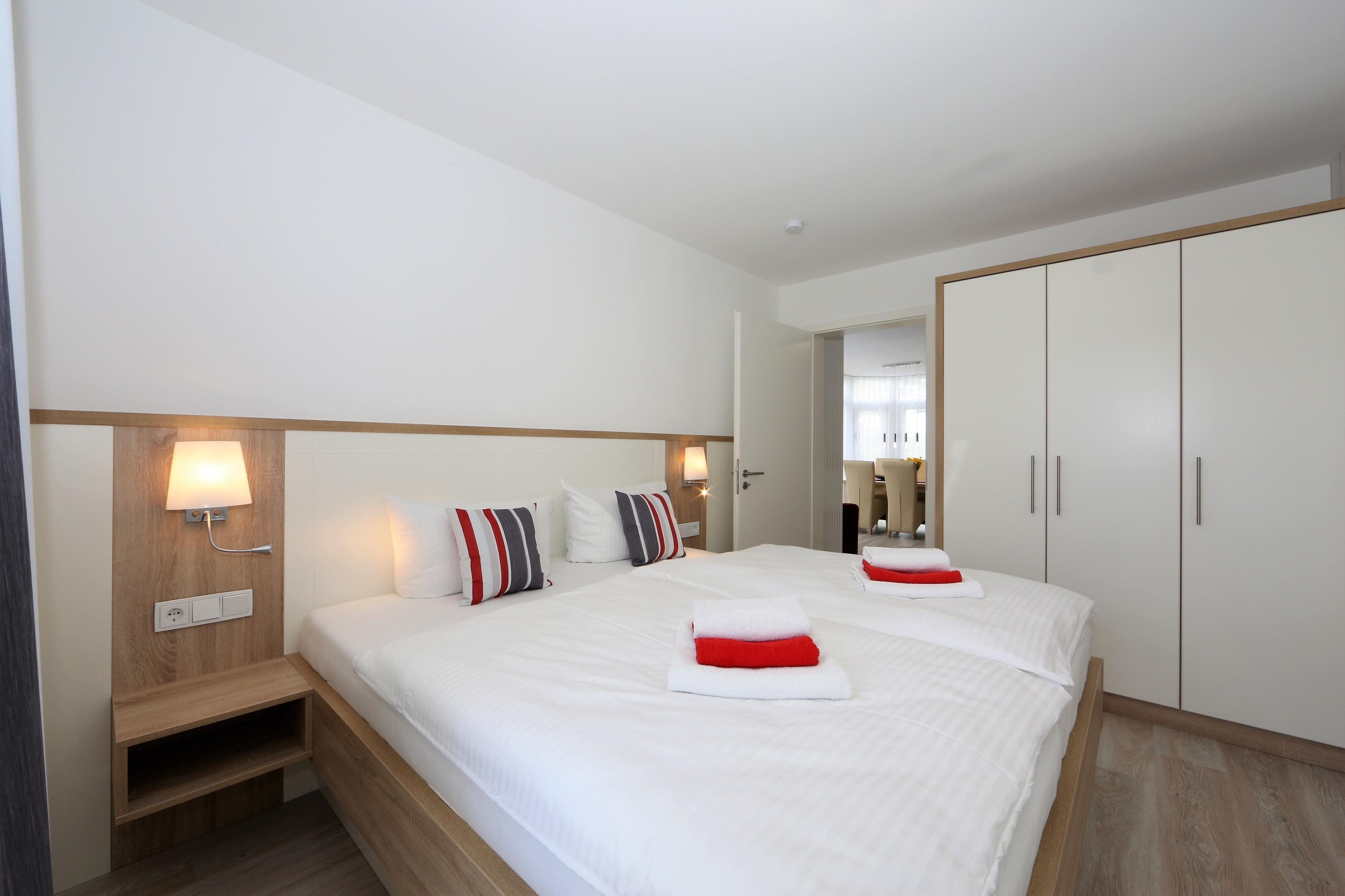 Dieses modern und hochwertig eingerichtete 66 qm große Drei-Zimmer Appartement befindet sich im 1. Obergeschoss mit Ausrichtung zum Südwesten. Das helle Wohnzimmer, mit großer Fensterfront, ist mit einem Esstisch, der bis zu 4 Personen Platz bietet und einer gemütlichen Couchecke eingerichtet. Flat-TV sowie Radio/CD sind selbstverständlich. Die offene Vollküche ist im Wohnraum integriert und mit Backofen/ Ceranfeld, Kühlschrank, Geschirrspüler, Mikrowelle pp. ausgestattet. Der große, zum Süden ausgerichtete, möblierte Balkon ist von beiden Schlafzimmern begehbar und verspricht den ganzen Tag Sonne. Die Schlafzimmer sind mit jeweils einem Doppelbett mit getrennten Matratzen (80 bzw. 90 x 200) und ausreichend Schrankraum eingerichtet. Das Badezimmer ist mit einer ebenerdigen Dusche, Waschbecken und WC ausgestattet. Eine zusätzliche Gästetoilette steht zur Verfügung. Der Pkw-Stellplatz befindet sich auf dem Grundstück in der Tiefgarage und ist der Wohnung zugeordnet. Fahrräder können im Fahrradkeller untergestellt werden.