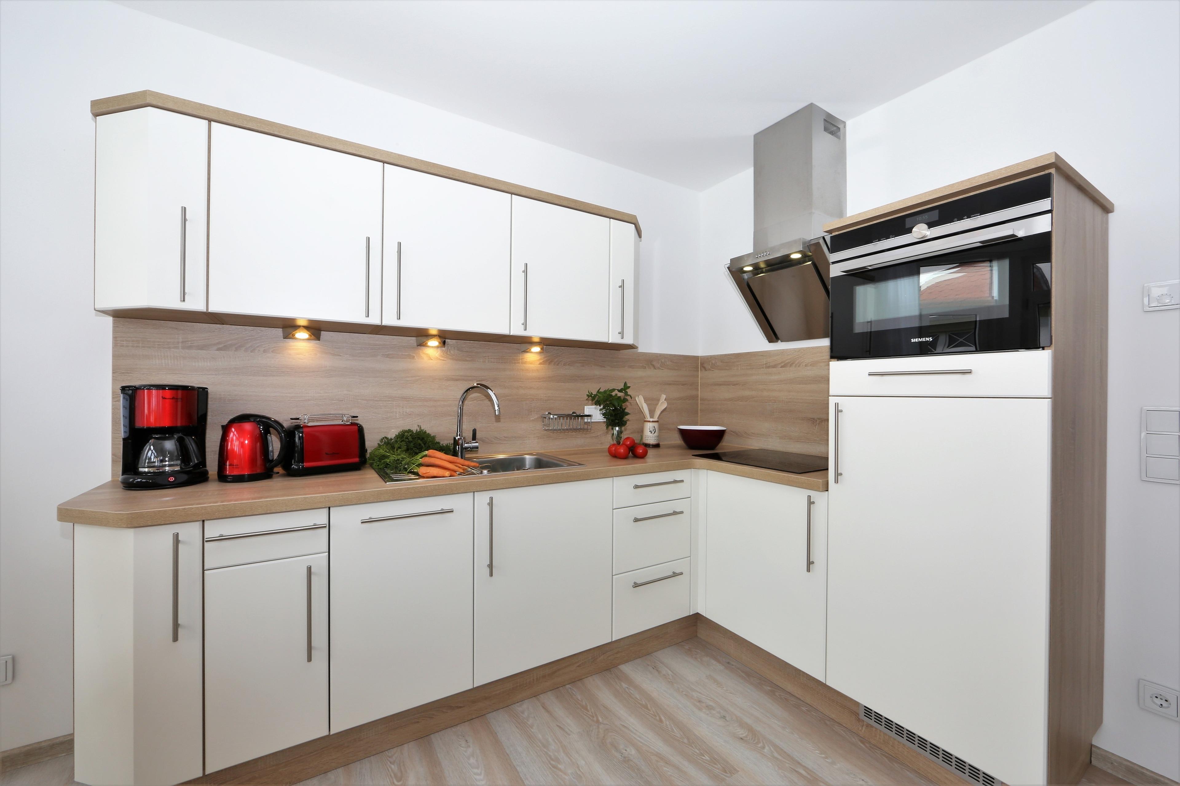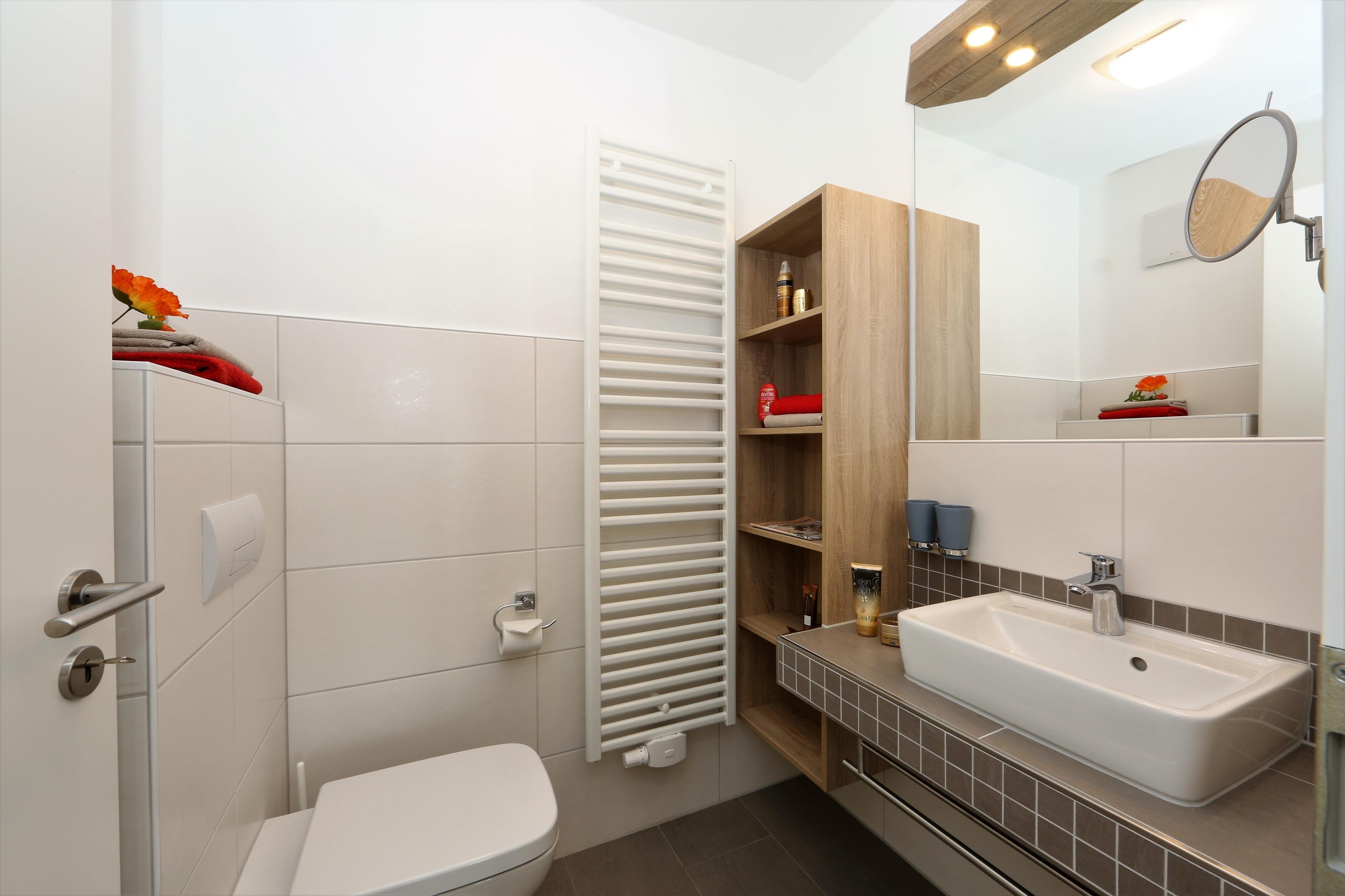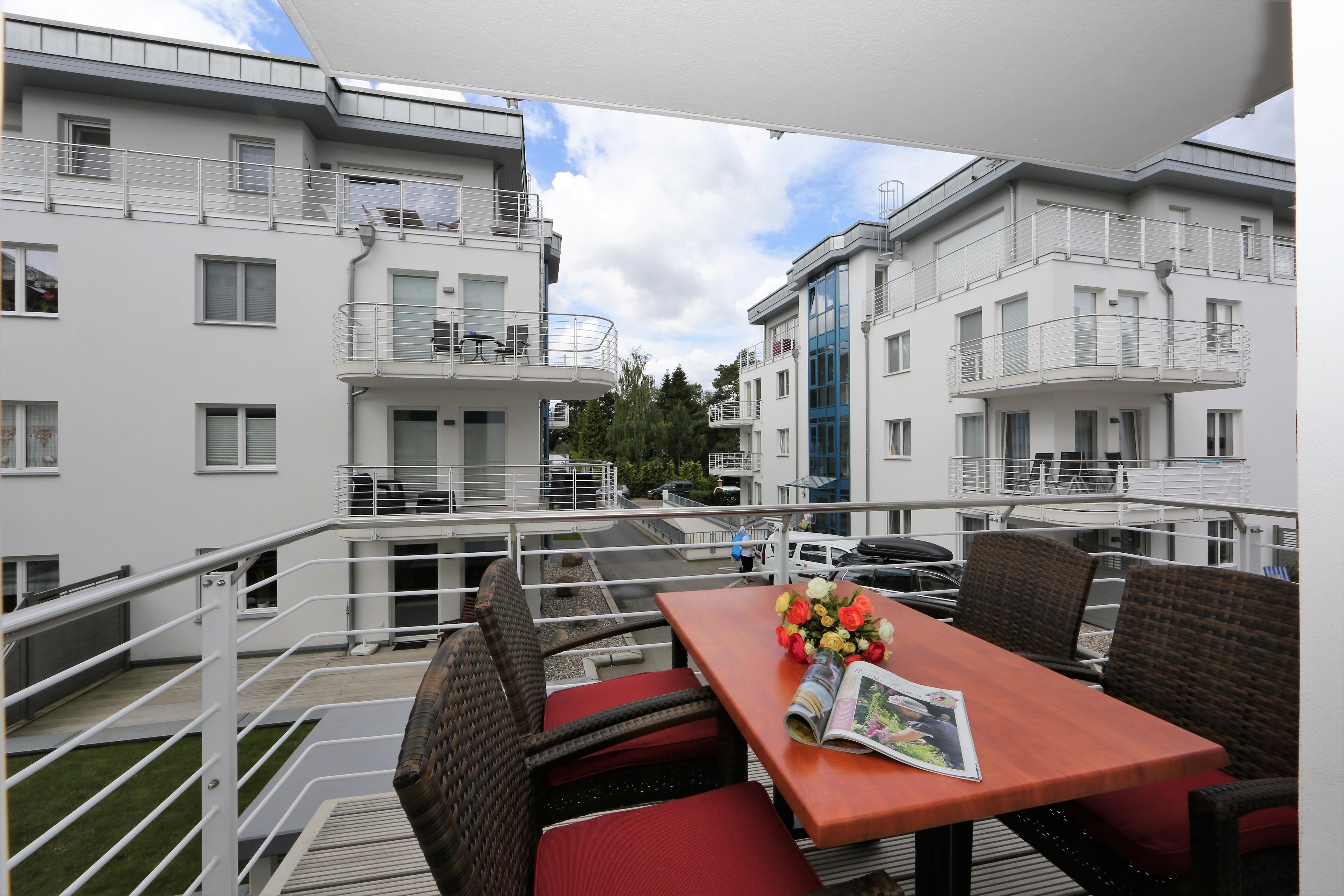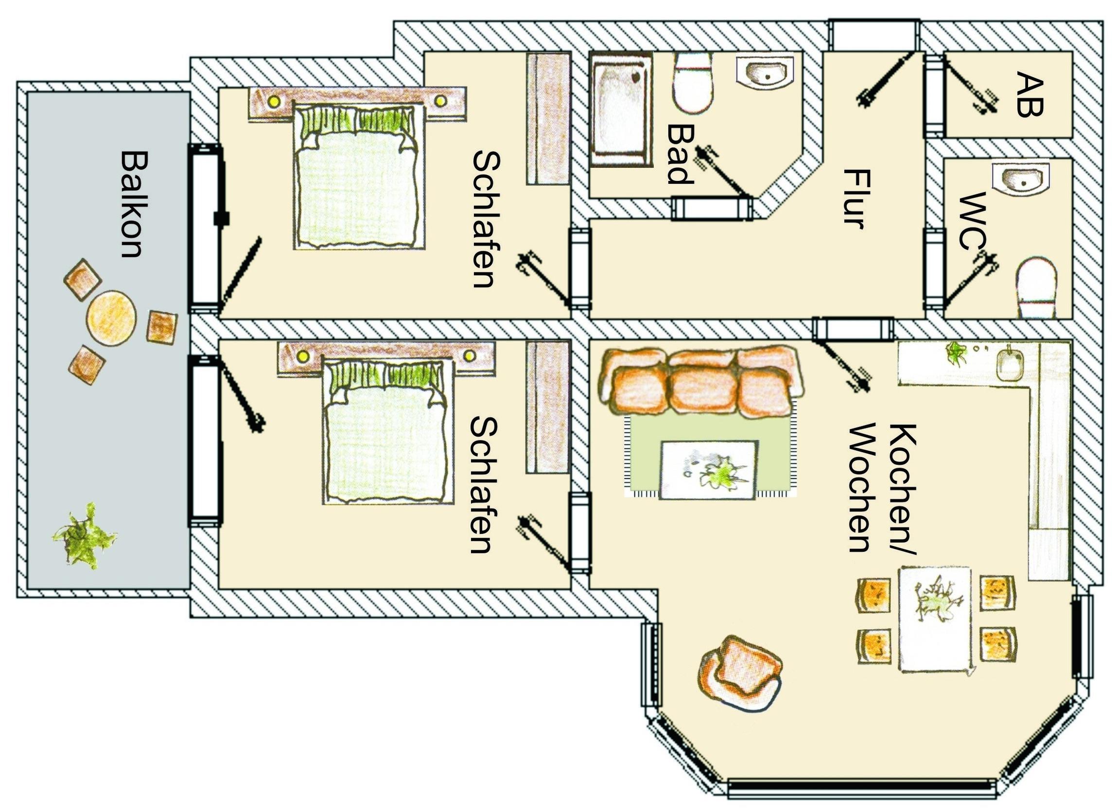 Dieses modern und hochwertig eingerichtete 66 qm große Drei-Zimmer Appartement befindet sich im 1. Obergeschoss mit Ausrichtung zum Südwesten. Das helle Wohnzimmer, mit großer Fensterfront, ist mit einem Esstisch, der bis zu 4 Personen Platz bietet und einer gemütlichen Couchecke eingerichtet. Flat-TV sowie Radio/CD sind selbstverständlich. Die offene Vollküche ist im Wohnraum integriert und mit Backofen/ Ceranfeld, Kühlschrank, Geschirrspüler, Mikrowelle pp. ausgestattet. Der große, zum Süden ausgerichtete, möblierte Balkon ist von beiden Schlafzimmern begehbar und verspricht den ganzen Tag Sonne. Die Schlafzimmer sind mit jeweils einem Doppelbett mit getrennten Matratzen (80 bzw. 90 x 200) und ausreichend Schrankraum eingerichtet. Das Badezimmer ist mit einer ebenerdigen Dusche, Waschbecken und WC ausgestattet. Eine zusätzliche Gästetoilette steht zur Verfügung. Der Pkw-Stellplatz befindet sich auf dem Grundstück in der Tiefgarage und ist der Wohnung zugeordnet. Fahrräder können im Fahrradkeller untergestellt werden.