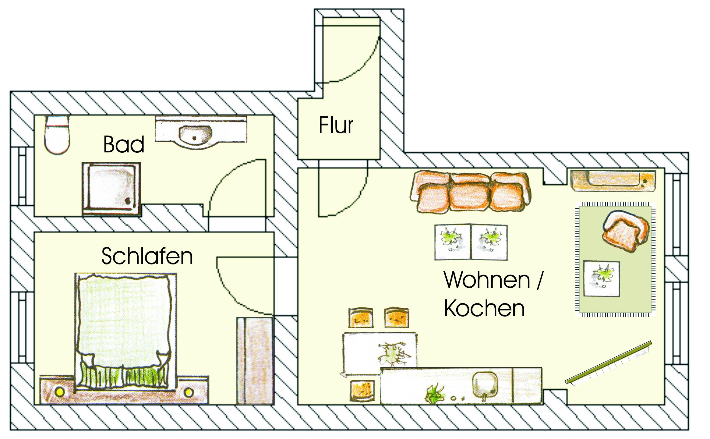 Dieses 43 qm große 2-Zimmer Appartement befindet sich im 1. Obergeschoss und ist für max. 3 Personen geeignet. Der Wohnbereich ist mit einer gemütlichen Couch mit Schlaffunktion (Liegefläche 135 x 200), Couchtisch einem separaten Sessel, der zum Lesen einlädt und großem Flat TV eingerichtet. Die Küchenzeile incl. Ceranfeld, Backofen, Kühlschrank, Geschirrspüler etc. und ein angrenzender Sitzplatz sind offen im Wohnbereich integriert. Das helle Schlafzimmer ist mit einem Doppelbett mit durchgehender Matratze (180x200) und einem Kleiderschrank eingerichtet. Das Badezimmer mit Fenster ist mit Echtglasdusche und Waschtisch/WC ausgestattet. Ihren Pkw sowie Fahrräder können die Gäste auf dem Grundstück abstellen.