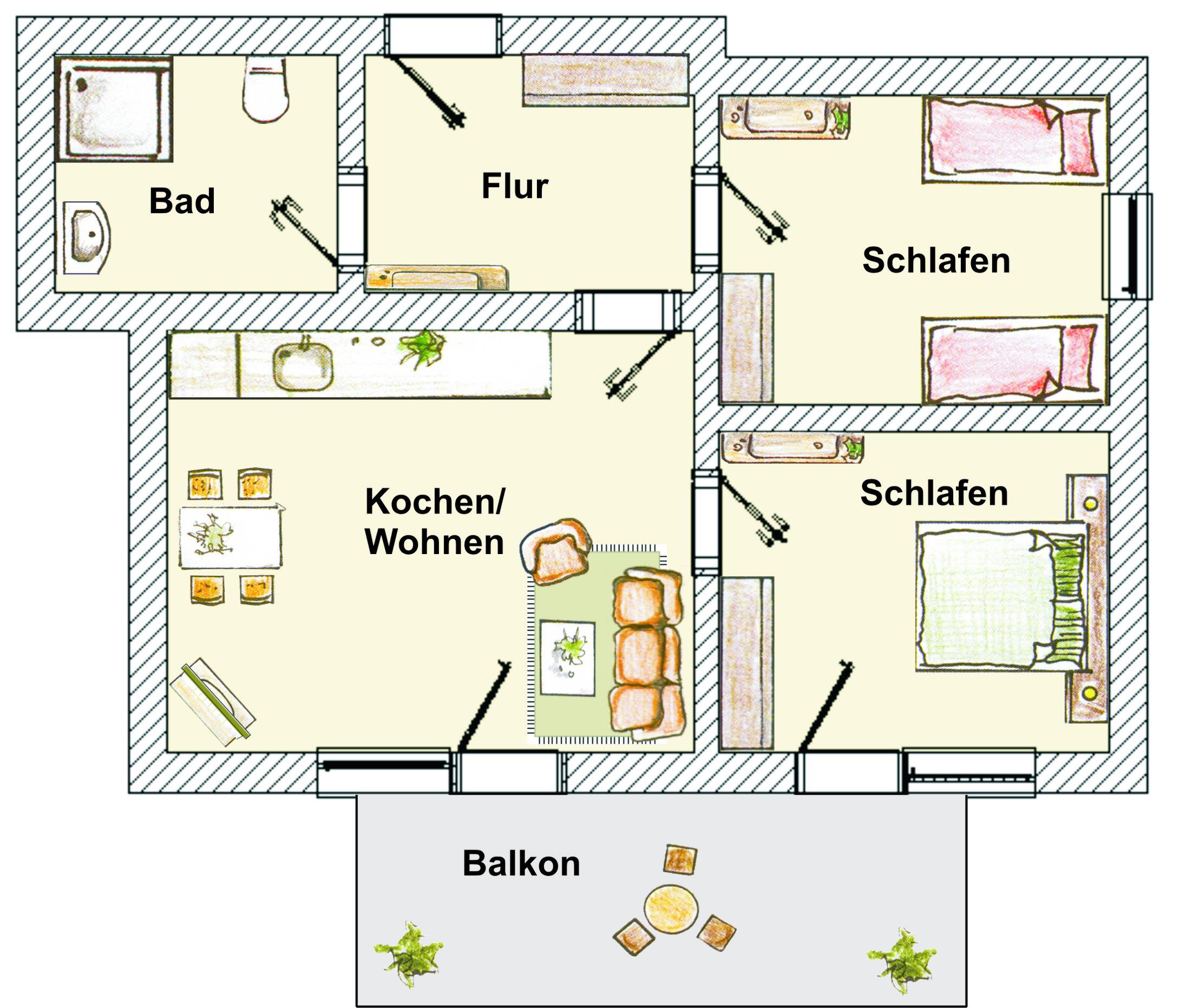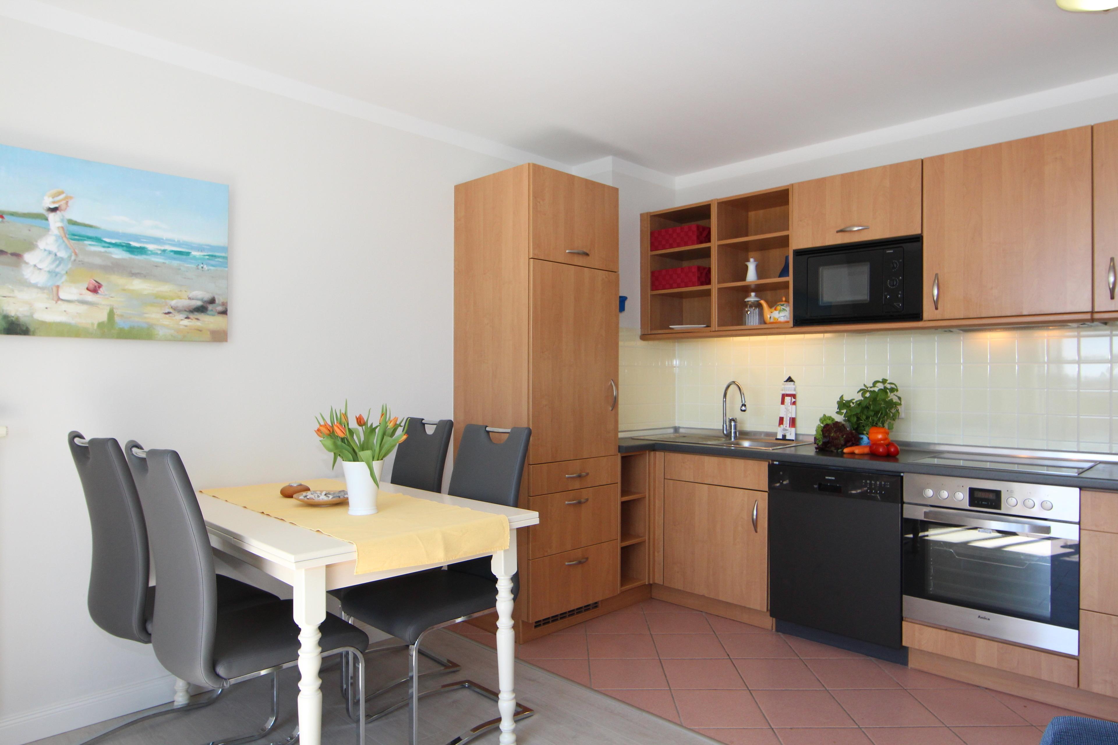 Dieses 55 qm große 3-Zimmer Appartement befindet sich im Dachgeschoss eines der beiden Neubauten und ist über einen Fahrstuhl zu erreichen. Das Highlight dieser Wohnung ist der traumhafte Blick über den Schloonsee vom Schlaf- und Wohnzimmer sowie vom Balkon. Der Wohnbereich ist mit einer gemütlichen Couch, Sessel, Couchtisch und TV/Radio eingerichtet. Die moderne Küchenzeile, ausgestattet mit Ceranfeld, Backofen, Mikrowelle, Kühlschrank, Geschirrspüler und ein Essplatz für 4 Personen sind offen im Wohnbereich integriert. Das große Schlafzimmer ist mit einem Doppelbett mit getrennten Matratzen (90x200) und reichlich Schrankraum eingerichtet. Von diesem Schlafzimmer und vom Wohnzimmer ist der zum Süden gerichtete Balkon begehbar, der fast den ganzen Tag viel Sonne verspricht. Das zweite Schlafzimmer ist mit zwei Einzelbetten (90x200) und einem Kleiderschrank eingerichtet. Aus dem geöffneten Dachfenster können Sie zwischen den Häusern das Meer erblicken. Das innenliegende Bad ist mit Dusche und Waschbecken/WC ausgestattet. Ein Pkw-Stellplatz im Doppelparker (max. 1,50 m Autohöhe, max Autolänge 5,00 m; keine Kombis) befindet sich in der Tiefgarage unter dem anderen Neubau auf demselben Grundstück. Eine Sauna und ein Waschmaschinenraum gehören zur Anlage und stehen den Gästen zur Nutzung zur Verfügung.