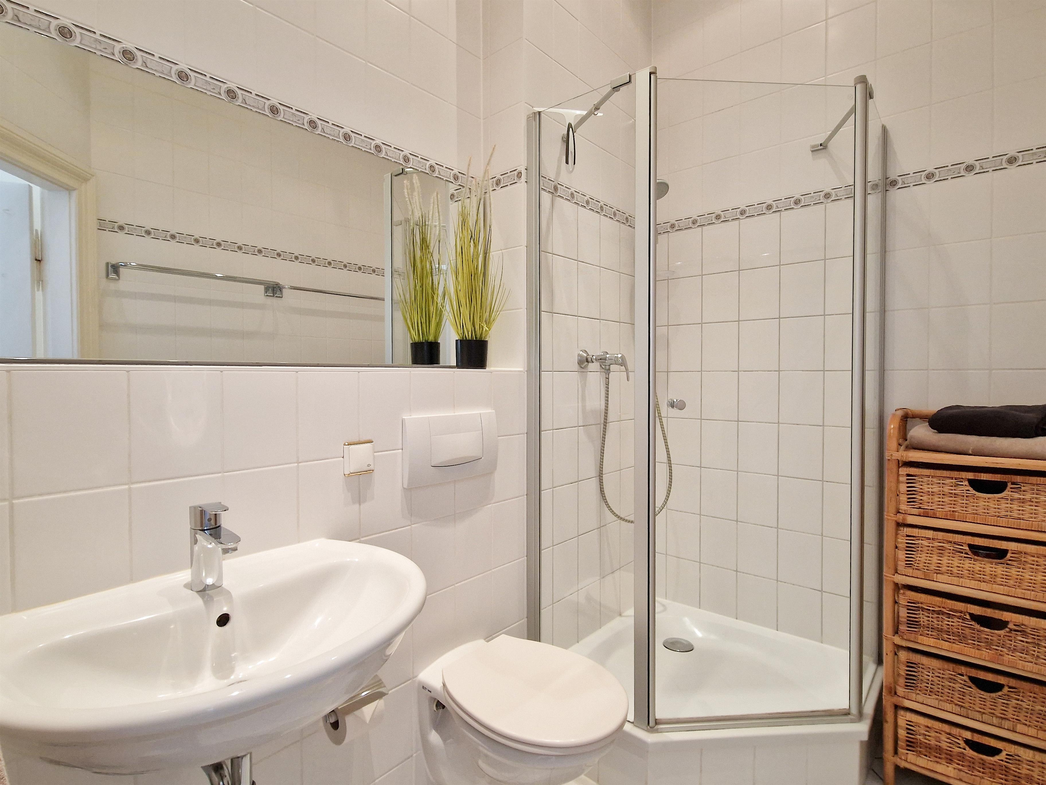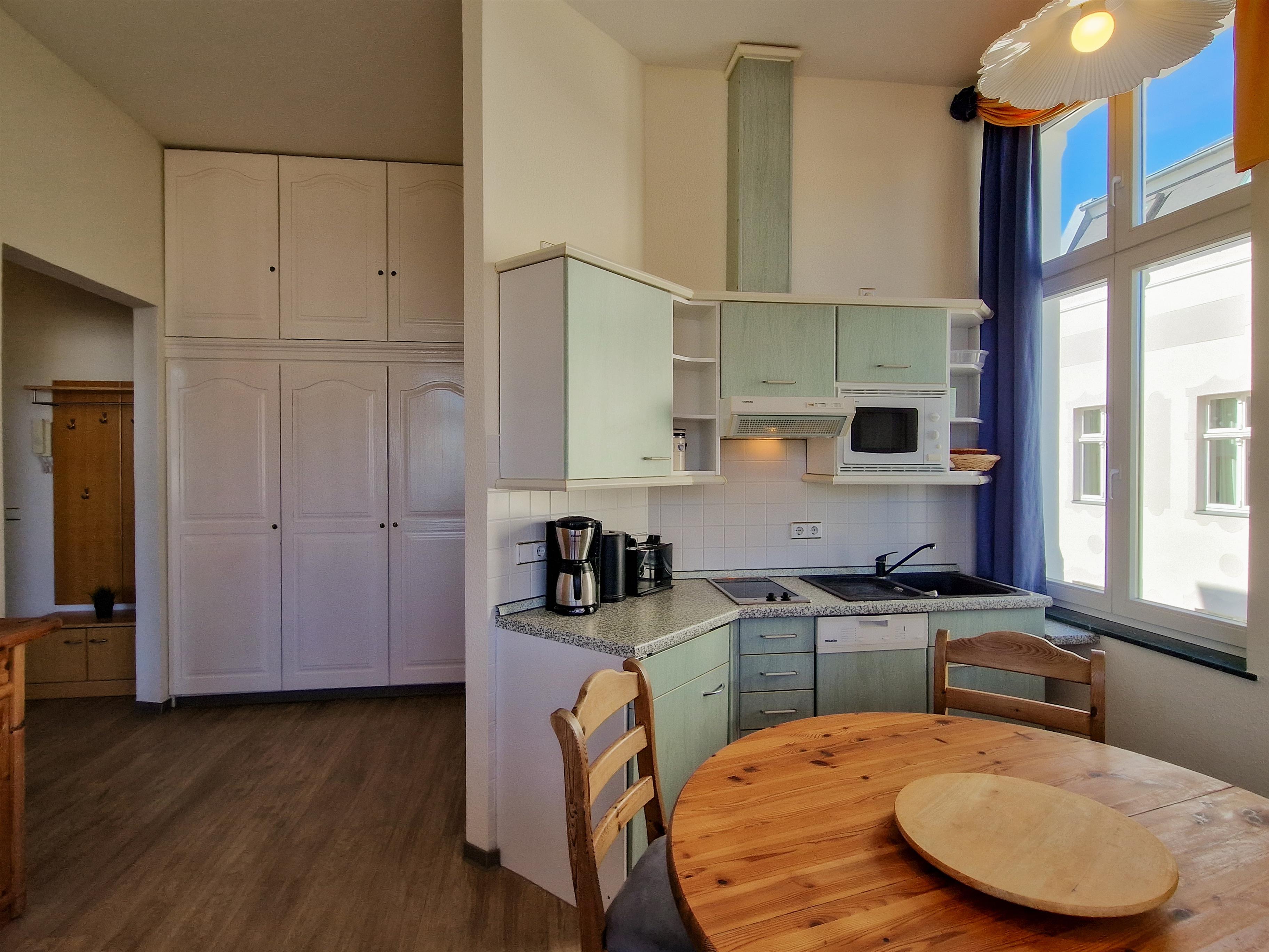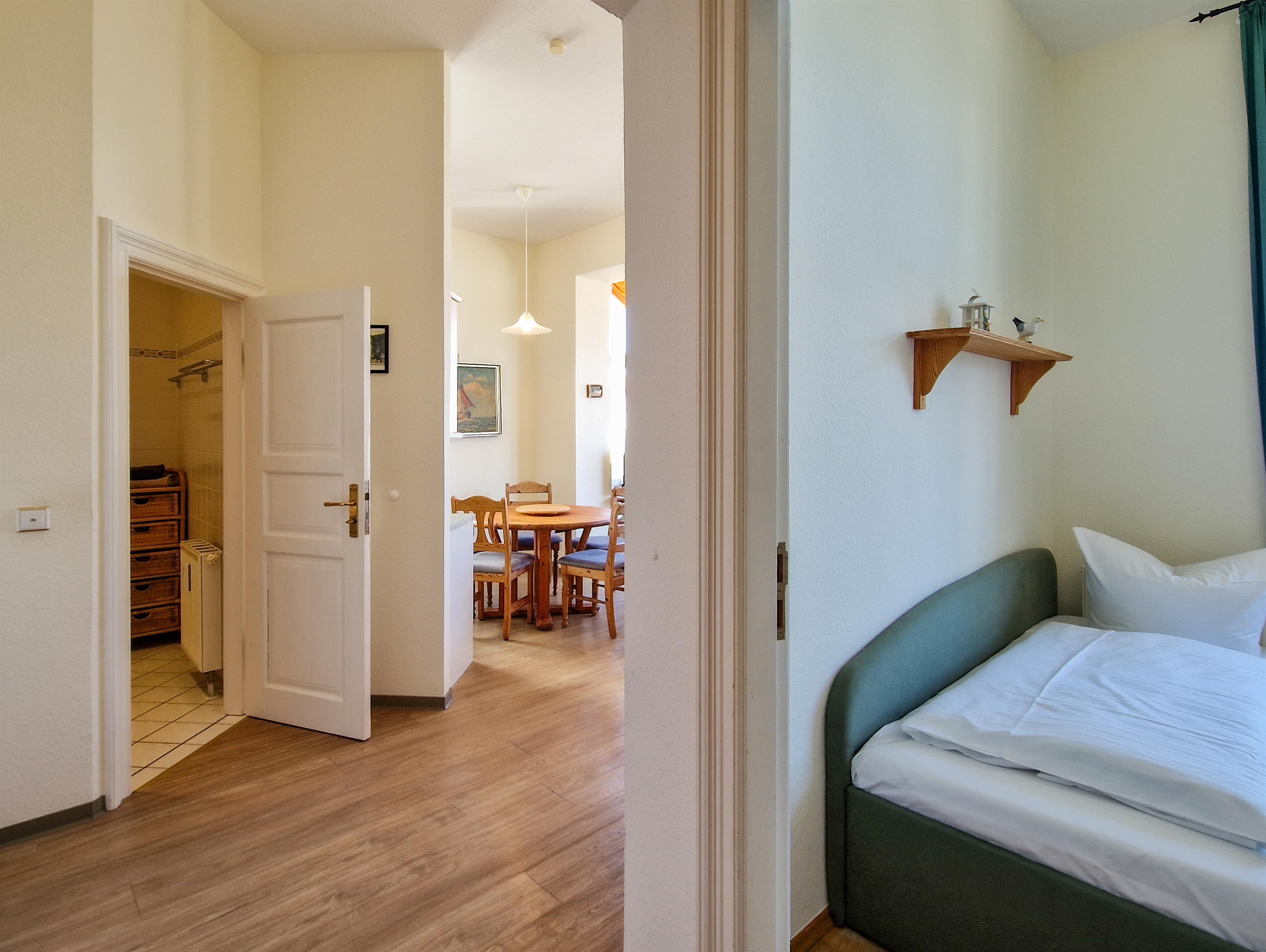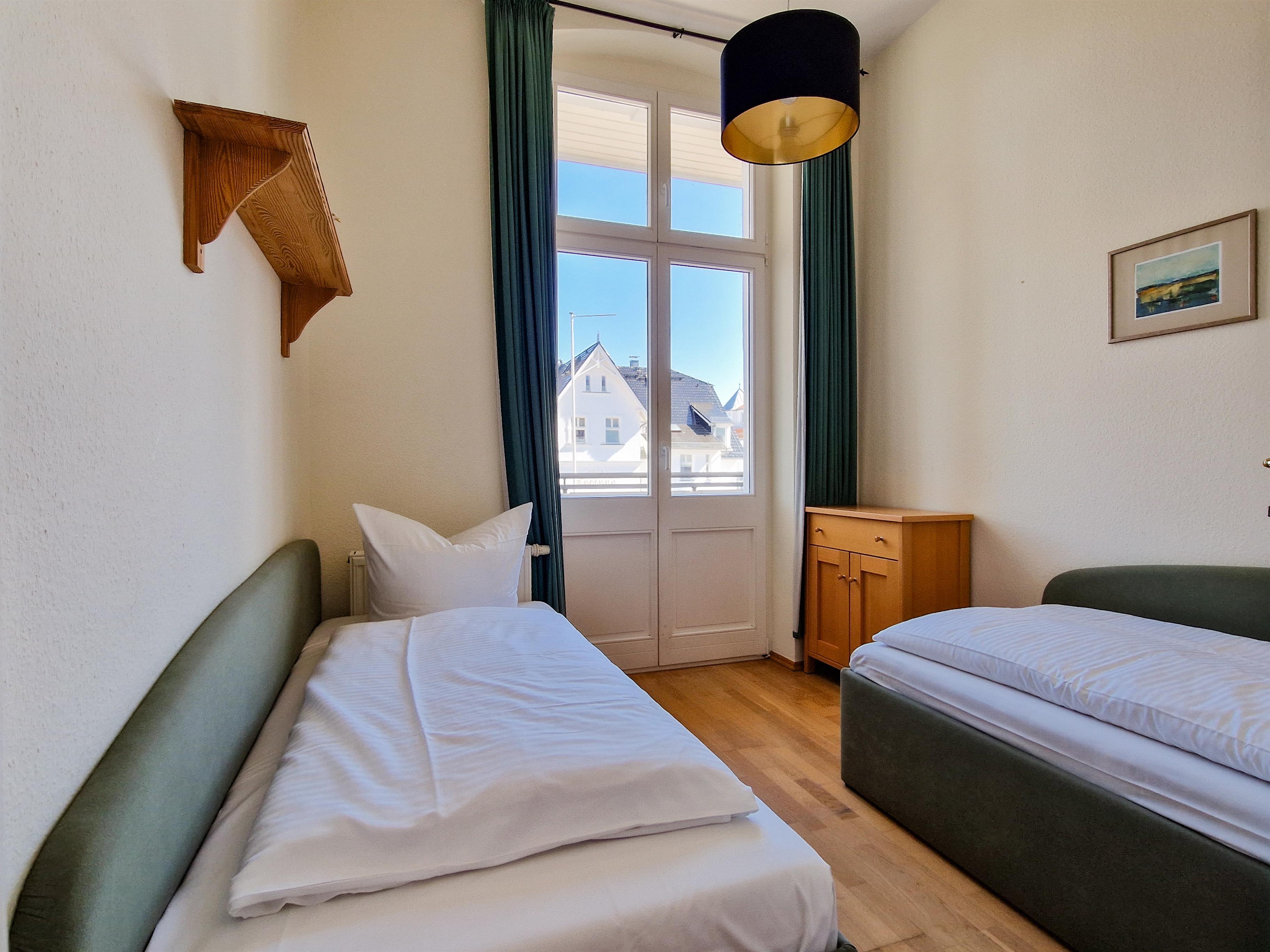 Dieses 50 qm große 3-Zimmer Appartement befindet sich im 1. Obergeschoss zur Meerseite. Sie können aus Wohn- & Schlafzimmern sowie von dem Balkon vorbei an der ersten Häuserreihe einen Blick auf die Ostsee erhaschen. Der Wohnraum ist mit zwei gemütlichen Couchen, Flat TV und einem Schreibtisch eingerichtet. Ebenfalls im Wohnraum integriert sind eine kleine Küchenzeile inklusive Ceranfeld (2 Kochfelder), Kühlschrank, Geschirrspüler, Mikrowelle etc. sowie ein Essplatz für 4 Personen. Das größere Schlafzimmer bietet den Gästen ein Doppelbett mit getrennten Matratzen (90 x 200) und ausreichend Schrankraum. Das kleine Schlafzimmer ist mit 2 Liegen ausgestattet. Das Bad ist mit Dusche und Waschbecken/WC ausgestattet. Im Keller befinden sich Waschmaschine und Trockner. Der Pkw-Stellplatz befindet sich auf dem Grundstück direkt am Haus.