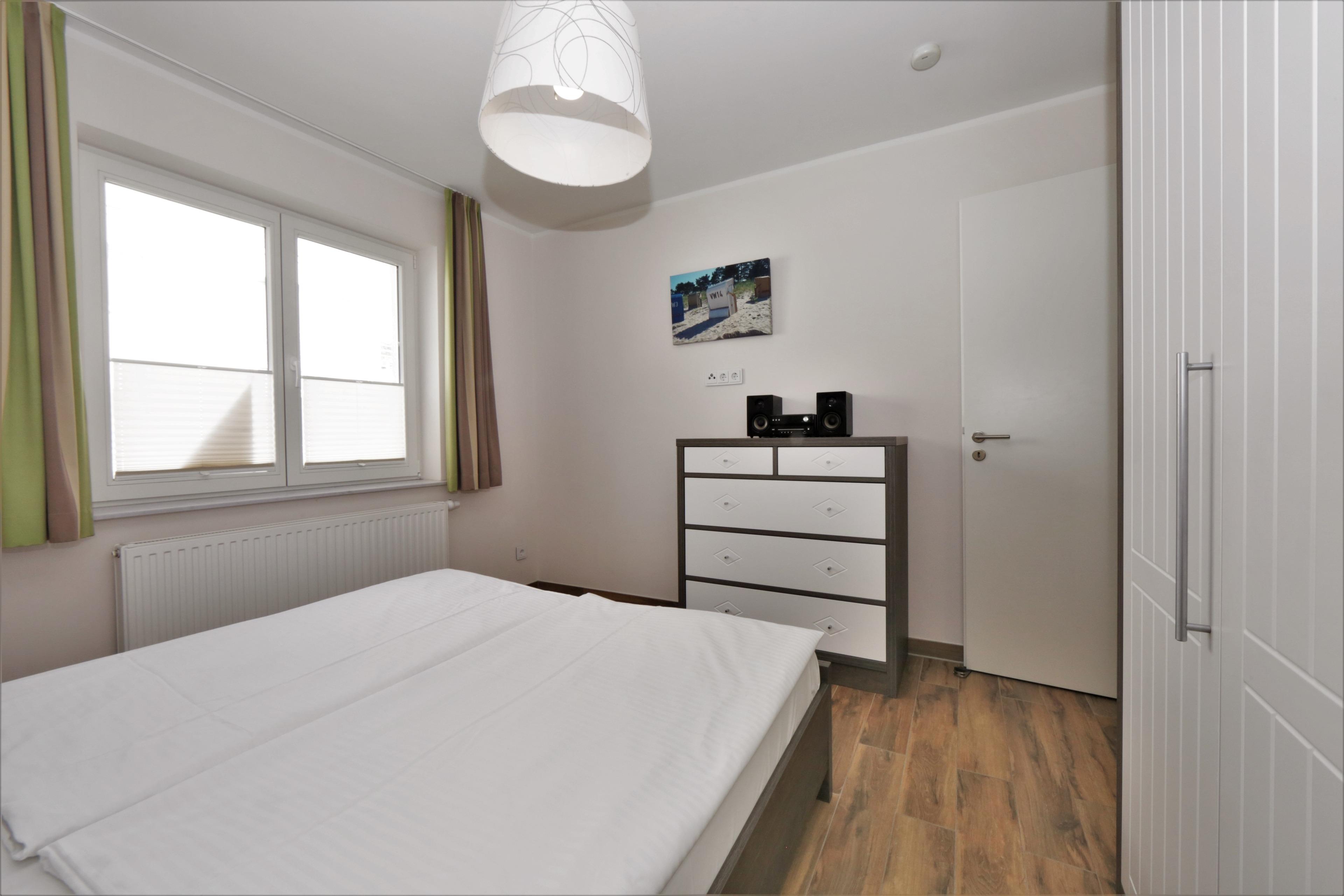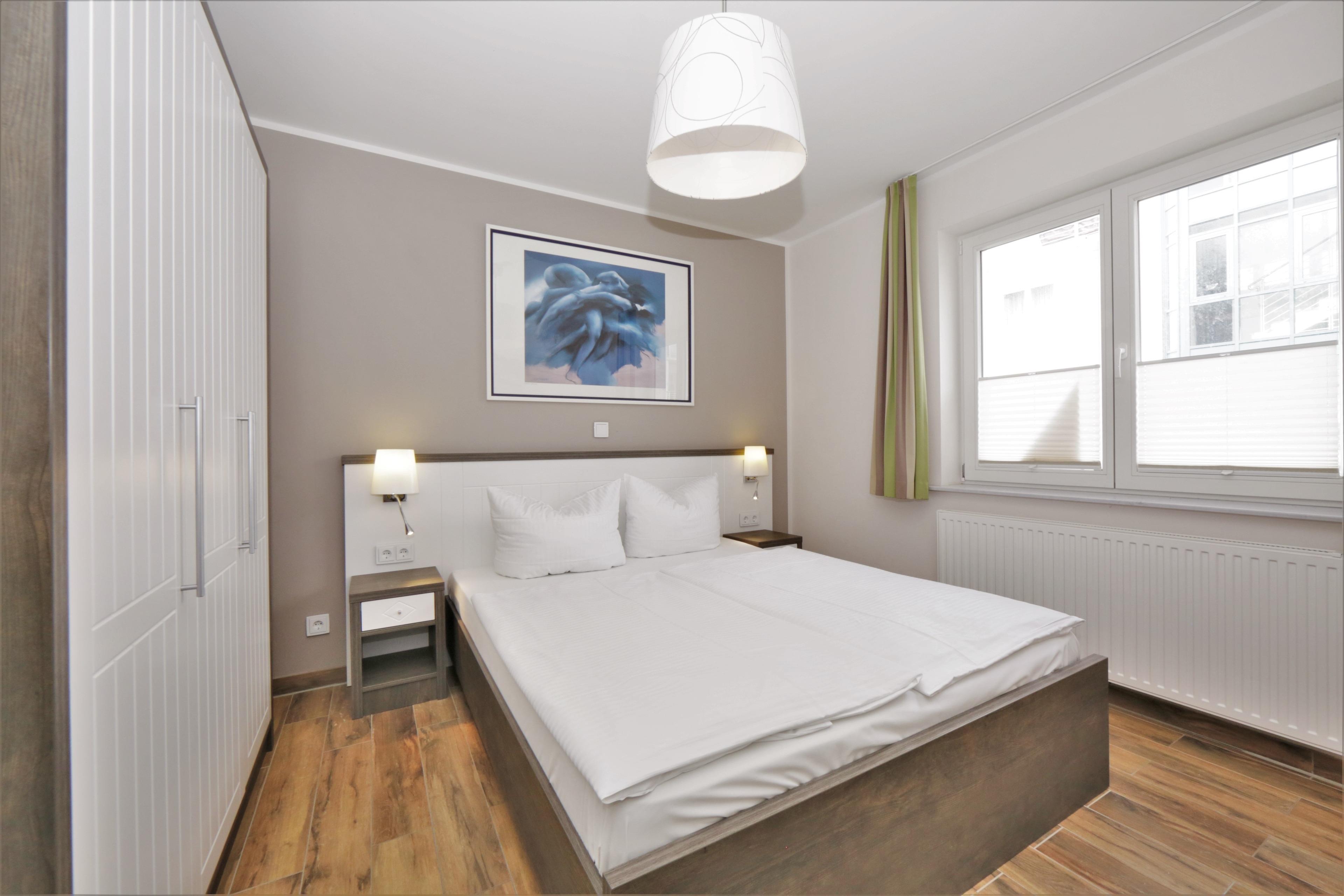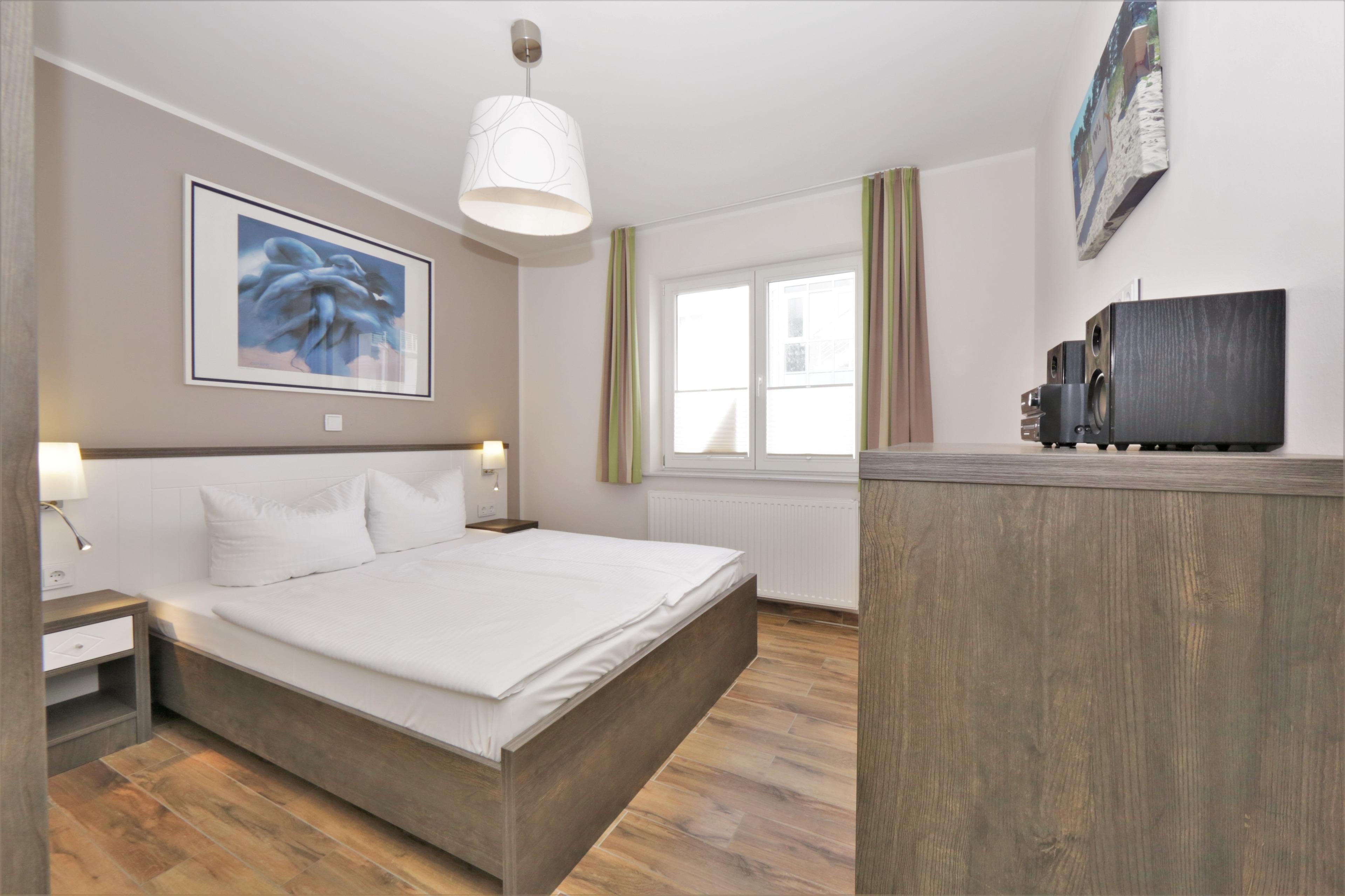 Dieses moderne und geschmackvoll eingerichtete 2-Zimmer Appartement ist 50 qm groß und liegt im 1. Obergeschoss. Der hell eingerichtete Wohnraum verfügt über eine gemütliche Sitzecke (mit Schlaffunktion), sowie Flat-TV und Radio. Eine moderne Einbauküche mit Geschirrspüler, Backofen, Ceranfeld, Mikrowelle p.p und der Essplatz für max. 4 Personen ist im Wohnraum integriert. Auf dem nord-westlich ausgerichteten Balkon zum Hof können die Gäste den Urlaubstag entspannt ausklingen lassen. Das Schlafzimmer ist mit einem Doppelbett mit getrennten Matratzen und genügend Schrankraum ausgestattet, das Badezimmer mit einer ebenerdigen Dusche, Waschbecken und WC. Als besonderes Bonbon steht den Gästen dieser Wohnung saisonabhängig ein Strandkorb zur kostenlosen Nutzung am Strand zur Verfügung. Der Pkw-Stellplatz befindet sich auf dem Grundstück und ist der Wohnung zugeordnet. Fahrräder können im Keller untergestellt werden.