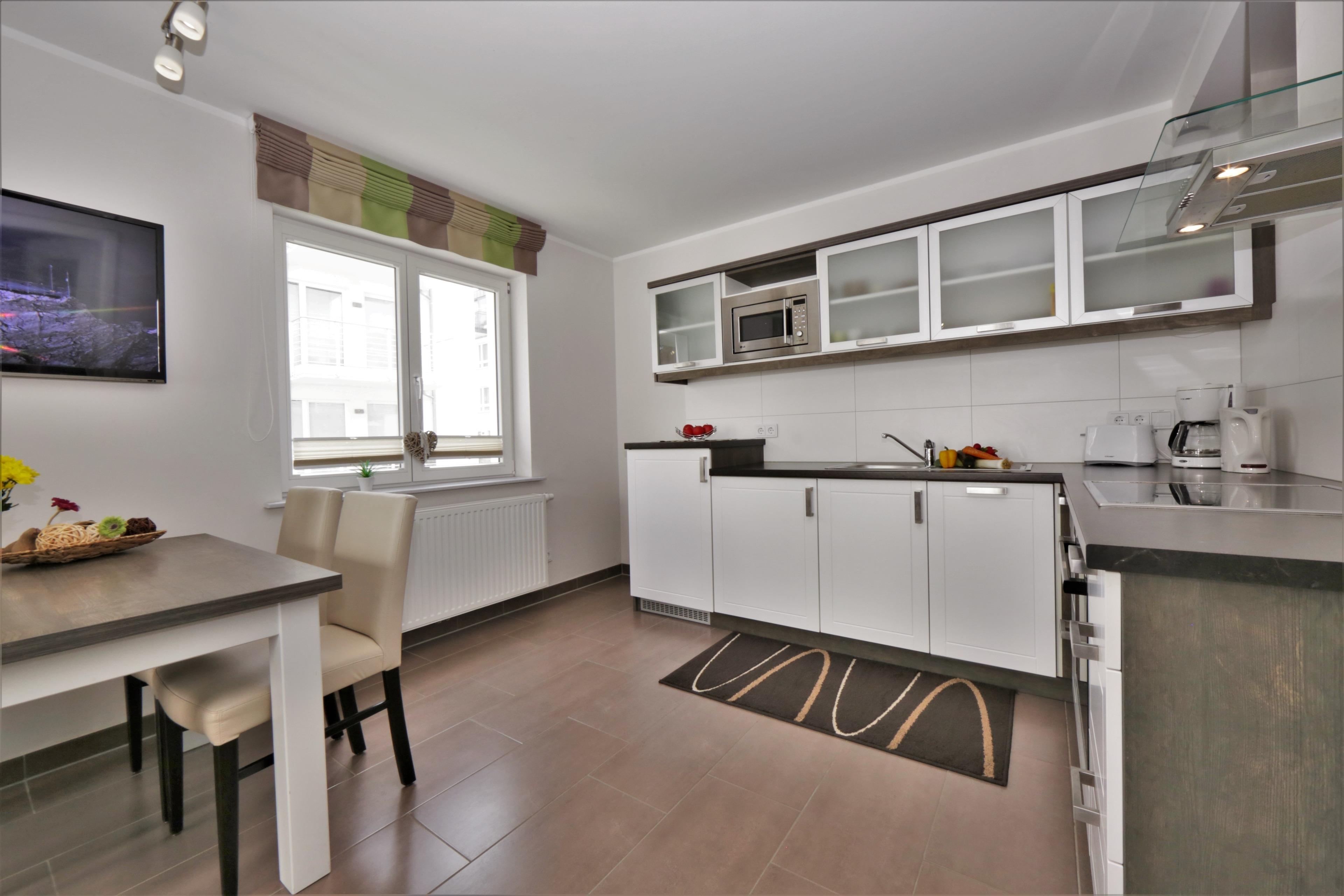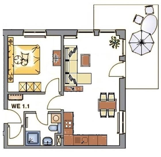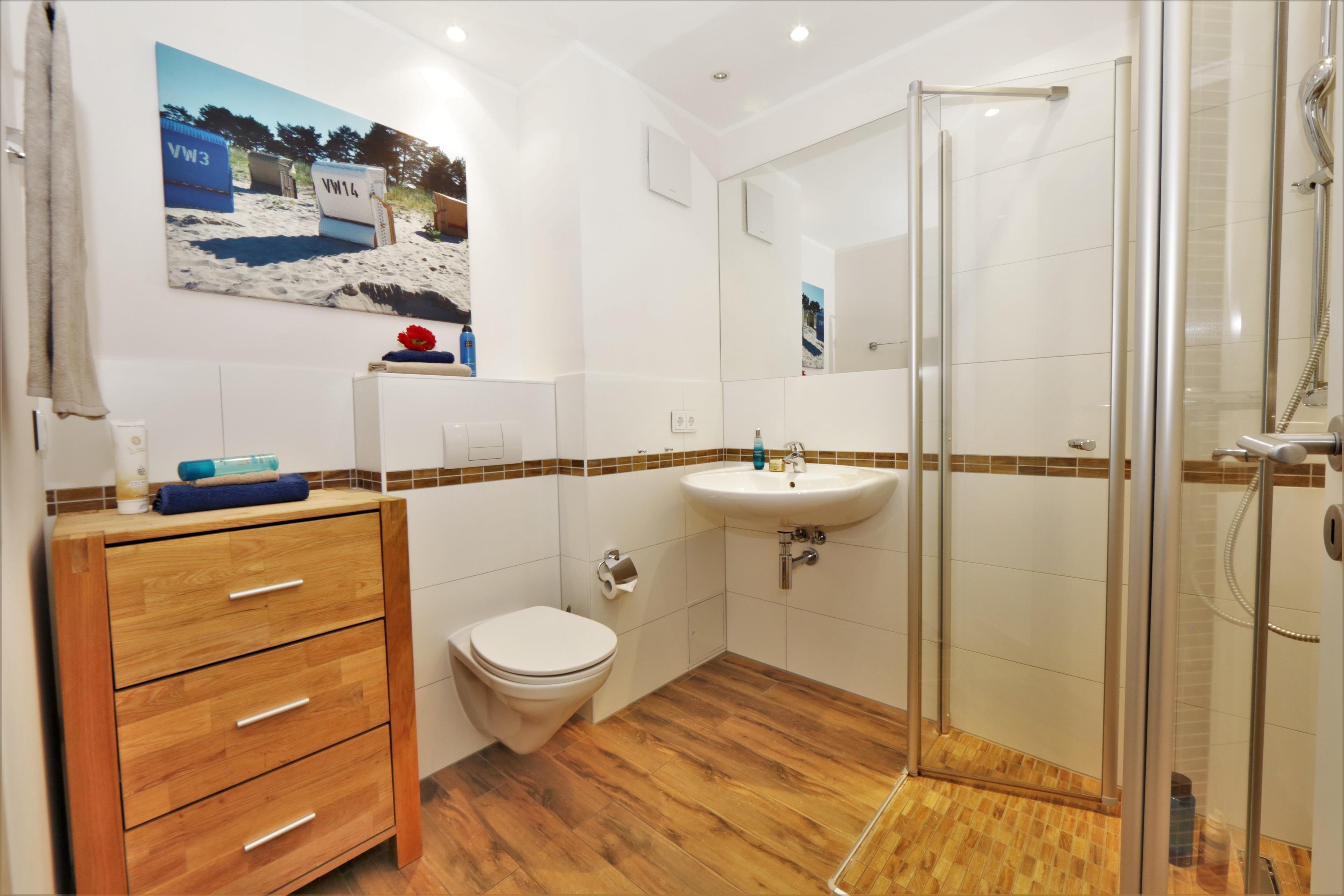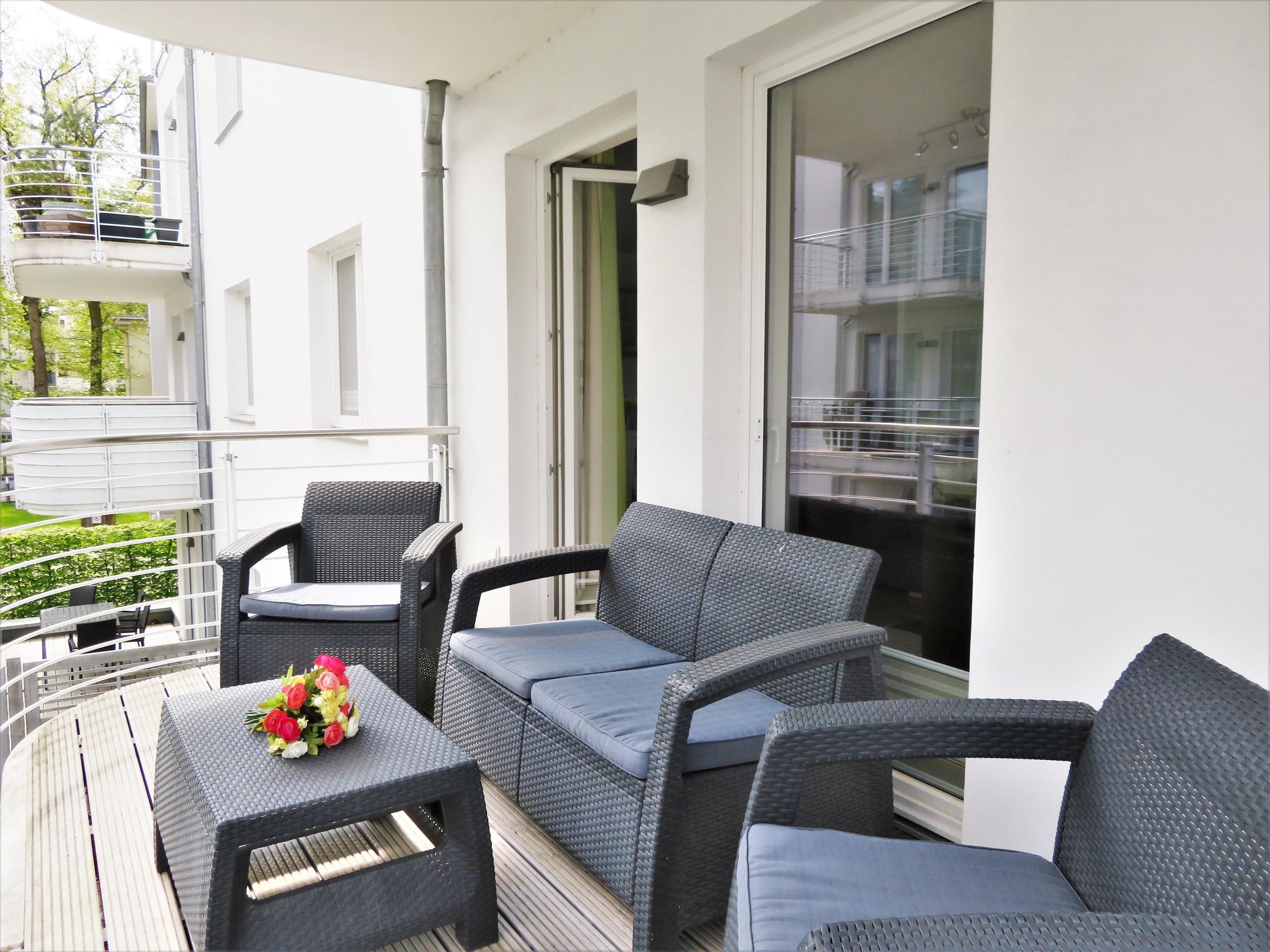 Dieses moderne und geschmackvoll eingerichtete 2-Zimmer Appartement ist 50 qm groß und liegt im 1. Obergeschoss. Der hell eingerichtete Wohnraum verfügt über eine gemütliche Sitzecke (mit Schlaffunktion), sowie Flat-TV und Radio. Eine moderne Einbauküche mit Geschirrspüler, Backofen, Ceranfeld, Mikrowelle p.p und der Essplatz für max. 4 Personen ist im Wohnraum integriert. Auf dem nord-westlich ausgerichteten Balkon zum Hof können die Gäste den Urlaubstag entspannt ausklingen lassen. Das Schlafzimmer ist mit einem Doppelbett mit getrennten Matratzen und genügend Schrankraum ausgestattet, das Badezimmer mit einer ebenerdigen Dusche, Waschbecken und WC. Als besonderes Bonbon steht den Gästen dieser Wohnung saisonabhängig ein Strandkorb zur kostenlosen Nutzung am Strand zur Verfügung. Der Pkw-Stellplatz befindet sich auf dem Grundstück und ist der Wohnung zugeordnet. Fahrräder können im Keller untergestellt werden.