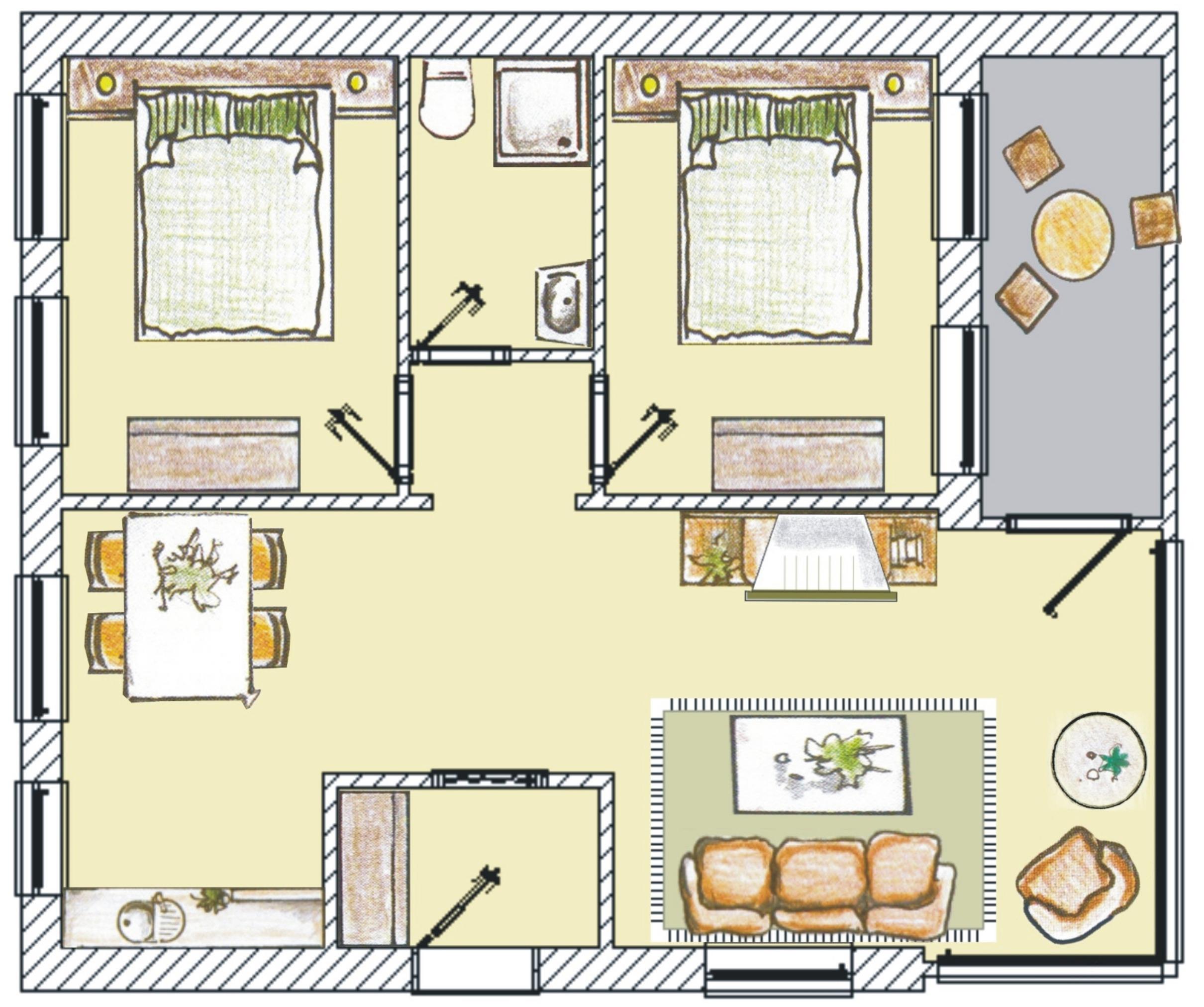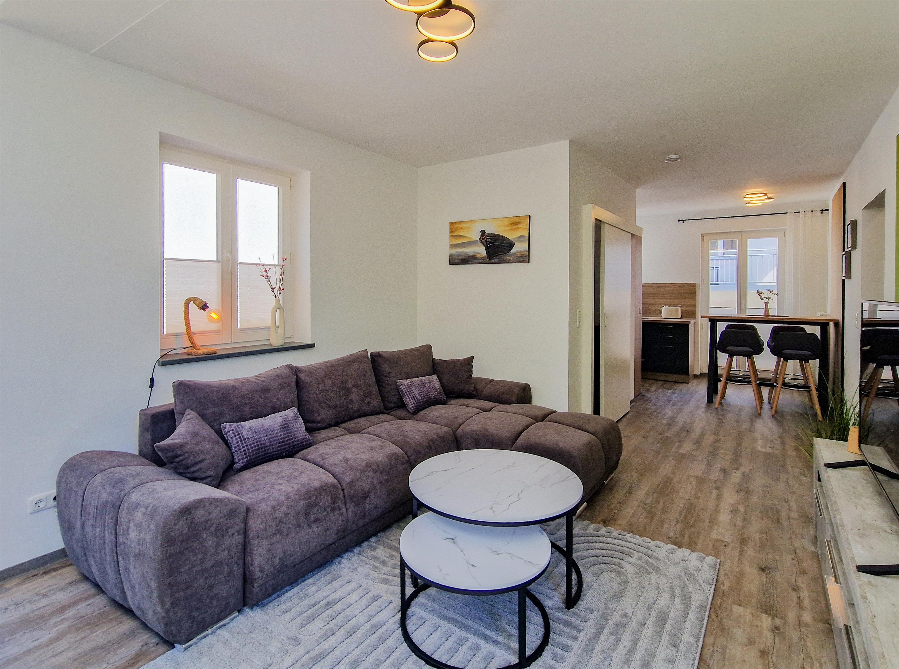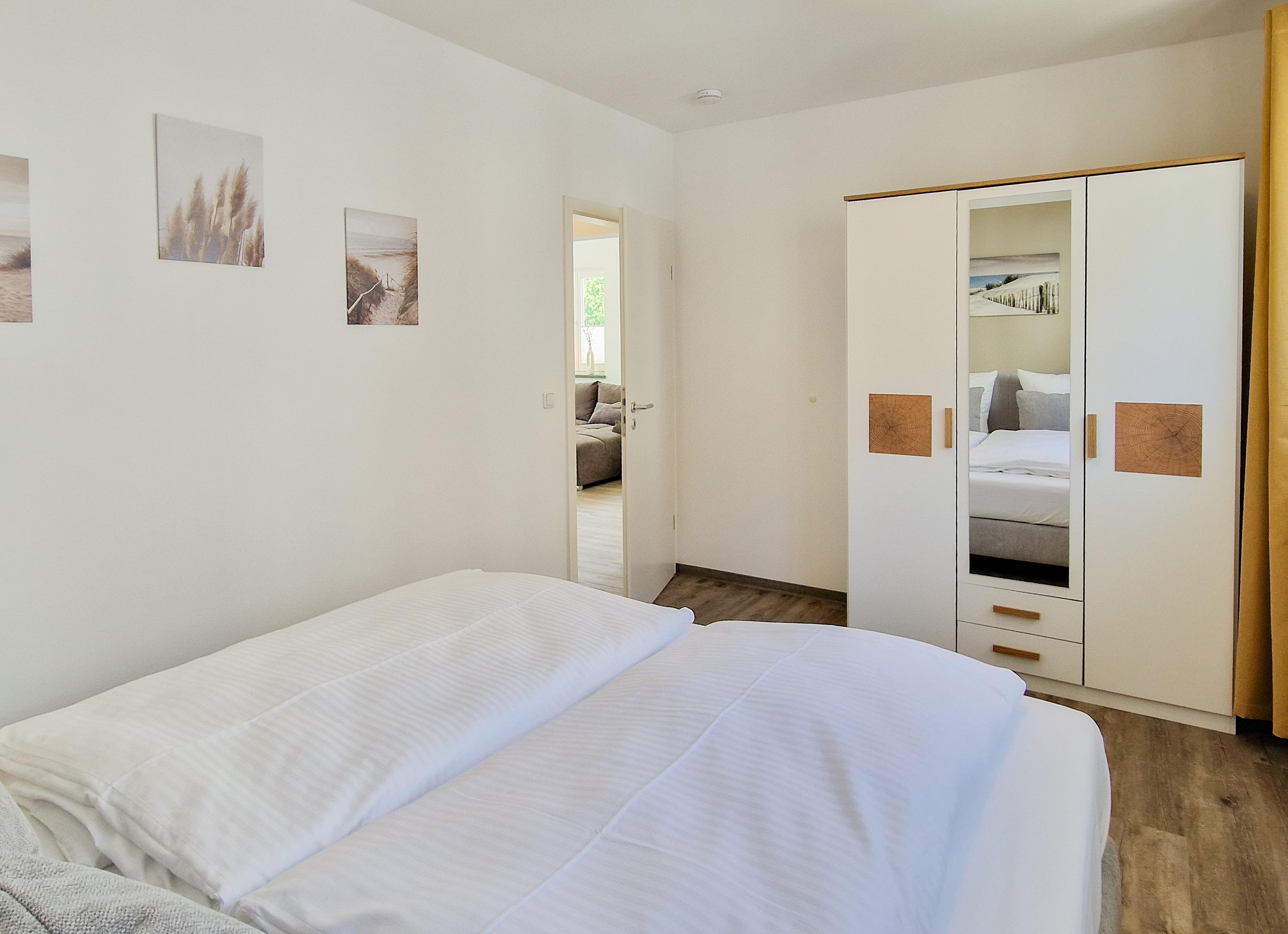 Diese gemütliche 3-Raum-Wohnung liegt im 1. Obergeschoß mit einen sonnigen Balkon in Richtung Buchenwald. Im Wohnbereich befinden sich eine Couchecke, Couchtisch und TV. Die an den Wohnbereich angrenzende Küche ist mit einem Essplatz eingerichtet und verfügt über Herd mit Backofen, Kühlschrank mit Gefrierfach, Mikrowelle, Geschirrspüler etc. Beide Schlafzimmer sind mit einem Boxspringbett (180 x 200) sowie einem Kleiderschrank möbliert. Das Bad ist mit einer Dusche und Waschtisch/WC ausgestattet. Ein Pkw-Stellplatz steht Ihnen auf dem Grundstück zur Verfügung.