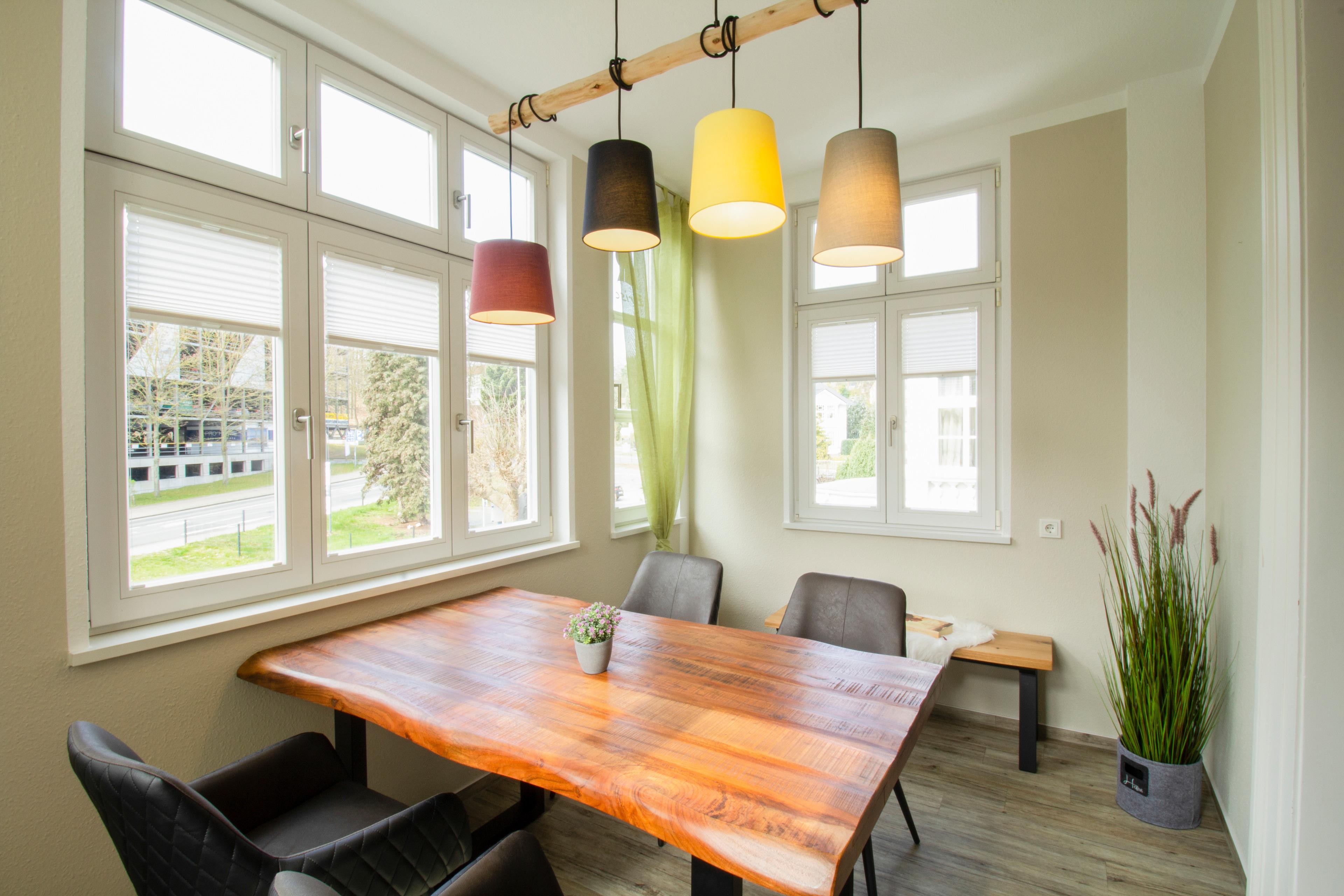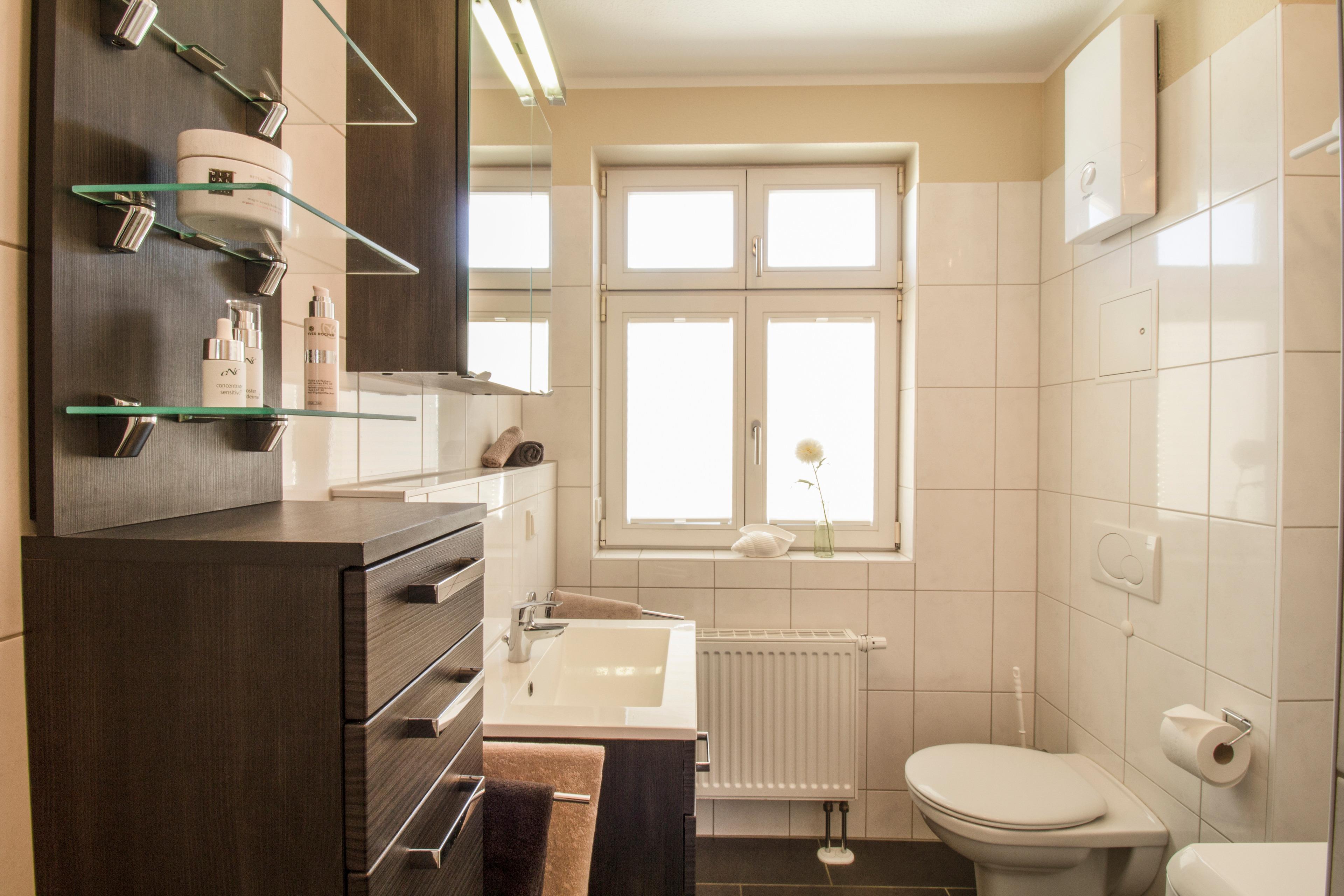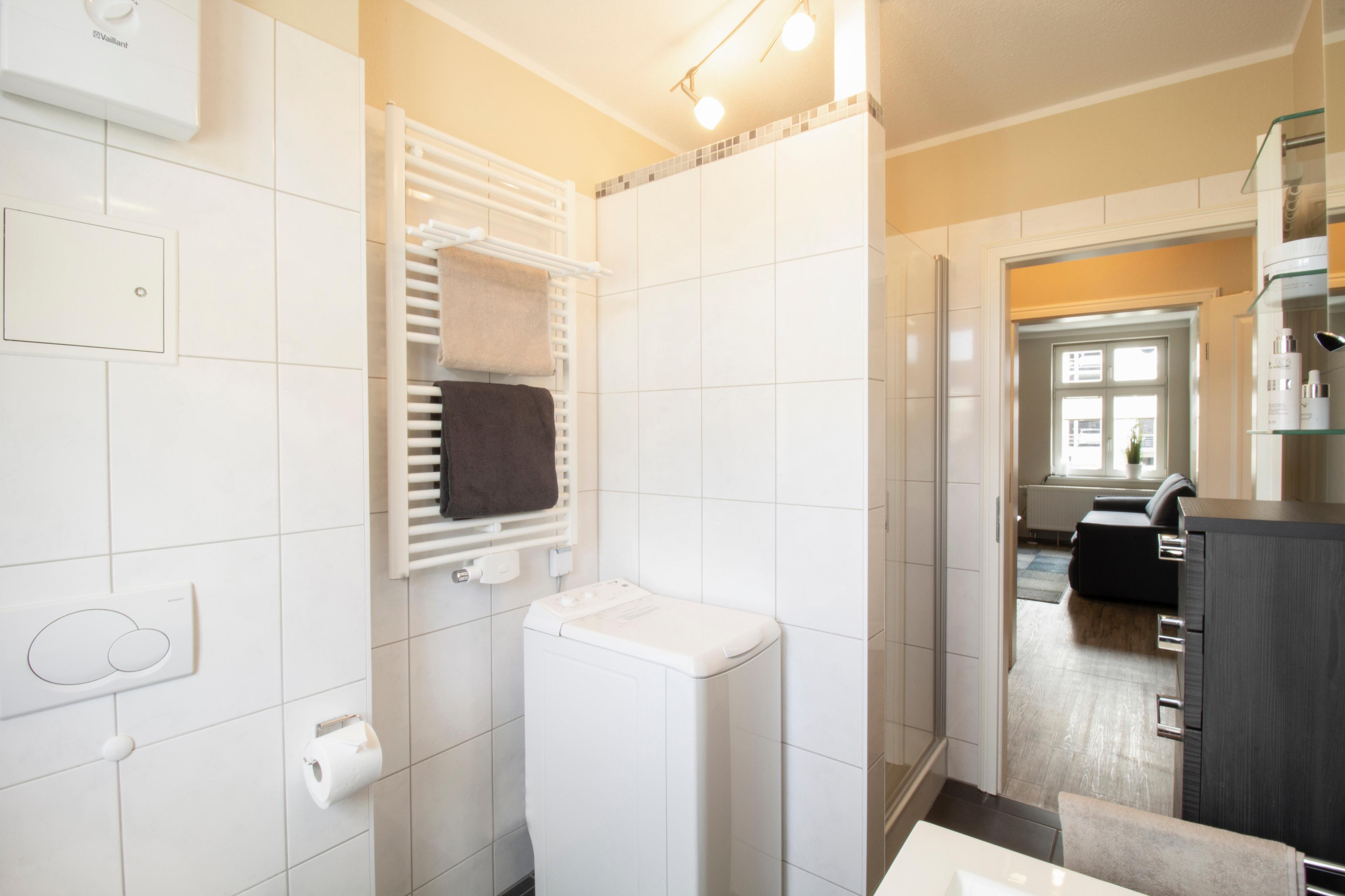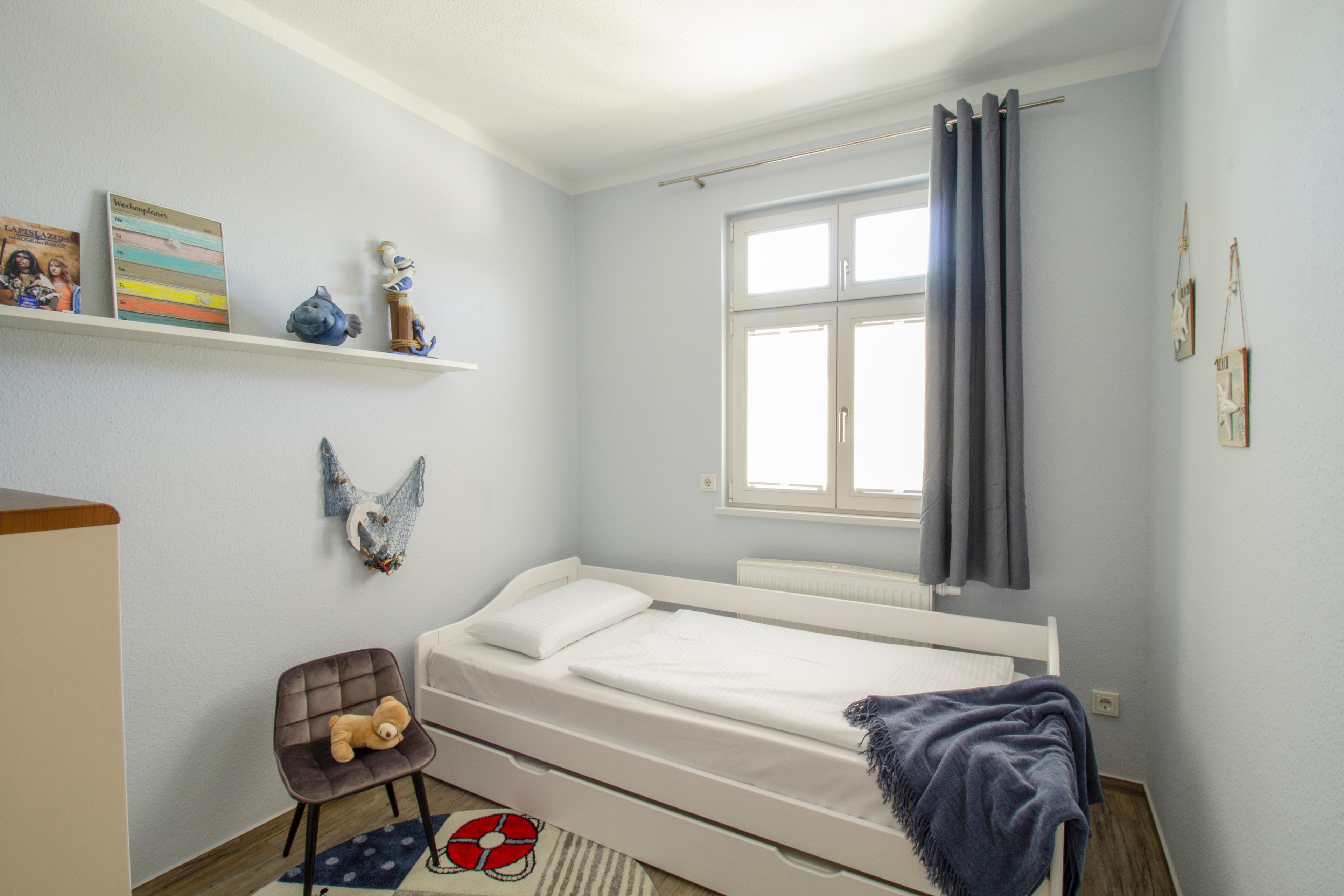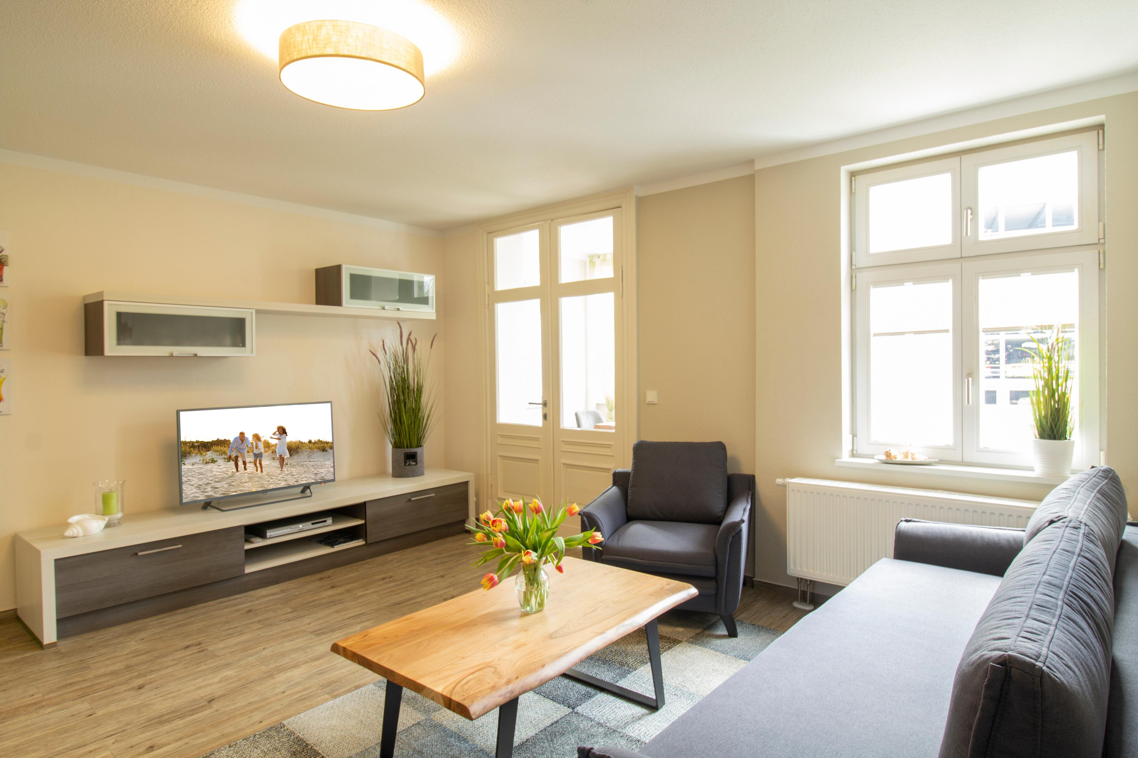 Diese gemütliche 3-Raum-Wohnung liegt im 1. Obergeschoß mit geschlossener Loggia (Fenster lassen sich öffnen) und ist ausgestattet mit moderner Küchenzeile (Cerankochfeld, Backofen, Kühlschrank mit Gefrierfach, Mikrowelle, Toaster, Kaffeemaschine etc.). Im Wohnbereich befinden sich eine Couchecke, Couchtisch und TV. Der Küchenbereich ist im Wohnbereich integriert, der Essbereich ist separat in der Loggia. Im Schlafzimmer befinden sich ein Kleiderschrank, Doppelbett sowie Nachtschränke. Das zweite Schlafzimmer ist mit einem Tandembett ausgestattet.