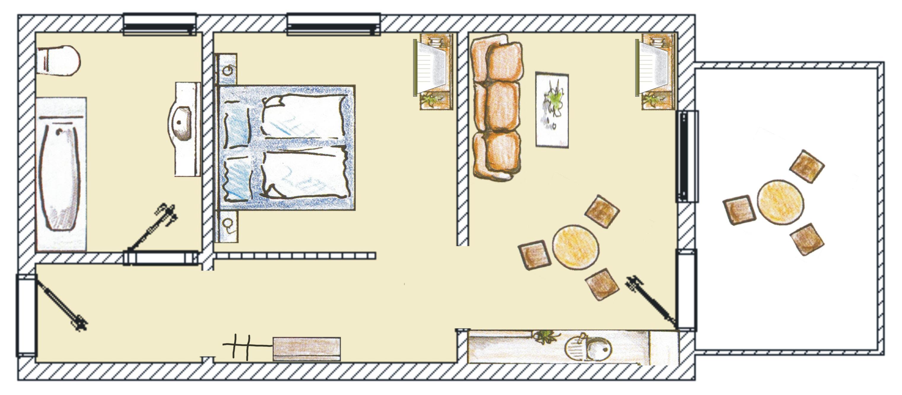 Diese 44 qm große gemütliche 2-Zimmer-Wohnung liegt im 1. Obergeschoss und ist für 2-3 Personen geeignet. Den Gästen steht ein Wohnzimmer mit kleiner Couchecke und ein Fensterplatz zum Essen zur Verfügung. Ein Flat-TV ist selbstverständlich. Die im Wohnraum integrierte Küche ist mit Kühlschrank inkl. Gefrierfach, Geschirrspüler, Cerankochfeld sowie Mikrowelle ausgestattet. Der herrlich große Balkon mit nördlicher Ausrichtung ist vom Wohnraum begehbar. Im zum Flur hin offenen Schlafzimmer befindet sich ein Doppelbett mit getrennten Matratzen (0,80 x 2,00 m) und genügend Schrankraum. (Flur und Schlafzimmer sind durch keine Tür getrennt.) Den dritten Schlafplatz stellt die Couch im Wohnzimmer. Das großzügige Bad mit Fenster ist mit Badewanne, Waschtisch, WC ausgestattet. Ein PKW-Stellplatz (Carport, Einfahrtshöhe 2,20m) befindet sich auf dem Hof und ist der Wohnung zugeordnet.