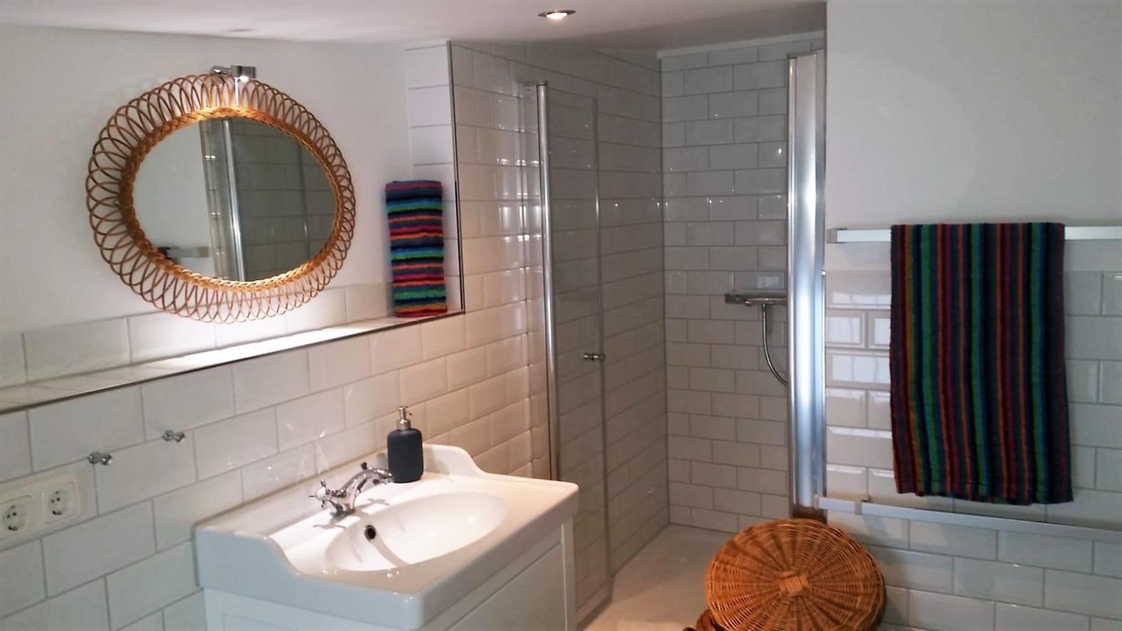 Das Badezimmer, das sich ebenfalls im Obergeschoss befindet, ist mit viel Liebe zum Detail gestaltet und aufwendig gefliest. Es verfügt über eine geräumige Dusche, einen modernen Waschtisch mit Spiegel sowie ein WC. Die hochwertige Ausstattung und das stilvolle Design sorgen dafür, dass Sie sich hier rundum wohlfühlen können.