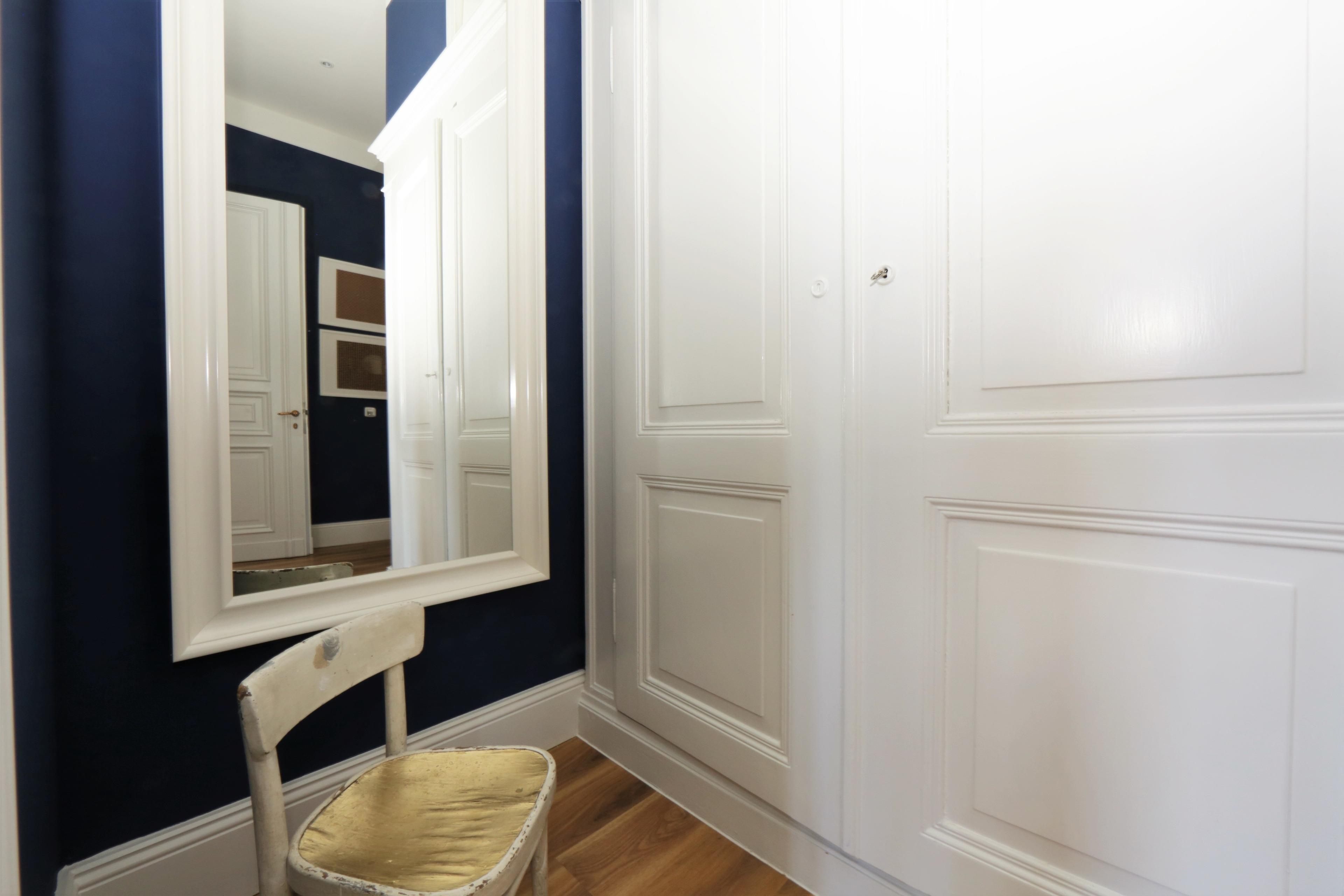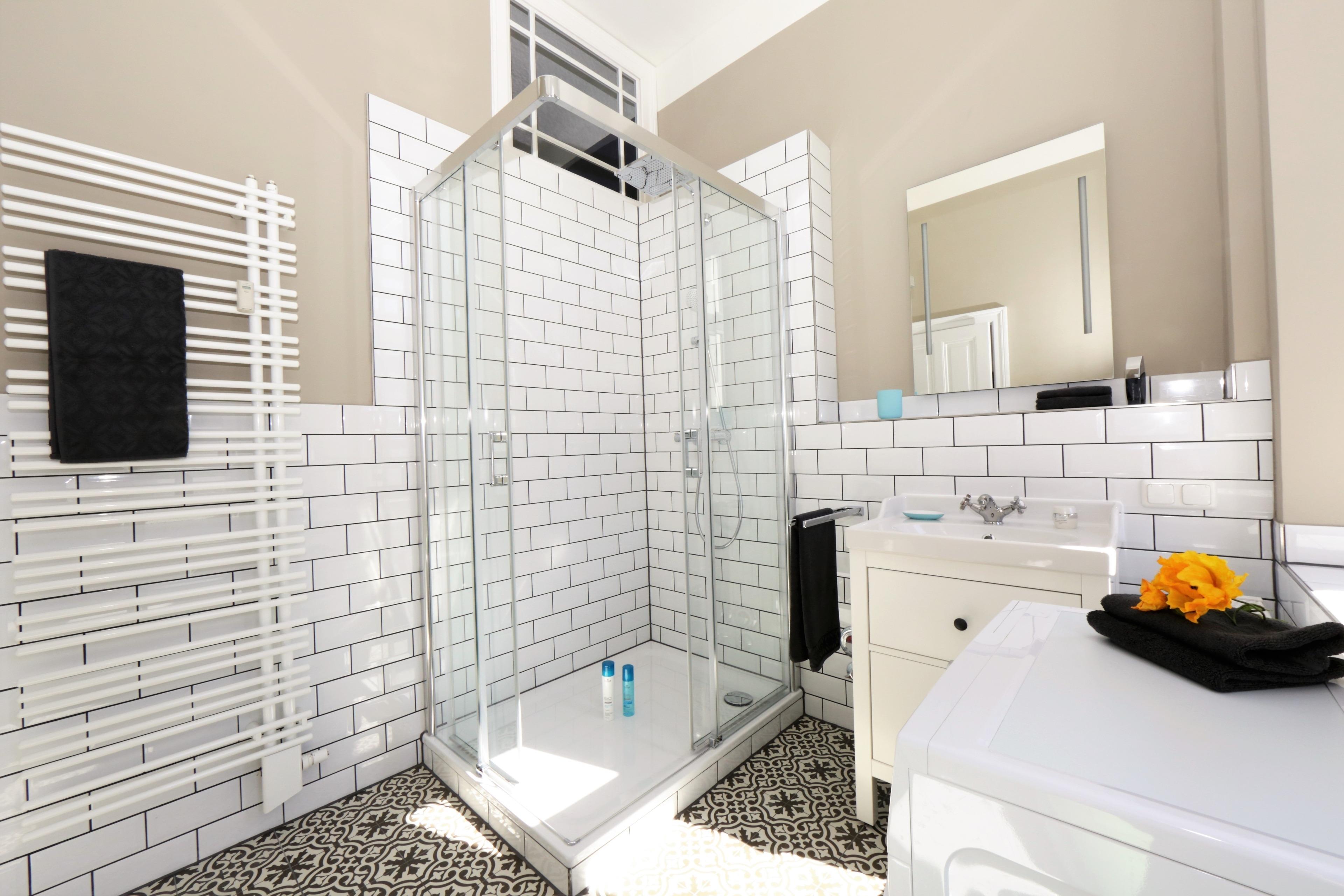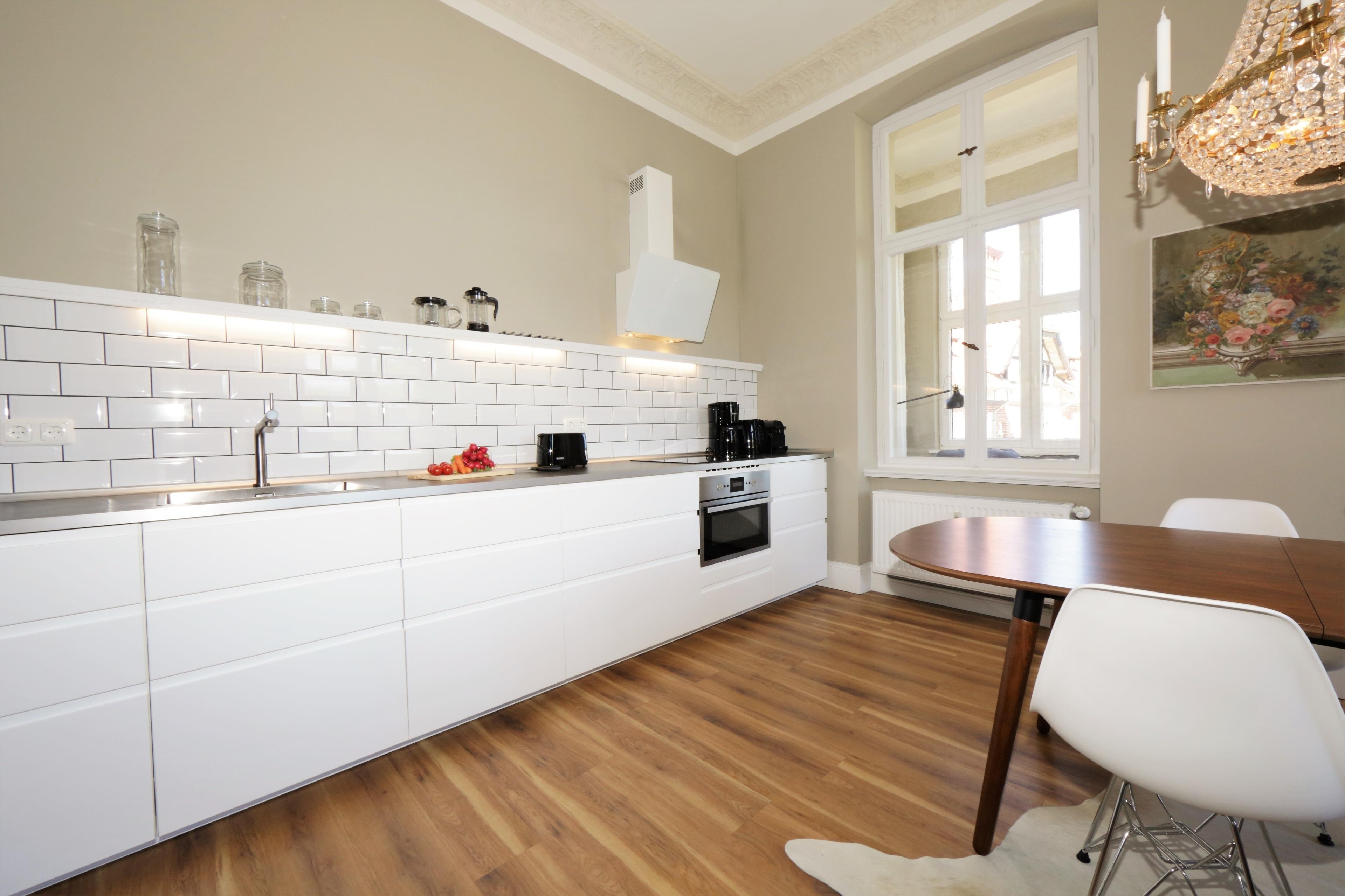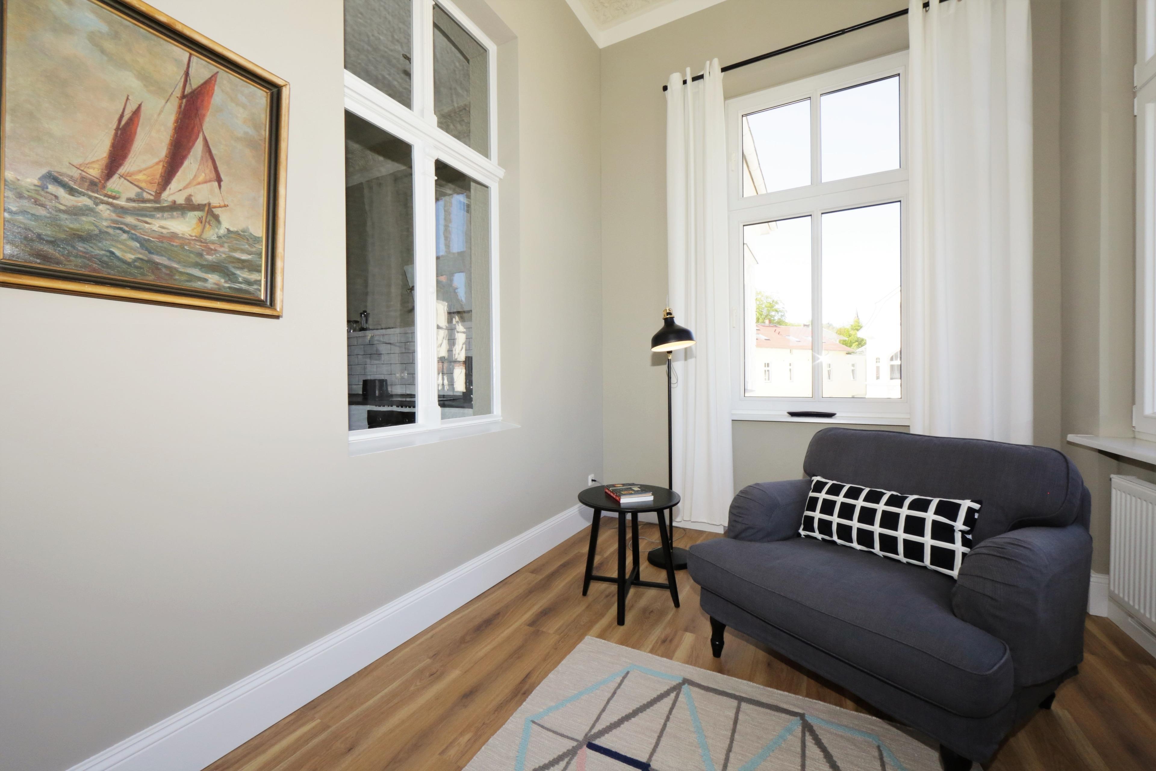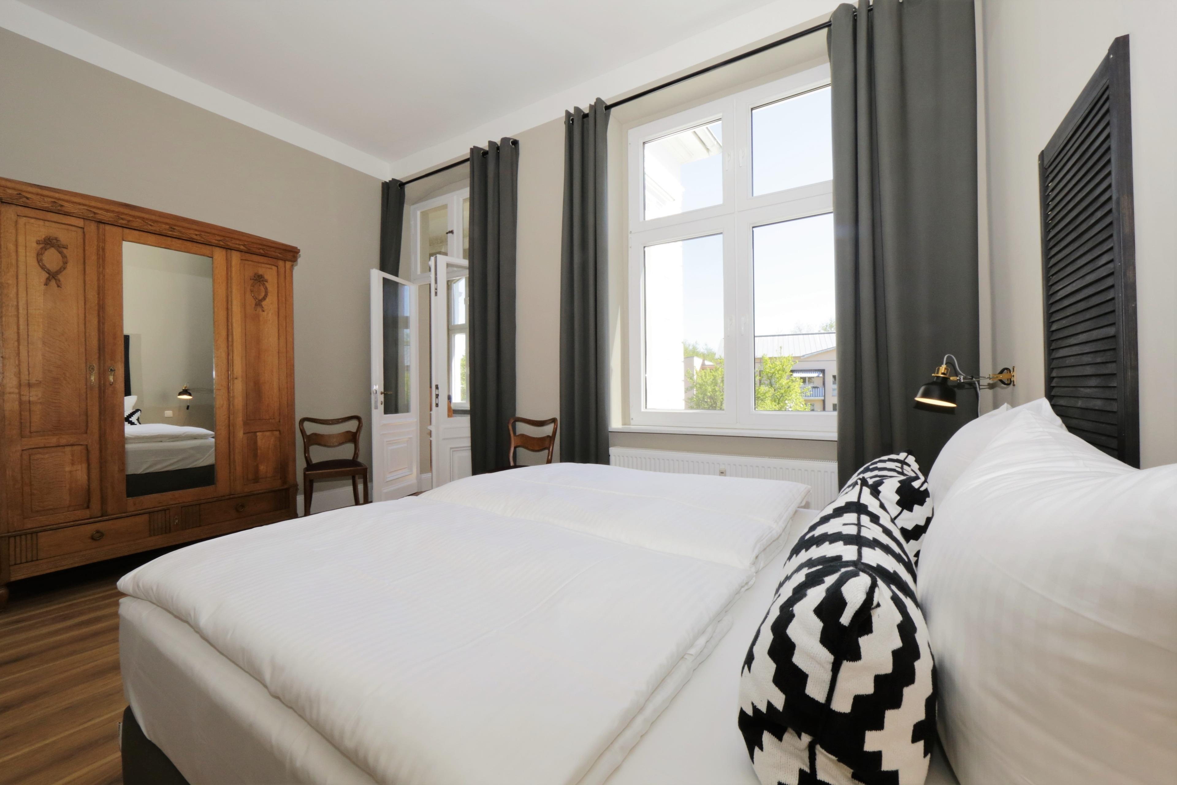 In dieser extravagant schönen Wohnung werden Sie sich fast Regenwetter wünschen, um mehr Zeit in diesen herrlichen Räumlichkeiten zu verbringen. Die mit 112m² äußerst großzügige Wohnung liegt im 1. Obergeschoss der Villa. Sie vereint auf sehr gelungene Weise moderne Einrichtung mit dem Charme vergangener Zeiten. Vom aufwändig als Galerie gestalteten Flur erreichen Sie den Wohnraum - das Herzstück der Wohnung. Die gemütliche Sitzecke mit Flat TV befindet sich neben dem Schmuckstück des Raumes, einem Kachelofen, der allerdings nur einen dekorativen Zweck erfüllt. Die moderne große Küchenzeile erlaubt es mehreren fleißigen Helfern an der Zubereitung der Mahlzeiten mitzuwirken. Kühlschrank mit Gefrierfach, Geschirrspüler, Backofen sowie Cerankochfeld sind in der modernen Küche selbstverständlich. Ein großer Esstisch, der von einem wunderschönen Kronleuchter erhellt wird, lädt zu gemeinsamen Mahlzeiten ein. Der Wohnraum sowie die angrenzende Loggia überraschen mit aufwendig restaurierten Stuckelementen. Die lichtdurchflutete Loggia könnte Ihr Lieblingsplatz für ein spannendes Buch werden. Sie können mit Ihrem Buch jedoch auch einen anderen Lieblingsplatz im rückwertigen Garten aufsuchen und im Strandkorb (saisonal) zwischen den alten Apfelbäumen relaxen. Die beiden vom Flur erreichbaren, geschmackvoll eingerichteten Schlafzimmer sind mit komfortablen Boxspringbetten und einem antiken Kleiderschrank ausgestattet. An eines der Schlafzimmer grenzt eine weitere Loggia zum Relaxen und Zurückziehen. Beide Schlafzimmer genießen den Komfort eines Bades en suite. Die Bäder sind aufwändig gefliest und verfügen über eine Dusche sowie Waschtisch/WC, ausreichend Aufbewahrungsmöglichkeiten und beleuchteten Spiegel. Im größeren Bad befindet sich die Waschmaschine.