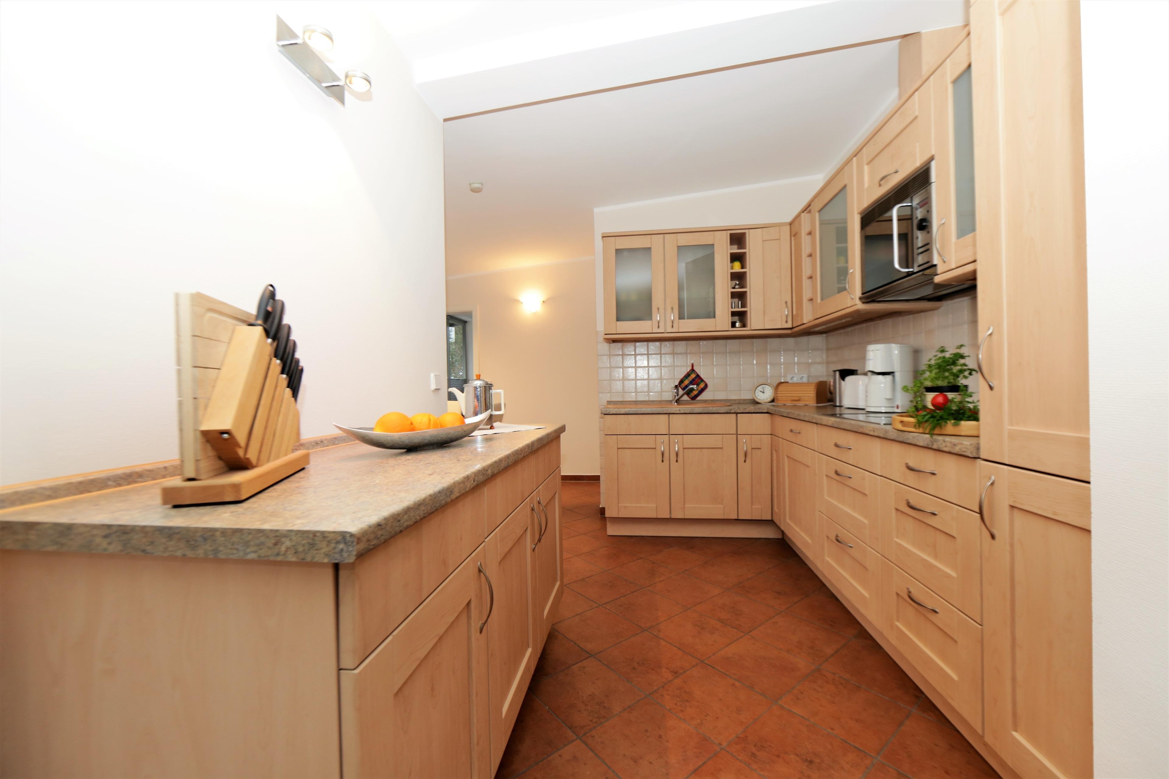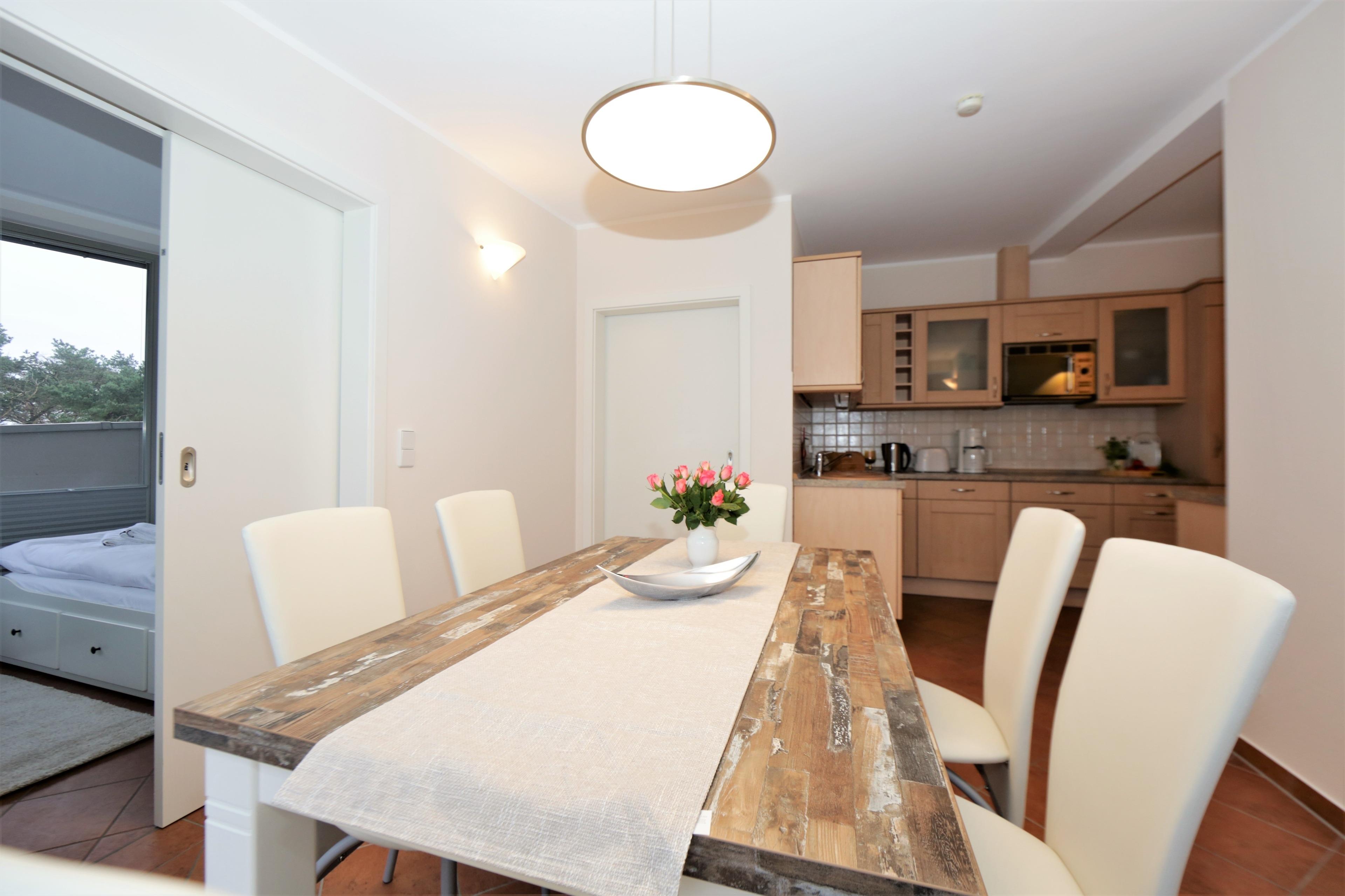 Diese 107 qm große 4-Zimmer Wohnung im 2. Obergeschoss erreichen Sie aus dem Keller über den Aufzug. Auf den drei Balkonen können Sie zu fast jeder Tageszeit die Sonne genießen. Der großzügige Wohnbereich mit seinen großen Glasfronten verfügt über eine gemütliche Sitzecke mit großem Flat-TV und Musikanlage. Von hier aus ist auch der größere Balkon zu betreten, der mit einem großen Tisch und Stühlen möbliert ist und zu gemeinsamen Mahlzeiten im Freien einlädt. Der angrenzende Essbereich mit einer modernen Vollküche incl. Spülmaschine, Ceranfeld, Kühlschrank, Mikrowelle etc. und einem Essplatz für 6 Personen ist ebenfalls offen im Wohnraum integriert. Vom Essplatz können Sie den angrenzenden Südbalkon betreten. Das große Schlafzimmer mit einem Bad en suite ist mit einem Doppelbett mit getrennten Matratzen (90 x 200) und genügend Schrankraum ausgestattet. Hier Steht Ihnen ein zweiter großer Flat TV zur Unterhaltung zur Verfügung und auch ein zusätzliches Kinderreisebett würde hier Platz finden. Das großzügige Bad verfügt über Dusche und Doppelwaschbecken/WC. Ein weiteres Schlafzimmer ist ebenfalls mit einem Doppelbett mit getrennten Matratzen (90x200), Stauraum und einem zusätzlichen TV eingerichtet. Von hier aus gelangt man ebenfalls auf den Südbalkon, der den Gästen ein wenig Zurückgezogenheit bietet. Das kleine Schlafzimmer ist mit einem Tandembett (jeweils 80x200) ausgestattet, dass je nach Bedarf bis zu 2 Personen einen Schlafplatz stellt. Das andere Bad ist mit einer großen ebenerdigen Dusche und Waschtisch/WC ausgestattet. Im Keller finden Sie eine Sauna, die den Gästen im Winterhalbjahr zur kostenfreien Nutzung zur Verfügung steht, ebenso einen Fahrradraum, Waschmaschine und Trockner.