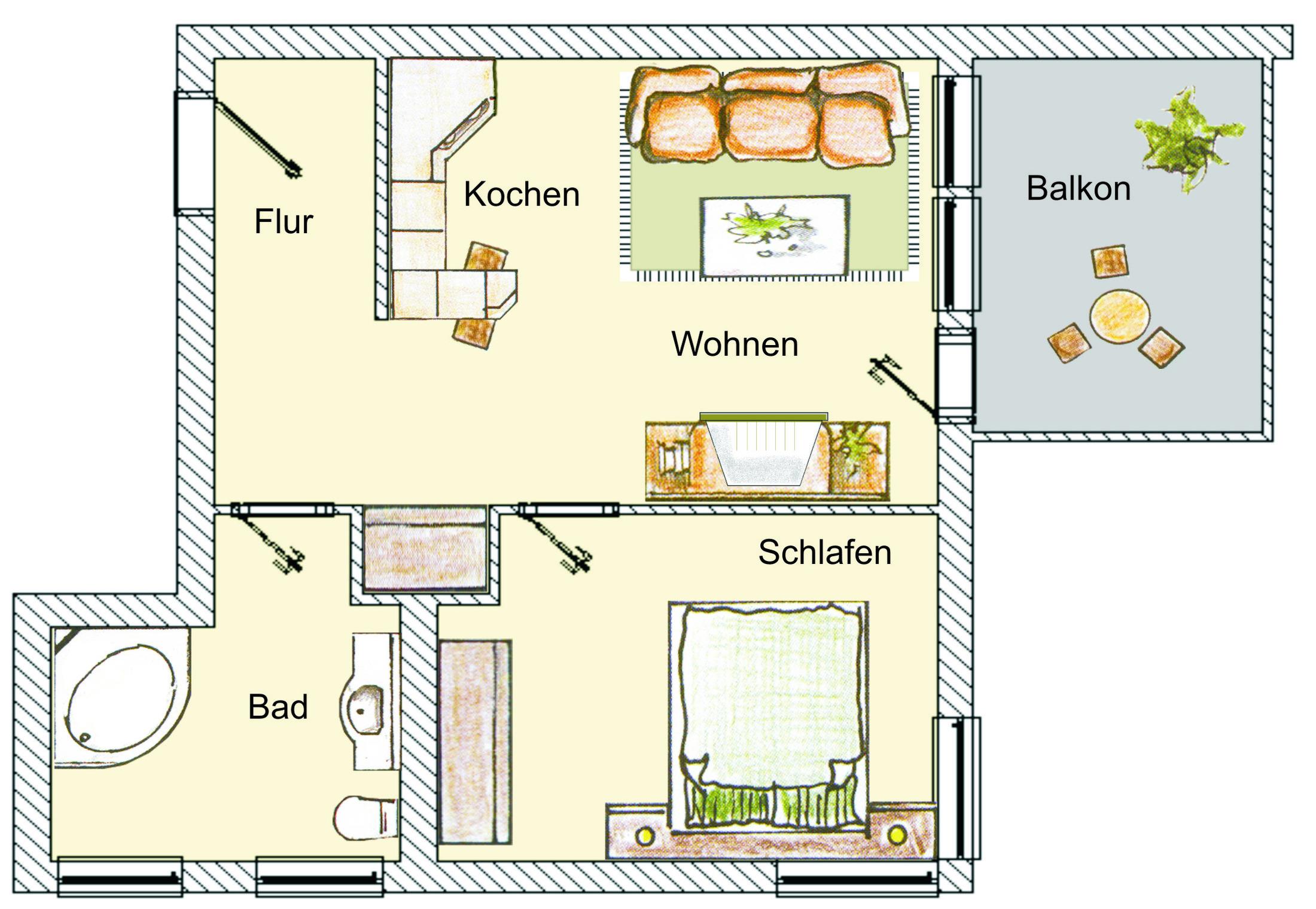 Diese liebevoll eingerichtete Zwei Zimmerwohnung ist 37 qm groß und liegt im 1. Obergeschoss. Der lichtdurchflutete Wohnraum mit seiner breiten Fensterfront ist mit einem Sofa, dass gleichzeitig die dritte Schlafgelegenheit bietet und einem Relaxsessel eingerichtet. Flat TV sowie Radio mit CD-Player sind selbstverständlich. Die Küchenzeile incl. Geschirrspüler, Kühlschrank, Cerankochfeld, Backofen p.p. und der angrenzende Essplatz sind ebenfalls offen im Wohnraum integriert. Das Schlafzimmer ist mit einem Doppelbett mit getrennten Matratzen (90x200) und einem Kleiderschrank eingerichtet. Das moderne Bad ist mit einer ebenerdigen Dusche sowie Waschtisch/WC ausgestattet. Ein Balkon zum Westen, der vom Wohnraum begehbar ist, rundet diese Wohnung ab. Im Keller finden Sie eine Sauna, die im Winterhalbjahr kostenfrei genutzt werden kann. Einen Fahrradraum und einen Waschraum mit Waschmaschine und Trockner steht den Gästen ebenfalls zur Nutzung zur Verfügung. Der Pkw-Stellplatz befindet sich auf dem abgeschlossenen Grundstück und ist der Wohnung zugeordnet.