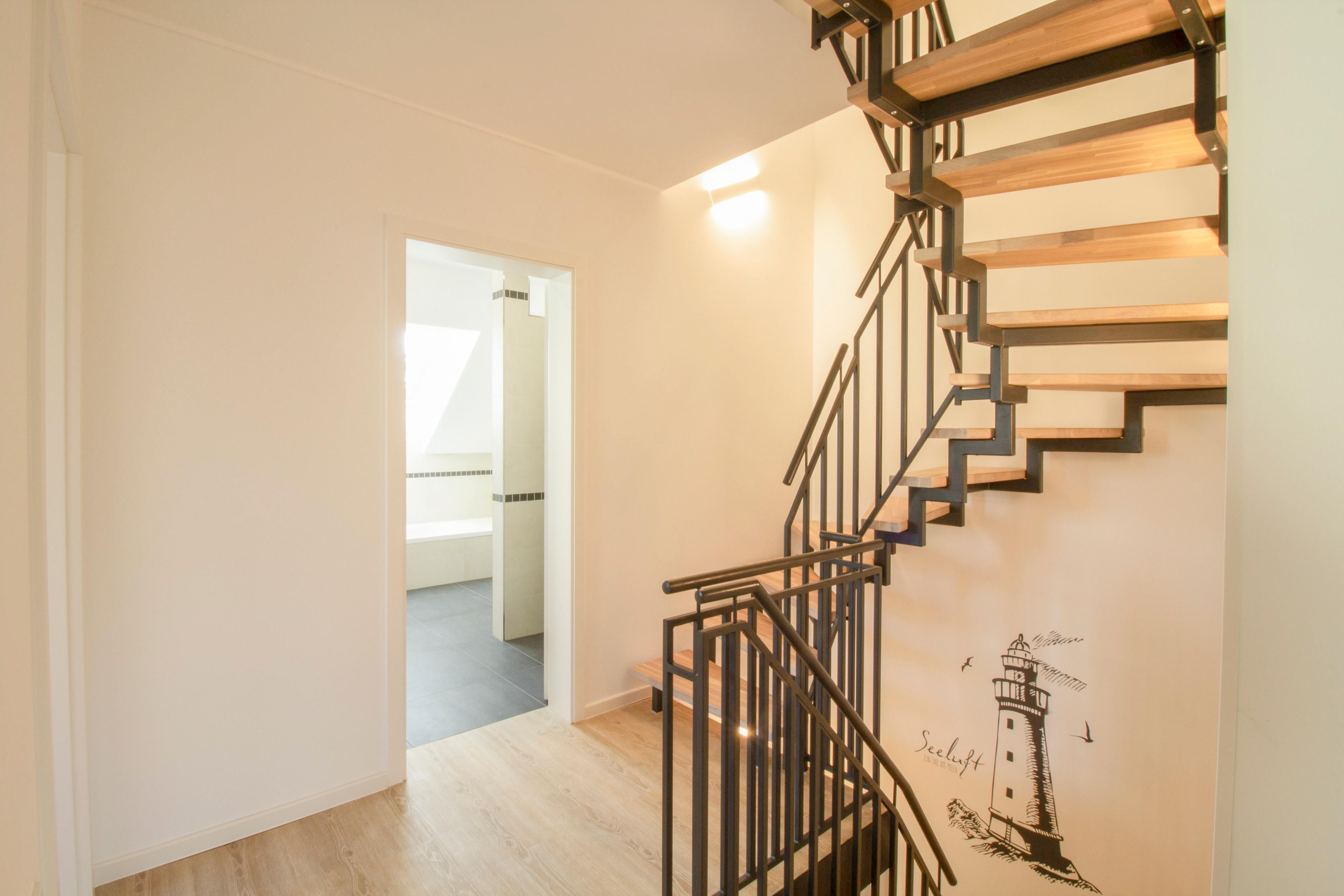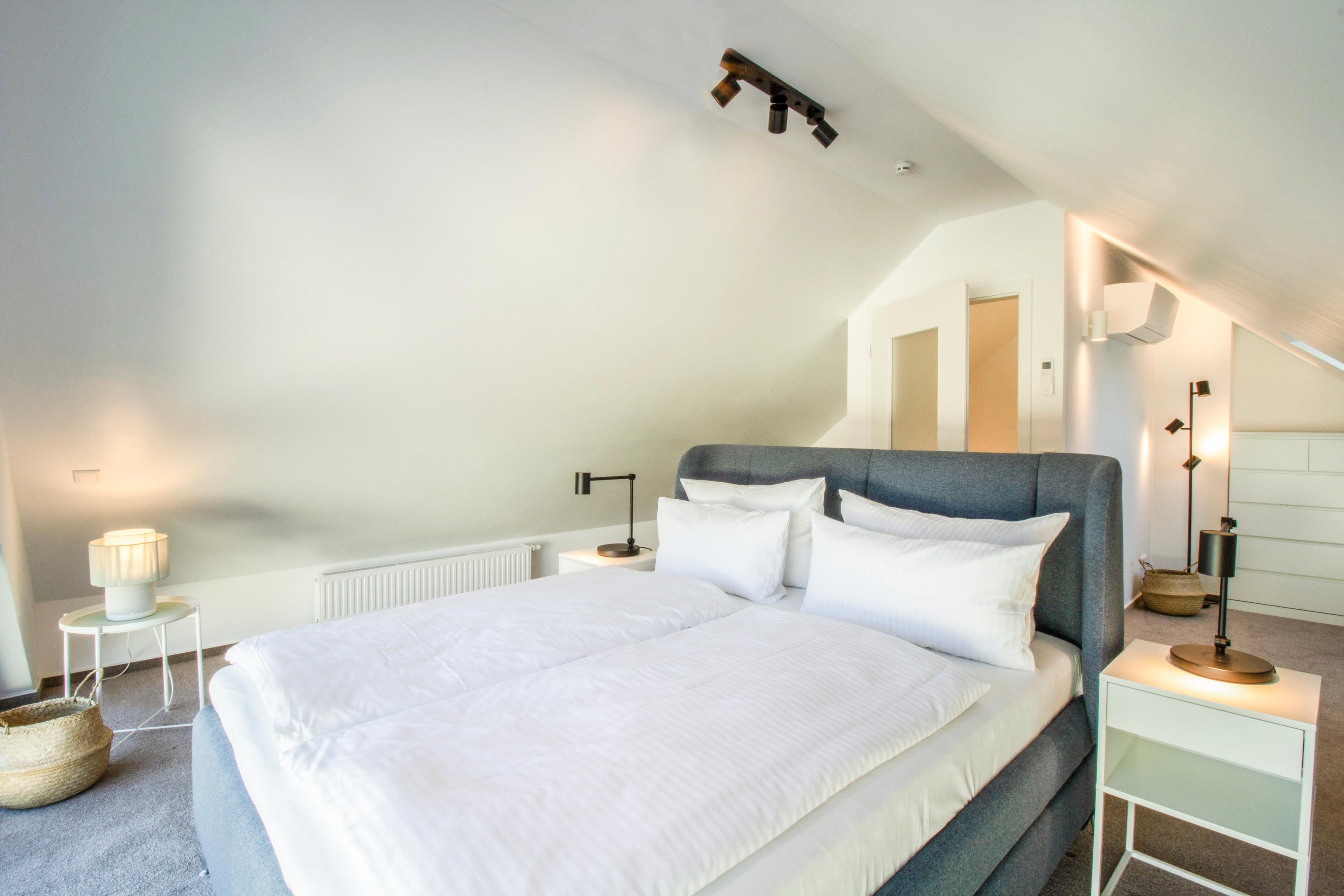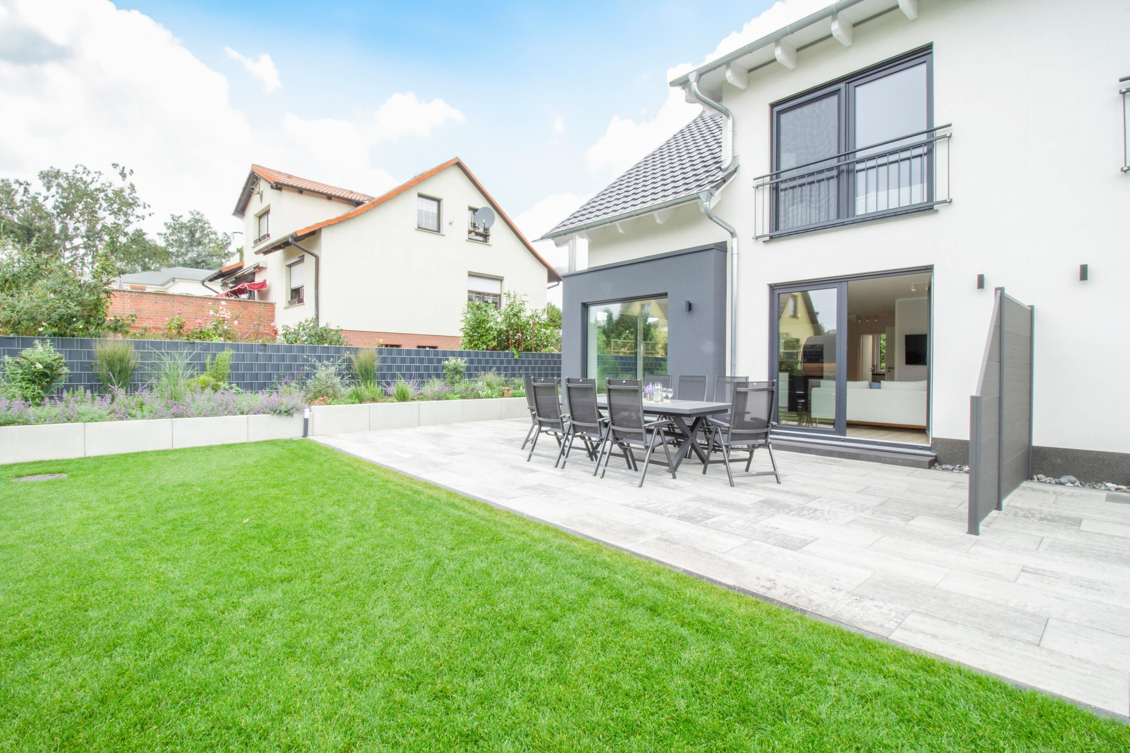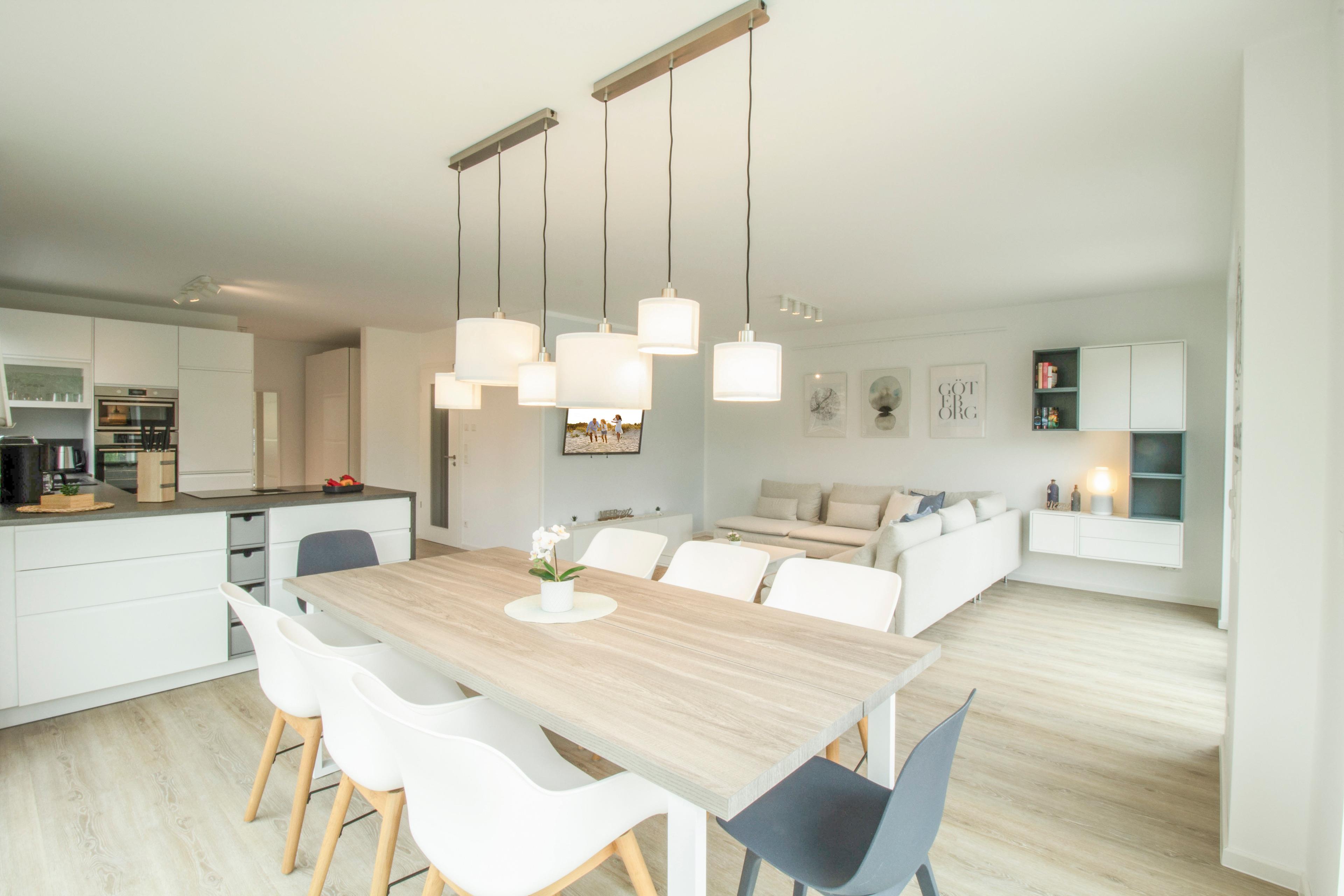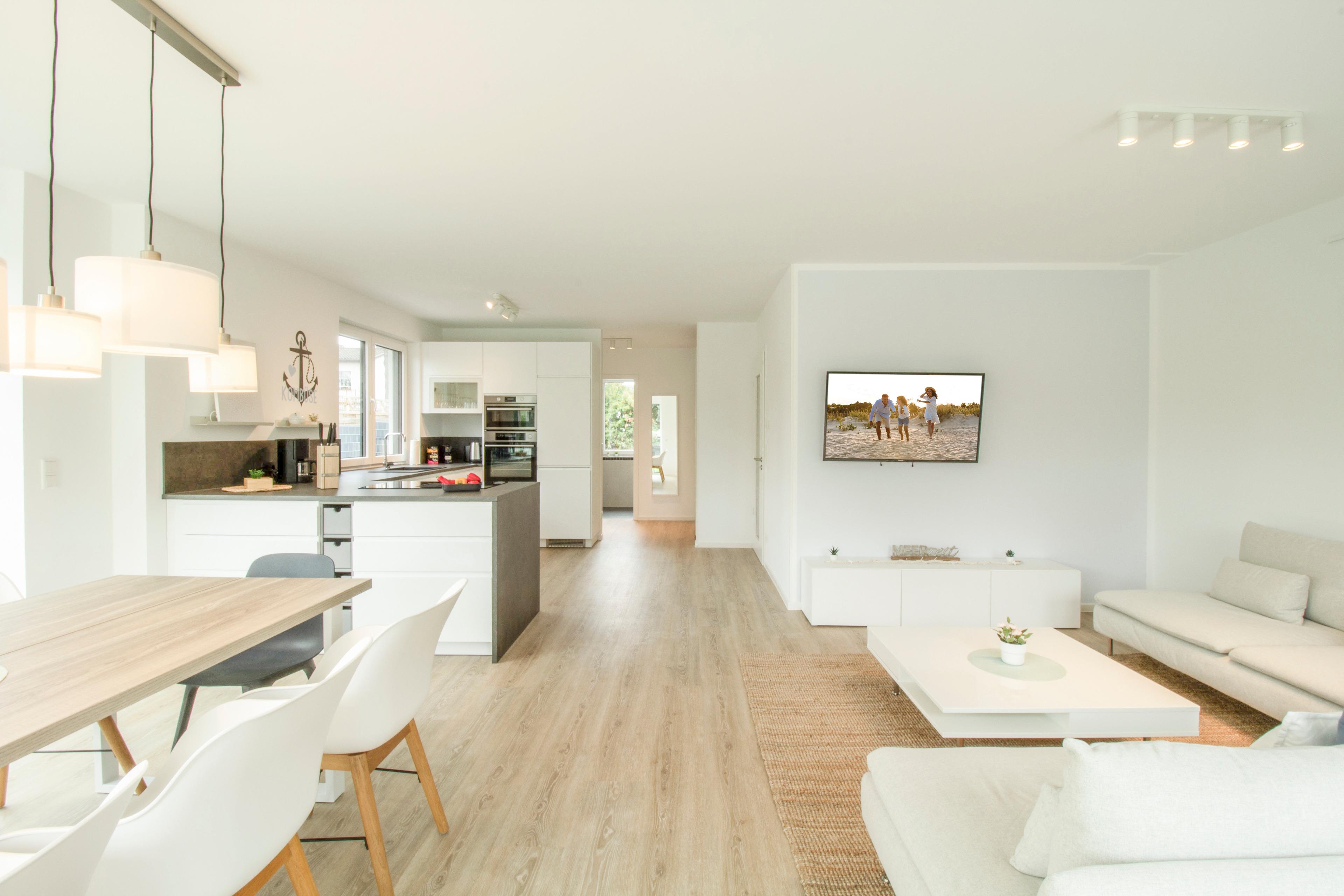 Herzlich willkommen in unserem exquisiten Ferienhaus "Up de Insel", einem wahrhaft modernen Rückzugsort für Ihre kommende Auszeit! Mit großzügigen 140 m2 Wohnfläche auf einem weitläufigen 1000 m2 Grundstück ist dieses neugebaute Domizil der Inbegriff von Luxus, Stil und Komfort. Schon beim Betreten dieser Oase wird Ihnen die hochmoderne, lichtdurchflutete Einrichtung ins Auge fallen, die eine einladende und entspannende Atmosphäre schafft. Die Klimaanlage in allen Räumen sorgt dafür, dass Sie stets eine angenehme Raumtemperatur genießen können, unabhängig von der Witterung. Der weitläufige Wohn- und Essbereich ist das Herzstück der Wohnung. Ein großer Esstisch für bis zu 8 Personen lädt zu gemeinsamen Mahlzeiten und geselligem Beisammensein ein. Ein gemütliches Ecksofa und ein Flachbildfernseher sorgen für unterhaltsame Abende. Die moderne Küche ist komplett ausgestattet und verfügt über einen großzügigen Geschirrspüler, Backofen, Mikrowelle und einem Induktionskochfeld mit integriertem Abzug. Hier können Sie Ihre kulinarischen Fähigkeiten entfalten und sich wie zu Hause fühlen. Vom Wohnbereich gelangen Sie auf die großzügige Terrasse, die von einem liebevoll gepflegten Garten umgeben ist. Hier finden Sie auch einen Elektrogrill, der perfekt für entspannte Grillabende im Freien ist. Die Saunaliebhaber unter Ihnen werden die Fasssauna lieben, die nach einem erlebnisreichen Tag pure Entspannung verspricht. Im Obergeschoss und im Studio unter dem Dach erwarten Sie vier wundervolle Schlafzimmer – drei mit gemütlichen Boxspringbetten (1,60 m x 2 m) und eines mit zwei Einzelbetten (0,90 m x 2 m) – alle liebevoll gestaltet, um Ihnen erholsame Nächte zu bescheren. Für Ihr absolutes Wohlbefinden stehen zwei Badezimmer zur Verfügung. Das großzügige Obergeschoss beherbergt ein luxuriöses Badezimmer mit ebenerdiger Dusche, einer großzügigen Badewanne und einem Doppelwaschtisch. Im Erdgeschoss finden Sie ein weiteres Bad mit Dusche für zusätzlichen Komfort. Für Ihre Fahrzeuge stehen zwei komfortable Parkplätze zur Verfügung. Wenn Sie die Region gerne auf zwei Rädern erkunden, bieten wir Ihnen die Möglichkeit, Ihre Fahrräder und E-Bikes in einem modern gestalteten Container sicher aufzubewahren und aufzuladen.