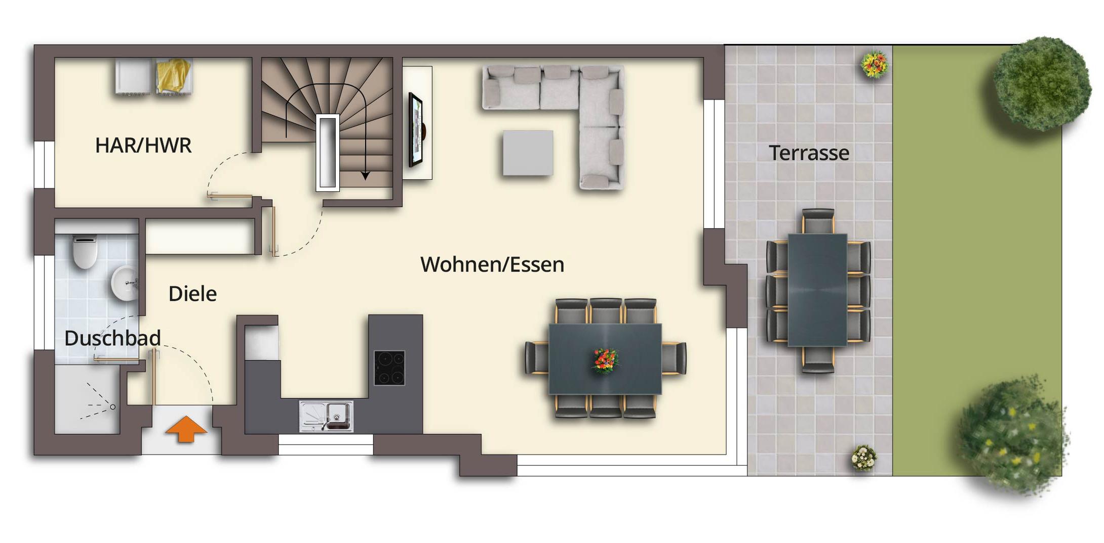 Die großzügige Terrasse mit angrenzendem Rasen lädt dazu ein, entspannte Stunden im Freien zu verbringen. Und für das absolute Wohlfühlerlebnis haben wir eine Fasssauna für Sie bereitgestellt. Genießen Sie nach einem aktiven Tag an der Ostsee die wohlige Wärme und lassen Sie die Seele baumeln.