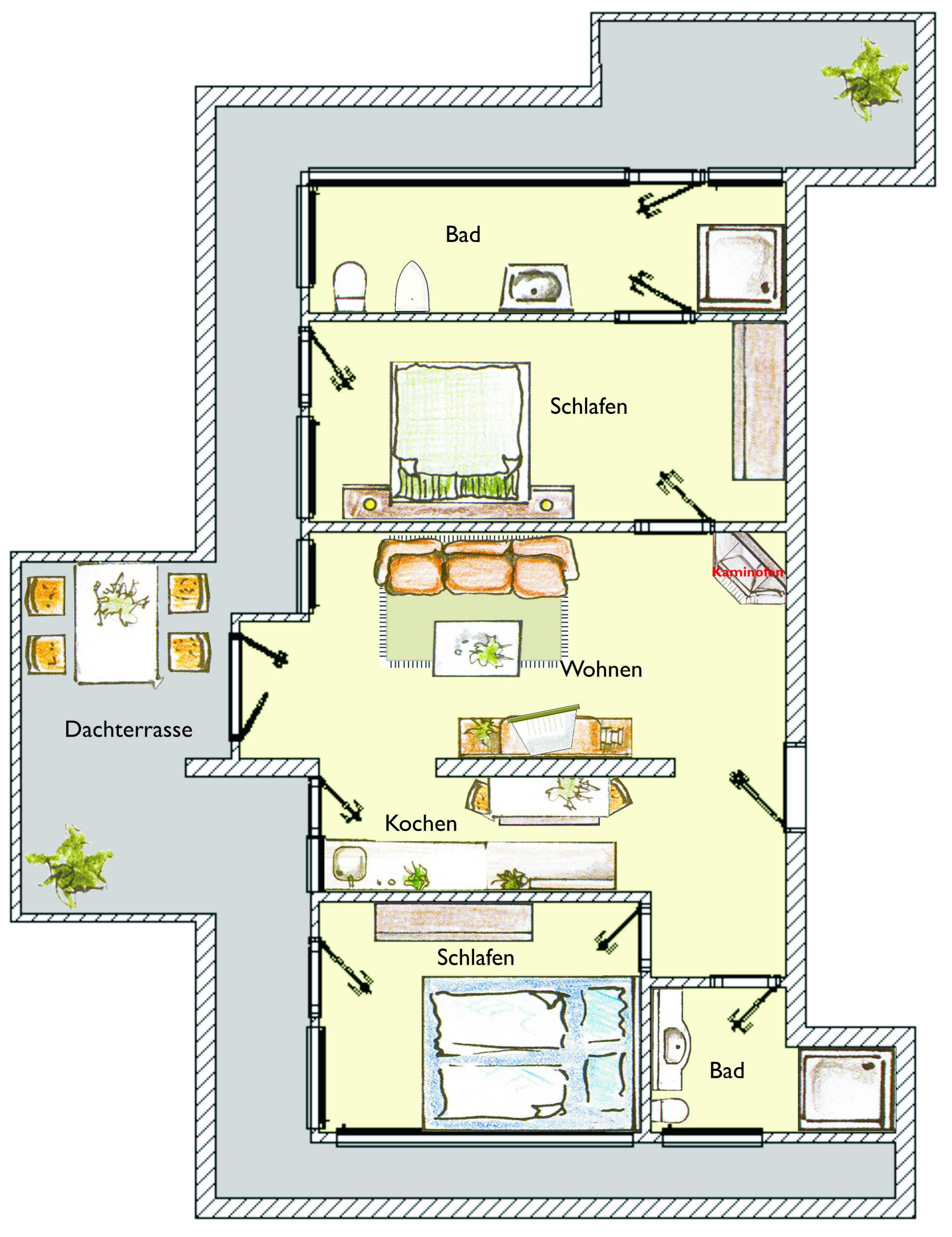 Dieses 74 qm große Penthouse im 2. Obergeschoss erreichen Sie aus dem Keller über den Aufzug. Auf dem umlaufenden Balkon können Sie zu jeder Tageszeit die Sonne genießen. Der helle modern eingerichtete Wohnbereich verfügt über eine Sitzecke mit TV, sowie große Glasfronten. Die vom Wohnbereich leicht abgetrennte Küche ist mit Geschirrspüler, Cerankochfeld, Backofen und Dampfgarer, sowie einem Essplatz für bis zu 4 Personen ausgestattet. Das große Schlafzimmer mit Bad en suite ist mit einem Doppelbett, mit getrennten Matratzen, und genügend Schrankraum ausgestattet. Beide Bäder verfügten über eine Dusche, Waschtisch und WC. Das kleinere Schlafzimmer ist mit einem Doppelbett, sowie einem Kleiderschrank eingerichtet. Im Keller finden Sie eine Sauna, einen Fahrradraum, Waschmaschine und Trockner. Der Pkw-Stellplatz befindet sich auf dem abgeschlossenen Grundstück und ist der Wohnung zugeordnet.