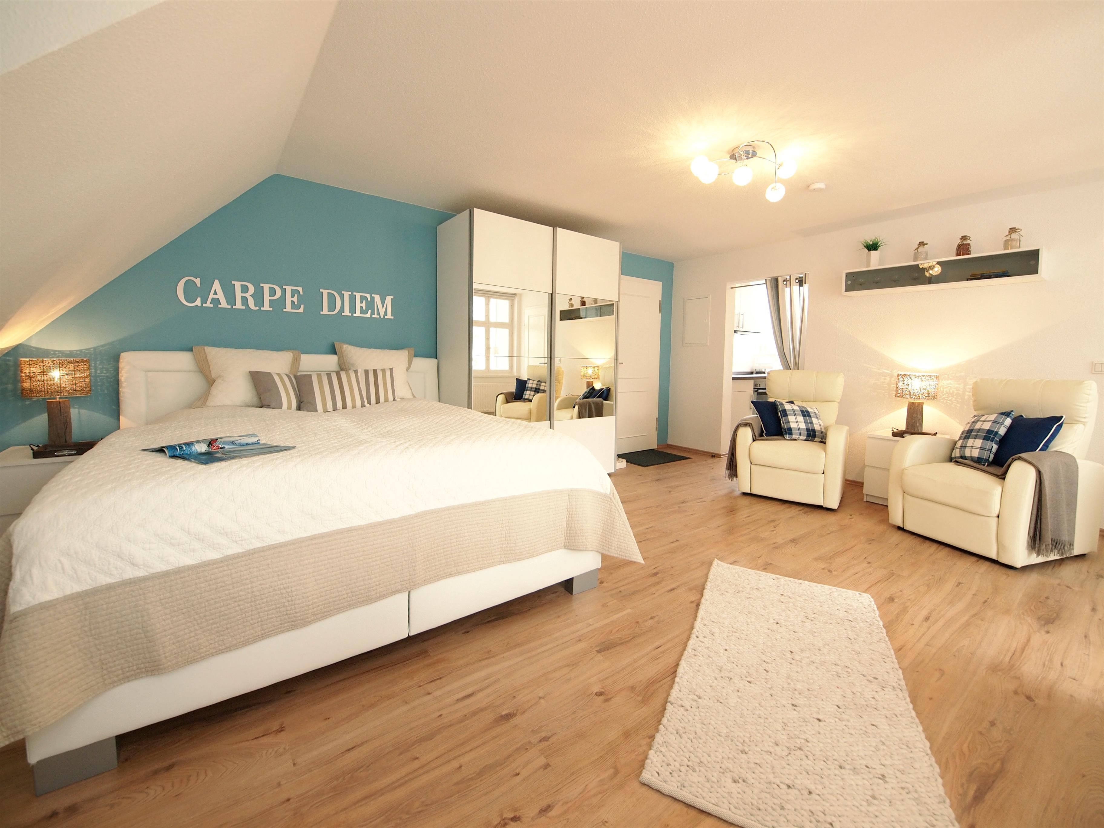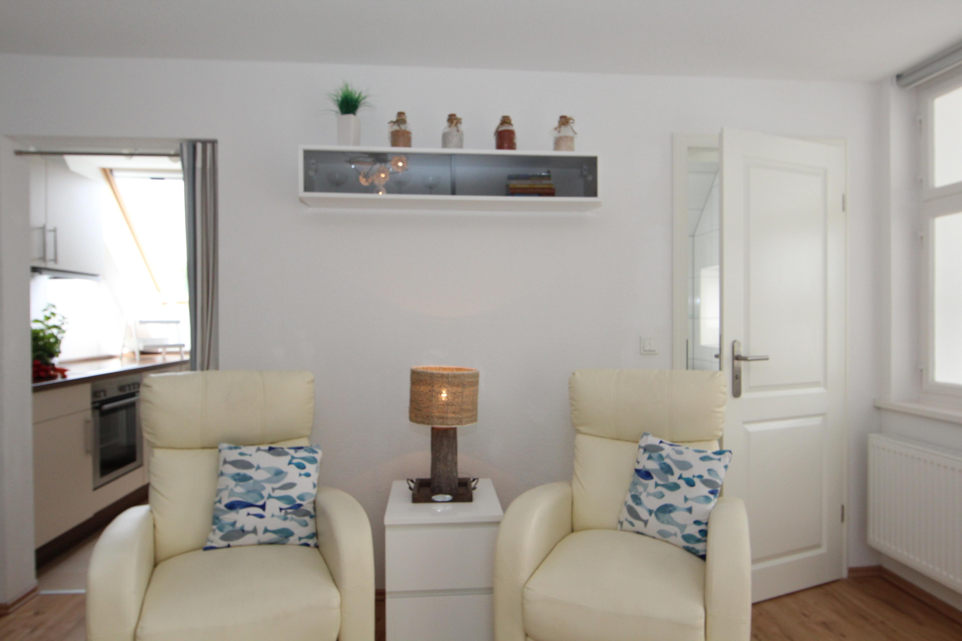 "Carpe Diem" - Genieße den Tag. Diese gemütliche 1-Raum-Wohnung liegt im 2. Obergeschoß der Villa Emmi. In allen Bereichen wurde sie liebevoll im maritimen Stil eingerichtet. Im Wohn- und Schlafbereich befinden sich zwei bequeme Fernsehsessel mit TV-Ecke sowie ein komfortables Doppelbett mit einem geräumigen Kleiderschrank. In der separaten, geschlossenen Loggia (Fenster lassen sich öffnen) können Sie bei einem leckeren Frühstück in den Tag starten. Die ebenfalls räumlich abgetrennte Küche ist mit Ceranherd, Mikrowelle, Kühlschrank, Geschirrspüler, Toaster, Kaffeemaschine etc ausgestattet.