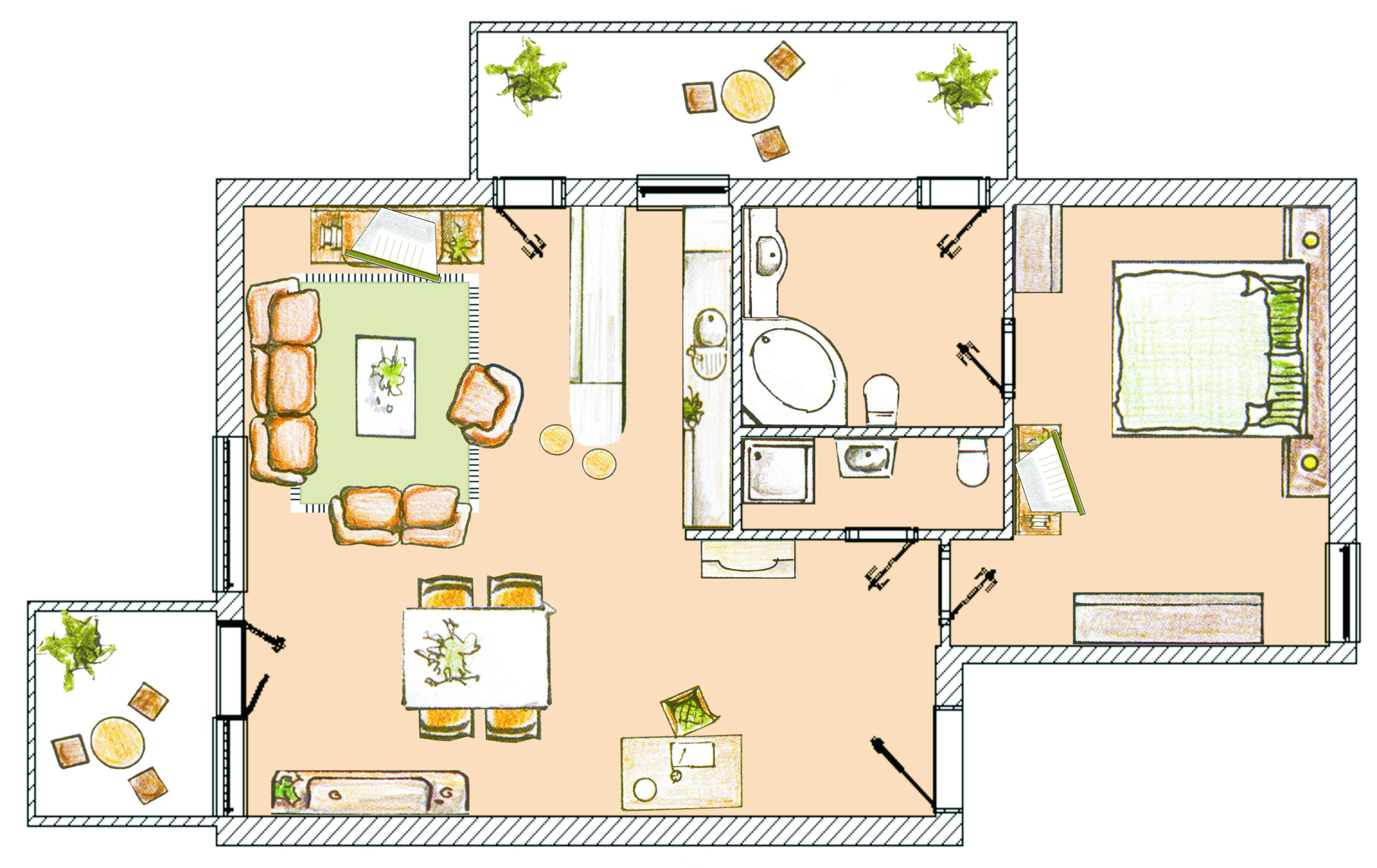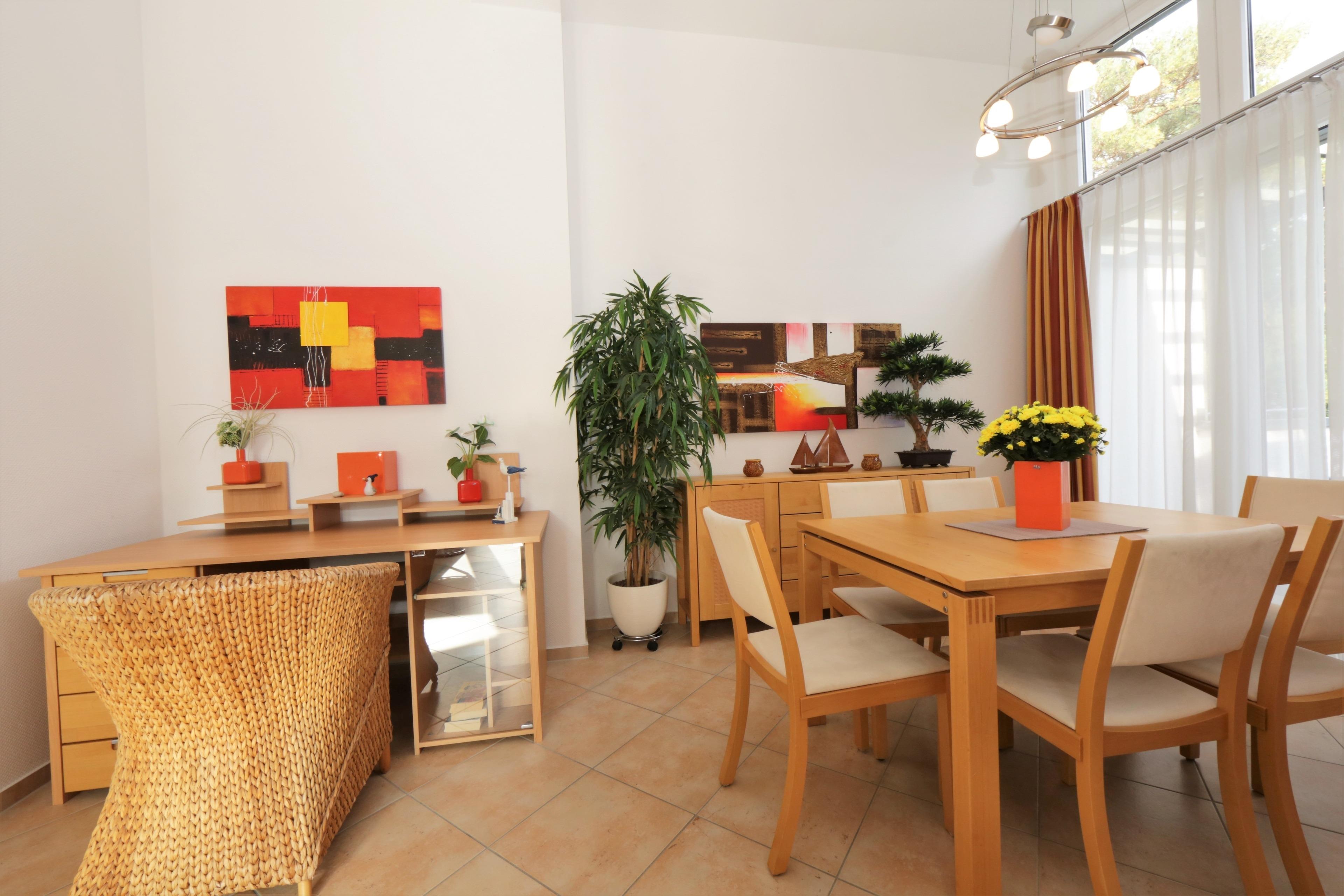 Diese 80 qm große 2-Zimmer Wohnung im Dachgeschoss erreichen Sie über den Aufzug. Der großzügige Wohnbereich mit reichlich Fenstern verfügt über eine gemütliche Sitzecke mit großem Flat-TV und Musikanlage. Die moderne Vollküche incl. Spülmaschine, Ceranfeld, Backofen, Kühlschrank, Mikrowelle etc. bietet viel Platz. Ein Essplatz für 6 Personen ist ebenfalls offen im Wohnraum integriert. Vom Essplatz können Sie den angrenzenden Seebalkon betreten, von dem aus Sie durch die Kiefern einen Blick auf die Ostsee erhaschen können. Am Schreibtisch können Sie Ihre Ansichtskarten mit Urlaubsgrüßen versehen. Das große Schlafzimmer mit einem Bad en suite ist mit einem Doppelbett mit getrennten Matratzen (90 x 200) und genügend Schrankraum ausgestattet. Hier steht Ihnen ein zweiter Flat TV zur Unterhaltung zur Verfügung. Das großzügige Bad verfügt über Badewanne und Waschtisch/WC. Vom Bad als auch aus der Küche können Sie den kleineren Ostbalkon betreten, der am Vormittag viel Sonne verspricht. Das zweite Bad erreichen Sie aus der Diele, es ist mit Dusche und Waschtisch/WC ausgestattet. Ein PKW-Stellplatz steht Ihnen auf dem abgeschlossenen Grundstück zur Verfügung. Ein Abstellraum für Fahrräder und ein Waschraum mit Waschmaschine und Trockner sind im Keller vorhanden (Münzbetrieb). Im Nachbarhaus "Villa Darja" erreichen Sie die Wellness-Räume mit Sauna (Münzbetrieb).