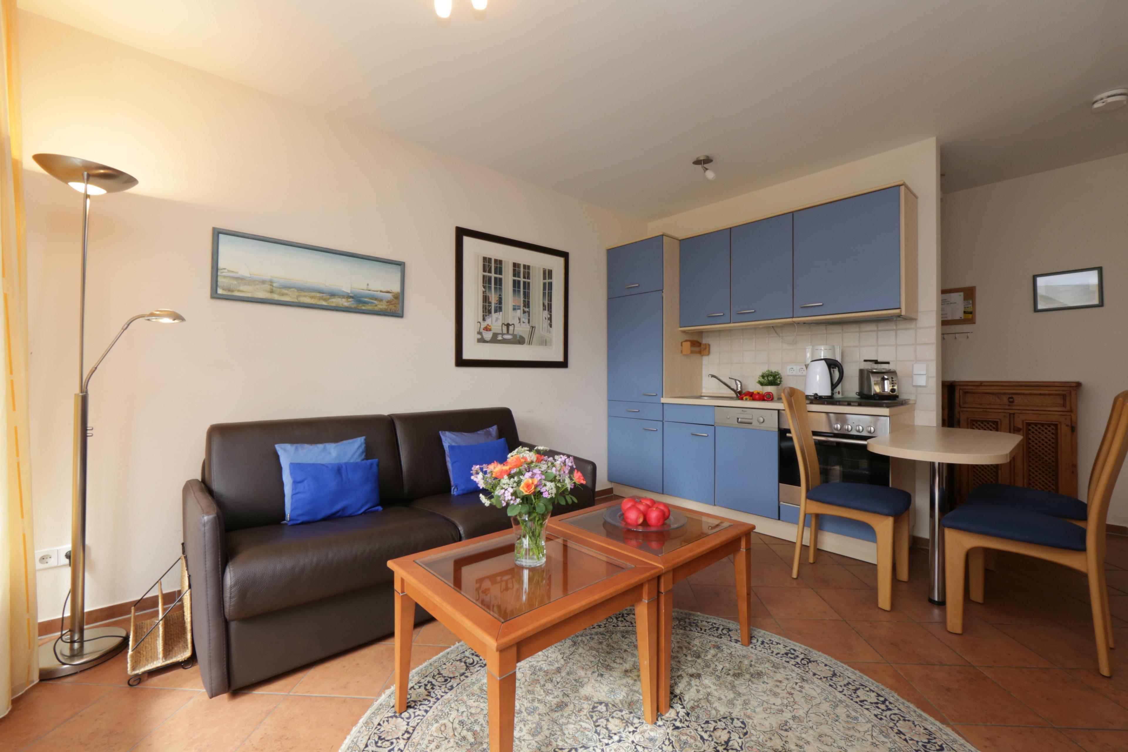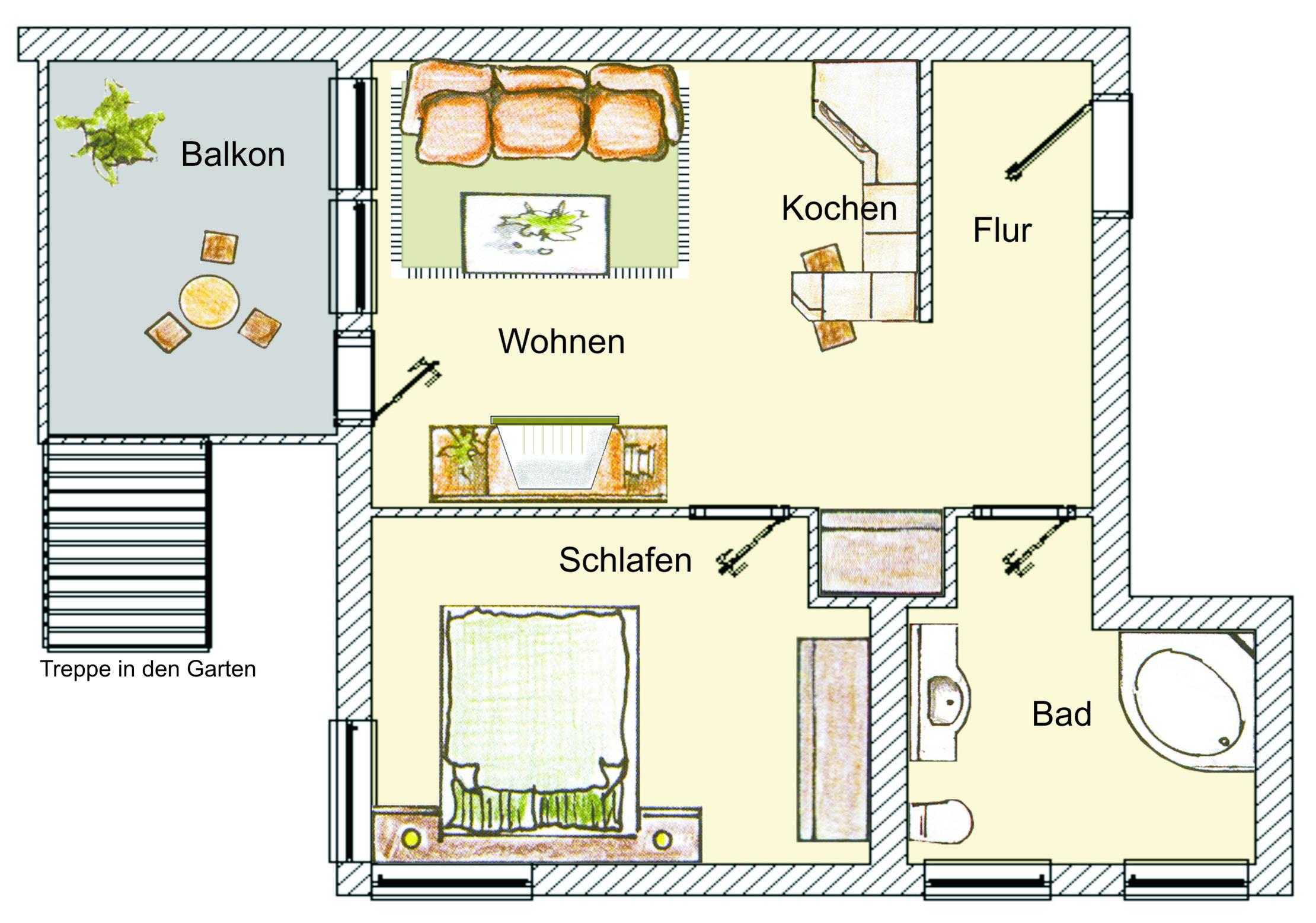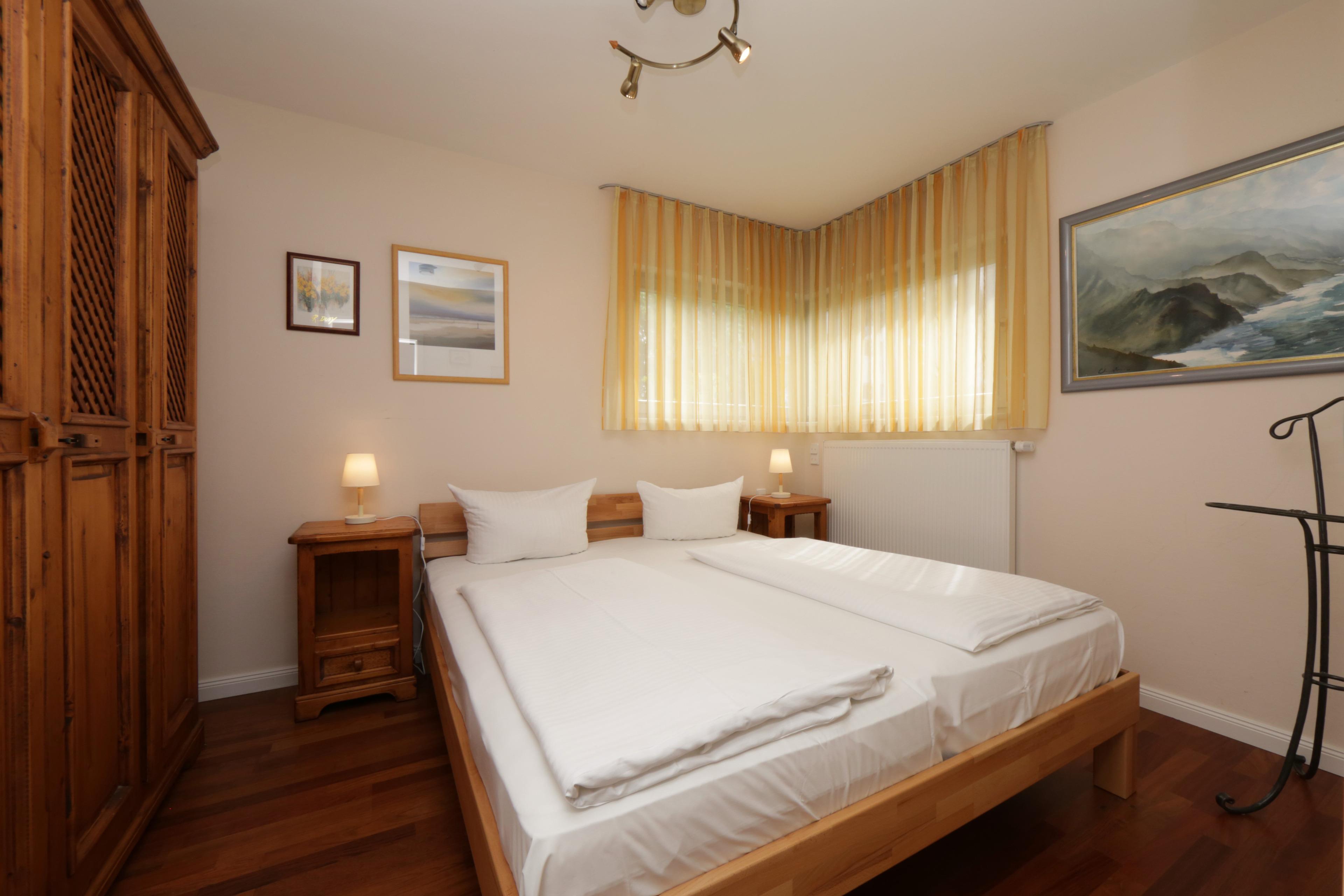 Diese 37 qm große Zwei-Zimmer Wohnung liegt im Erdgeschoss und ist für zwei Personen und maximal eine Aufbettung geeignet. Der Wohnraum beherbergt ein gemütliches Sofa mit Couchtisch, sowie einen antiken Sekretär, Flat TV und Radio. Eine komfortable Pantryküche mit dem angrenzenden Essplatz ist ebenfalls im Wohnraum integriert. In der Küche stehen den Gästen Kühlschrank, Geschirrspüler, Ceranfeld mit Backofen und Kaffeemaschine, Toaster und Wasserkocher zur Verfügung. Ein vom Wohnraum begehbarer überdachte Balkon ist zum Osten ausgerichtet und lockt die Gäste schon zum Frühstück ins Freie. Das Schlafzimmer ist mit einem Doppelbett mit getrennten Matratzen (90 x 200) und reichlich Schrankraum eingerichtet. Das moderne Bad mit Fenster ist mit Echtglasdusche und Waschtische/WC ausgestattet. Im Keller finden Sie eine Sauna, die im Winterhalbjahr zu bestimmten Tagen kostenfrei zur Verfügung steht. Ein Fahrradraum sowie Waschmaschine und Trockner befinden sich ebenfalls im Keller. Der Pkw-Stellplatz befindet sich auf dem abgeschlossenen Grundstück und ist der Wohnung zugeordnet. In diesem Appartement sind Haustiere willkommen.