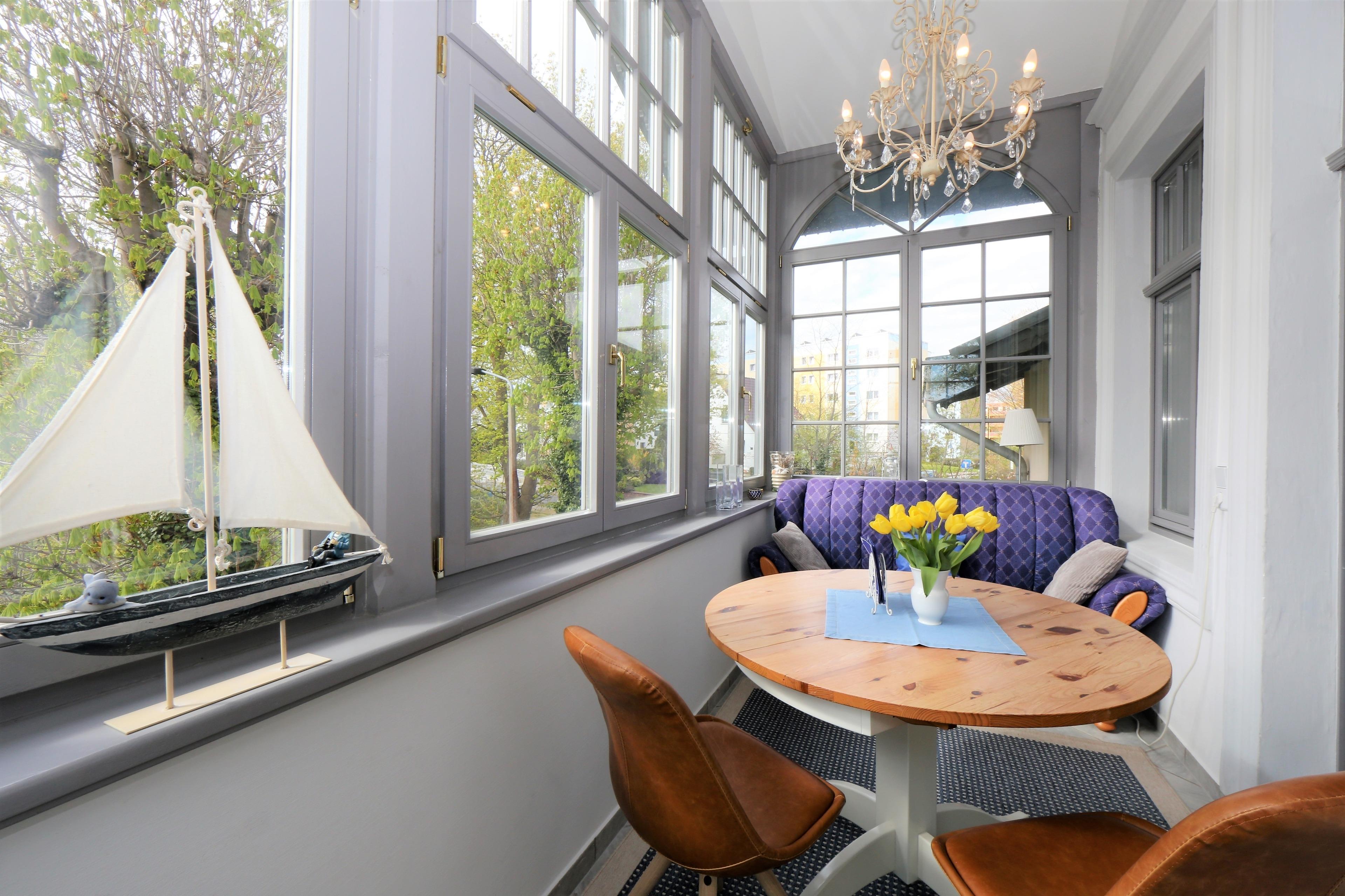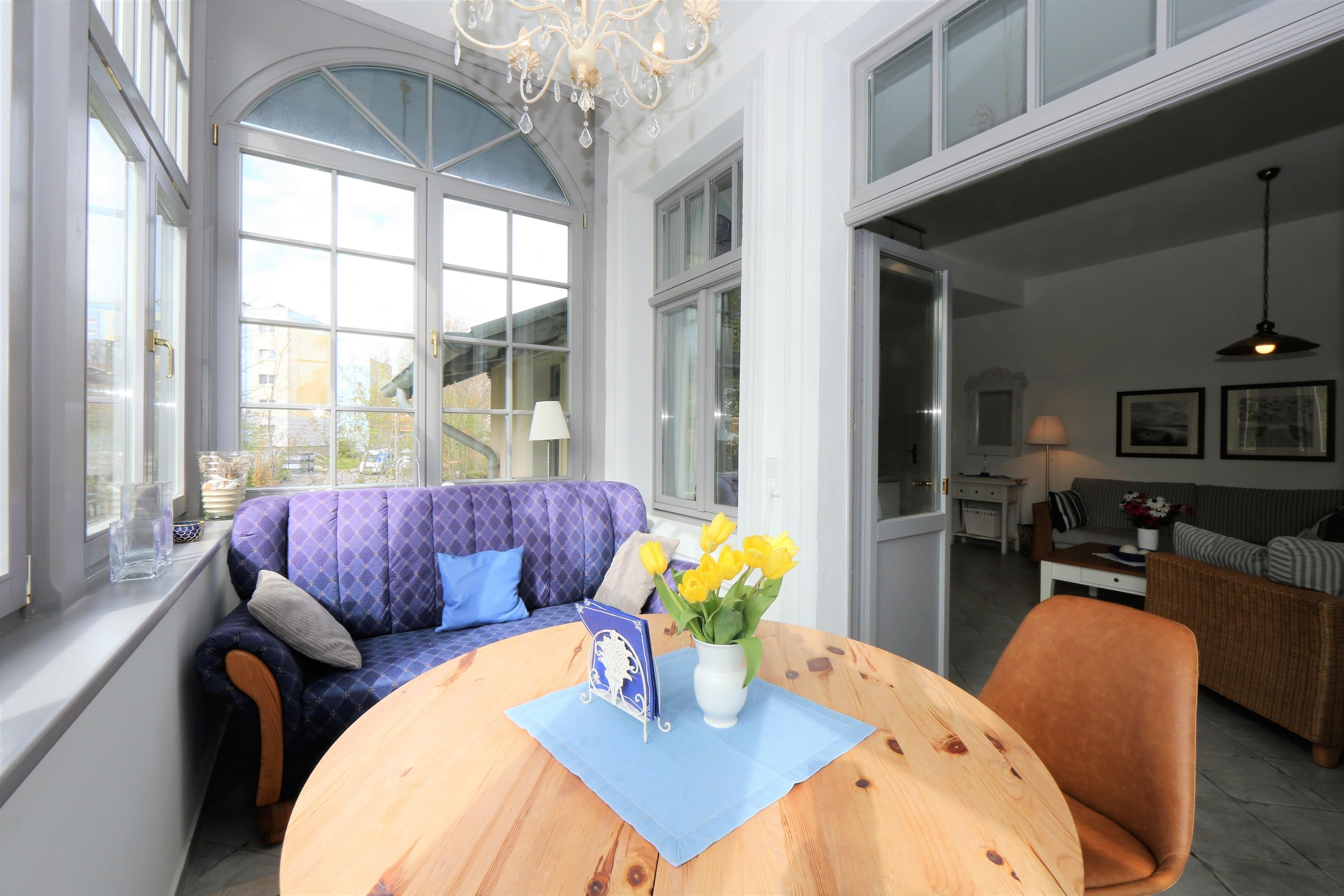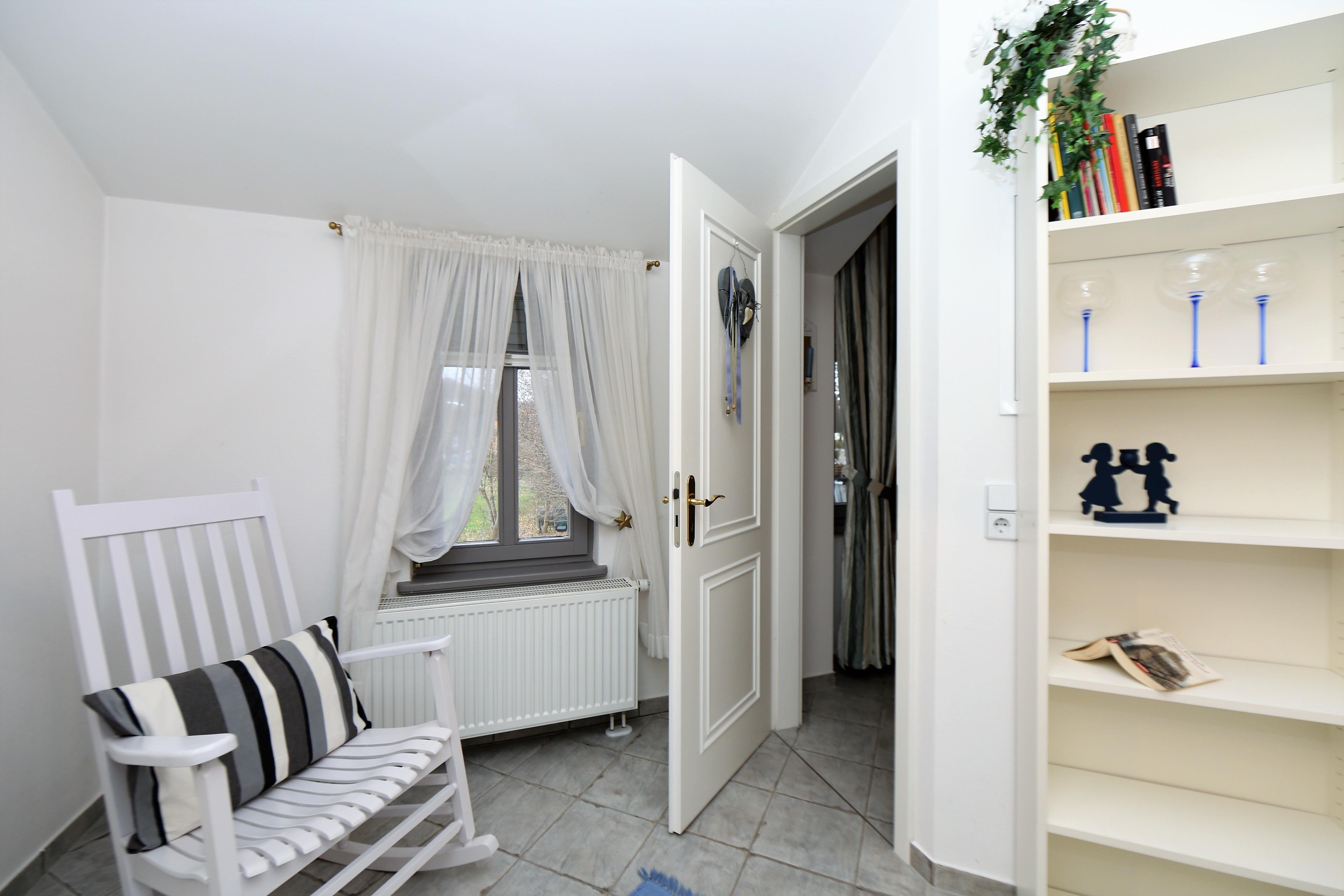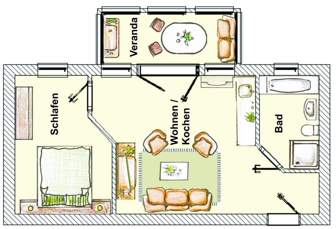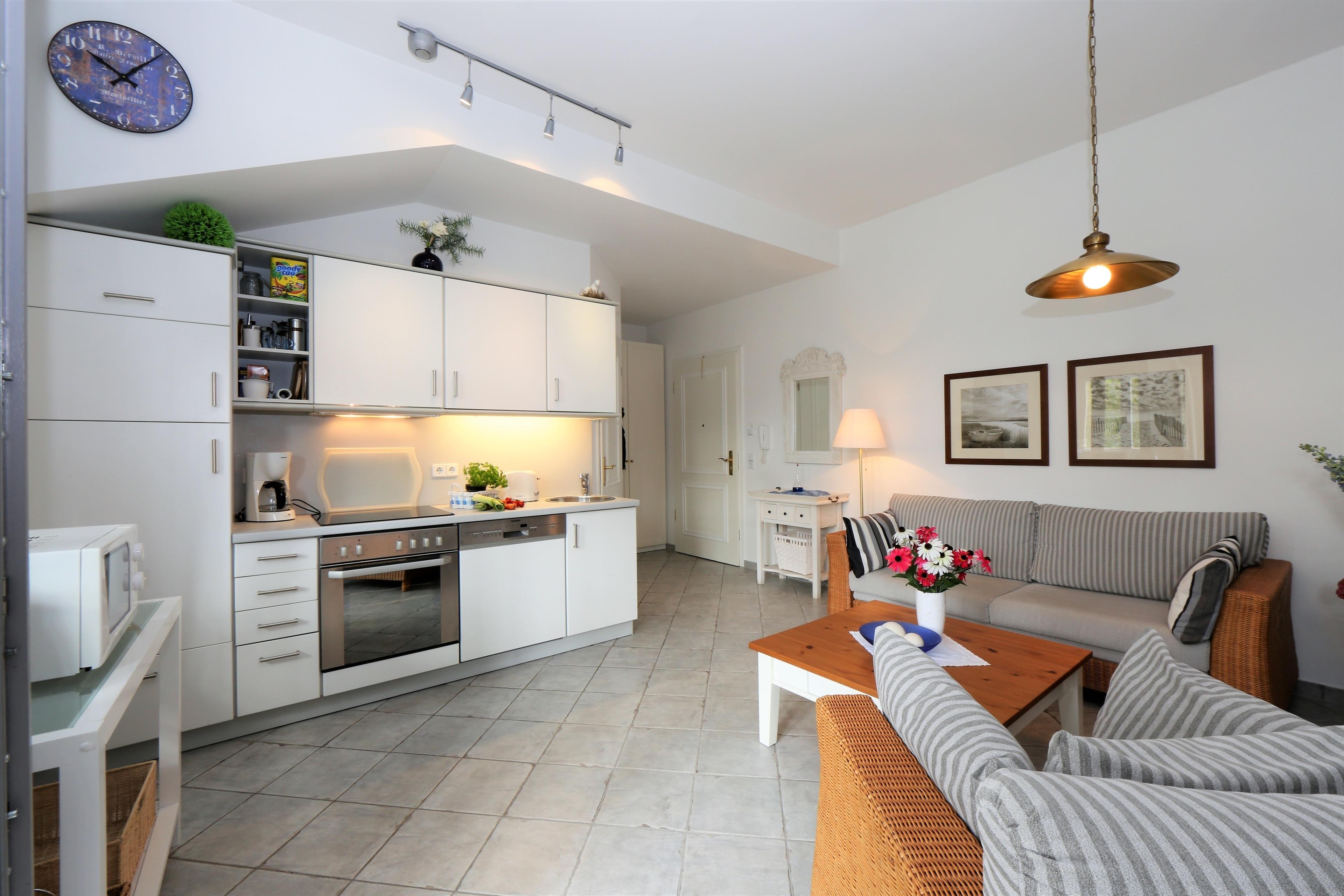 Dieses hochwertig und mit viel Liebe eingerichtete 53 qm große 2-Zimmer-Appartement liegt im 1. Obergeschoss und eignet sich für 2 bis 3 Personen. Der helle Wohnraum ist mit einer gemütlichen Sitzecke (mit Schlaffunktion 160 x 200) und Flat TV eingerichtet. Die Vollküche incl. Geschirrspüler, Cerankochfeld, Backofen, Mikrowelle, Kühlschrank etc. ist ebenfalls offen im Wohnraum integriert. Der Essplatz befindet sich in der hellen südlich ausgerichteten, geschlossenen Loggia (Fenster lassen sich öffnen), die direkt an den Wohnraum grenzt. Hier lädt ein zusätzliches Sofa zum Lesen und Relaxen ein. Das großzügige Schlafzimmer verfügt über ein Doppelbett mit getrennten Matratzen (90 x 200) und einen großen Kleiderschrank. Nach einer erholsamen Nacht lädt hier ein Schaukelstuhl zum Weiterträumen ein. Das Bad bietet seinen Gästen sowohl Dusche als auch Badewanne sowie Waschbecken/WC und ist mit einem Fenster ausgestattet.