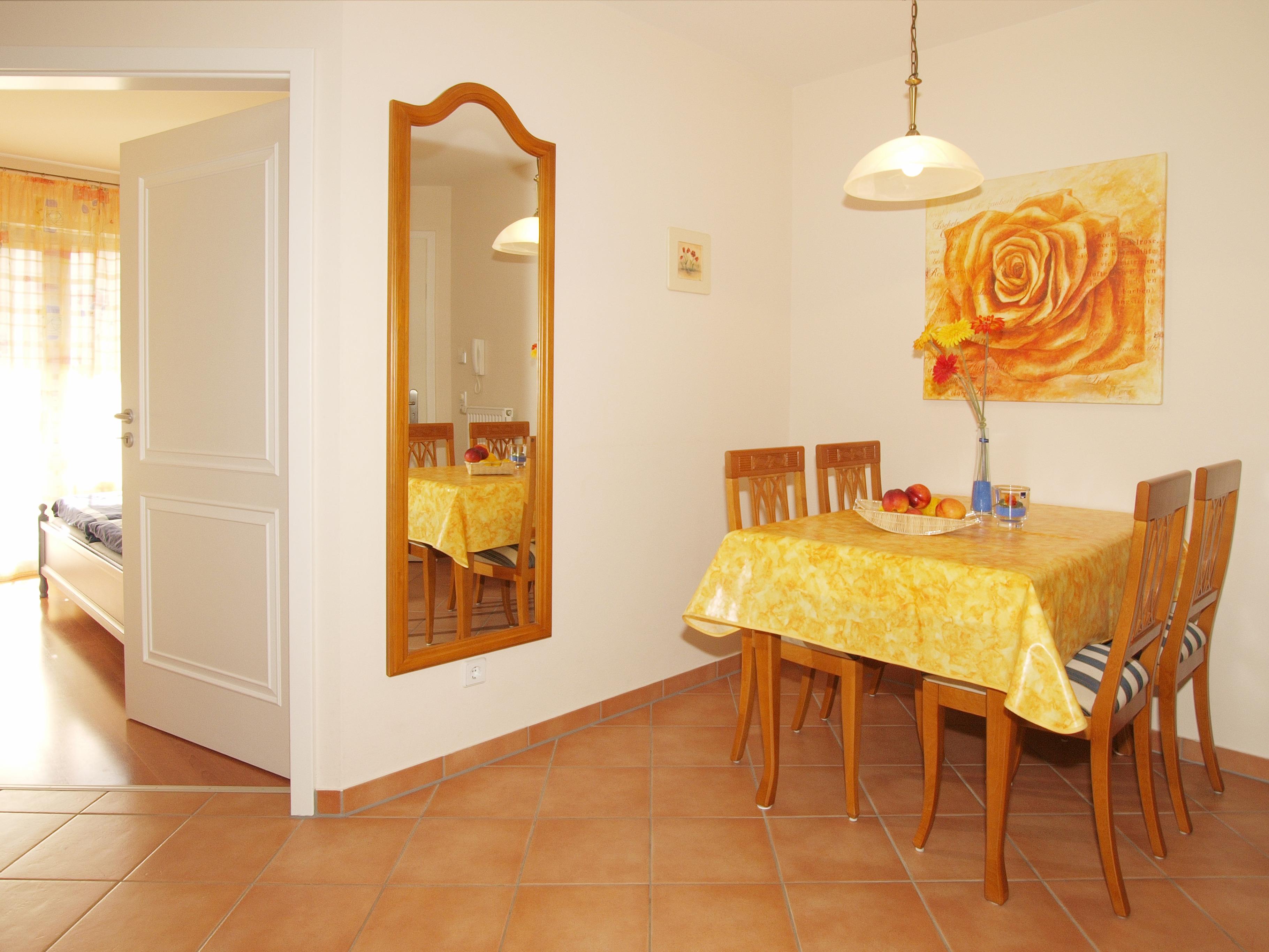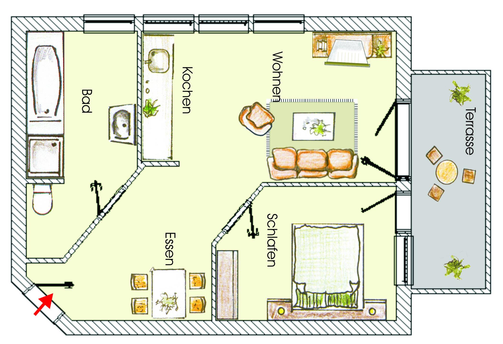 Dieses 45 qm große 2-Zimmer Appartement im Erdgeschoss eignet sich für 2 bis 3 Personen. Im Wohnzimmer finden Sie eine gemütliche Couchecke mit Radio/TV sowie einen separaten Essplatz. Von hier aus können Sie auch die Terrasse zum Hof/Parkplatz mit südöstlicher Ausrichtung begehen. Die Vollküche mit Geschirrspüler, Cerankochfeld, Mikrowelle pp. ist ebenfalls offen im Wohnraum integriert. Das Schlafzimmer ist mit einem Doppelbett mit getrennten Matratzen 0,90 x 2,00 m, einem Kleiderschrank und einem TV ausgestattet. Die zusätzliche Person findet ihren Schlafplatz auf dem Sofa. Das Bad bietet Dusche, Badewanne, Waschtisch und WC. Der Pkw-Stellplatz befindet sich auf dem Grundstück. Im Keller finden Sie einen Fahrrad-Abstellraum, Münzwaschmaschine und Münztrockner.