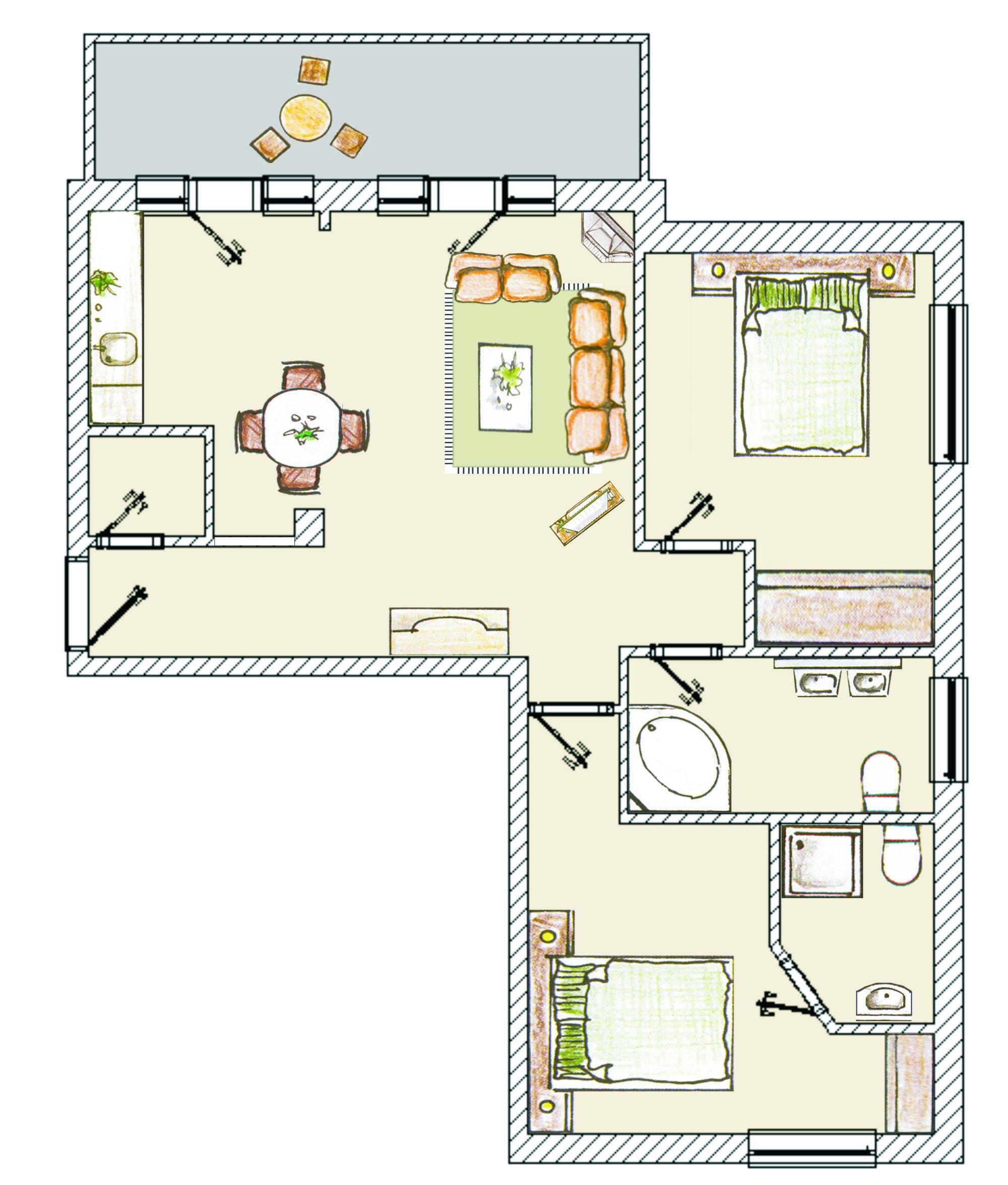 In dieser 78 qm großen 3-Zimmer Wohnung hat der Eigentümer sich zu einer liebevollen Symbiose zwischen modernem Wohnkomfort und geschmackvollen Antiquitäten entschieden. Die Wohnung befindet sich im 2. Obergeschoss – die Lage des Hauses spricht für sich. Die gesamte Wohnung ist mit Echtholzparkett belegt. Der geräumige halboffene Wohnbereich ist mit einer gemütlichen Couchecke mit kleinerem Flat-TV und einem großen Essplatz für 4 Personen eingerichtet. Die offene moderne Vollküche mit Ceranfeld, Backofen/Mikrowellenkombi, Kühlschrank. Spülmaschine etc. ist ebenfalls im Wohnraum integriert. Der Balkon, der von der Küche begehbar ist, ist zum Nordosten ausgerichtet und bietet den Gästen einen traumhaften Ostseeblick bis zur Bansiner Seebrücke und dem Langen Berg. Die Wohnung ist mit zwei Schlafzimmern, 1x mit einem Doppelbett mit getrennten Matratzen 0,80 x 2,00 m und 1x mit zwei zusammengestellten Einzelbetten sowie jeweils einem großen Kleiderschrank ausgestattet. Zwei Bäder bieten Badewanne oder Dusche mit Waschtisch und WC. Der Pkw- Stellplatz befindet sich auf dem Grundstück. Waschmaschine und Trockner finden Sie im Keller.