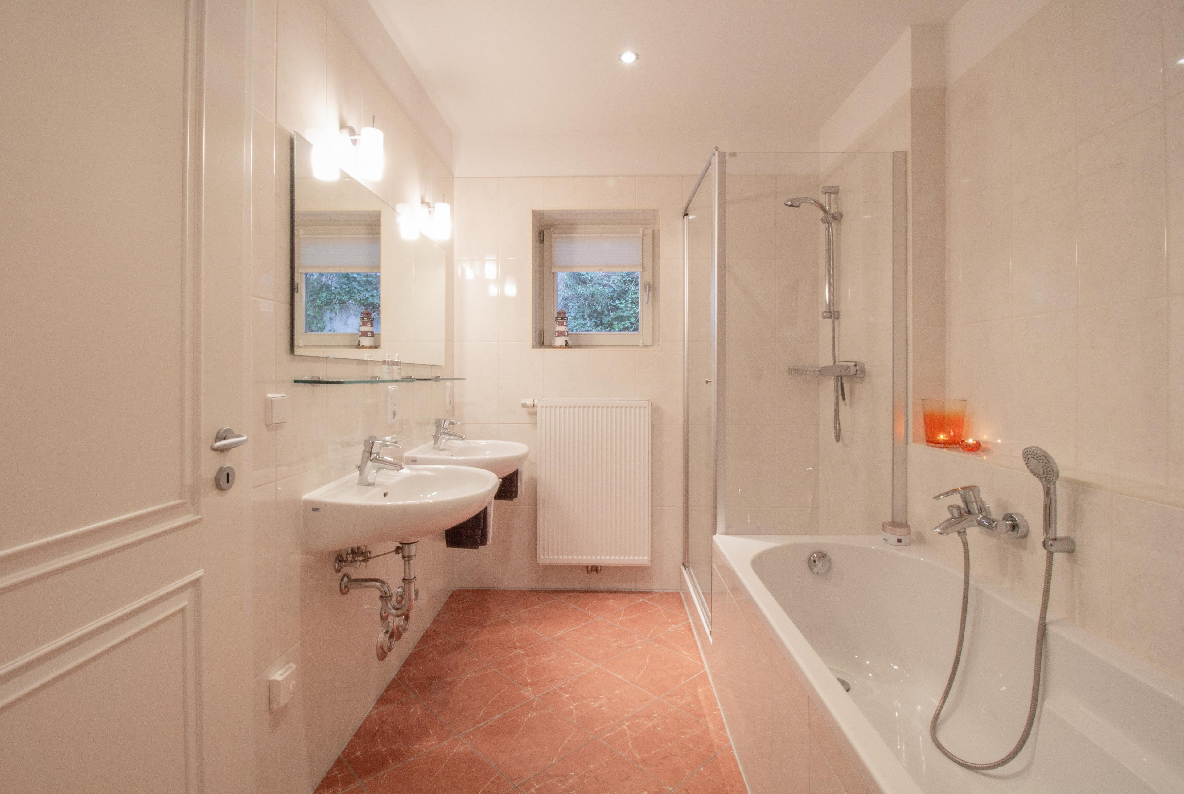 Dieses Zwei-Zimmer-Appartement mit 53 qm Wohnfläche bietet 2-3 Personen Platz für einen angenehmen Inselaufenthalt. Der großzügige Wohnbereich ist mit einer gemütlichen Sitzecke mit Schlaffunktion und FlatTV eingerichtet. Die moderne Vollküche incl. Geschirrspüler, Ceranfeld, Backofen, Kühlschrank etc. ist offen im Wohnraum integriert. Die großzügige offene Loggia beherbergt den Essplatz. Hier bleiben Sie nach den Mahlzeiten gerne noch ein wenig länger sitzen. Im Schlafzimmer finden Sie ein Doppelbett mit getrennten Matratzen (90 x 200), genügend Schrankraum sowie einen zusätzlichen TV. Das Bad bietet sowohl Dusche mit Echtglasabtrennung als auch Badewanne und Doppelwaschbecken/WC. Eine Terrasse in südöstlicher Ausrichtung lockt die Gäste schon zum Frühstück ins Freie. Der Pkw- Stellplatz befindet sich auf dem Grundstück und ist der Wohnung zugeordnet. Waschmaschine und Trockner finden Sie im Keller.