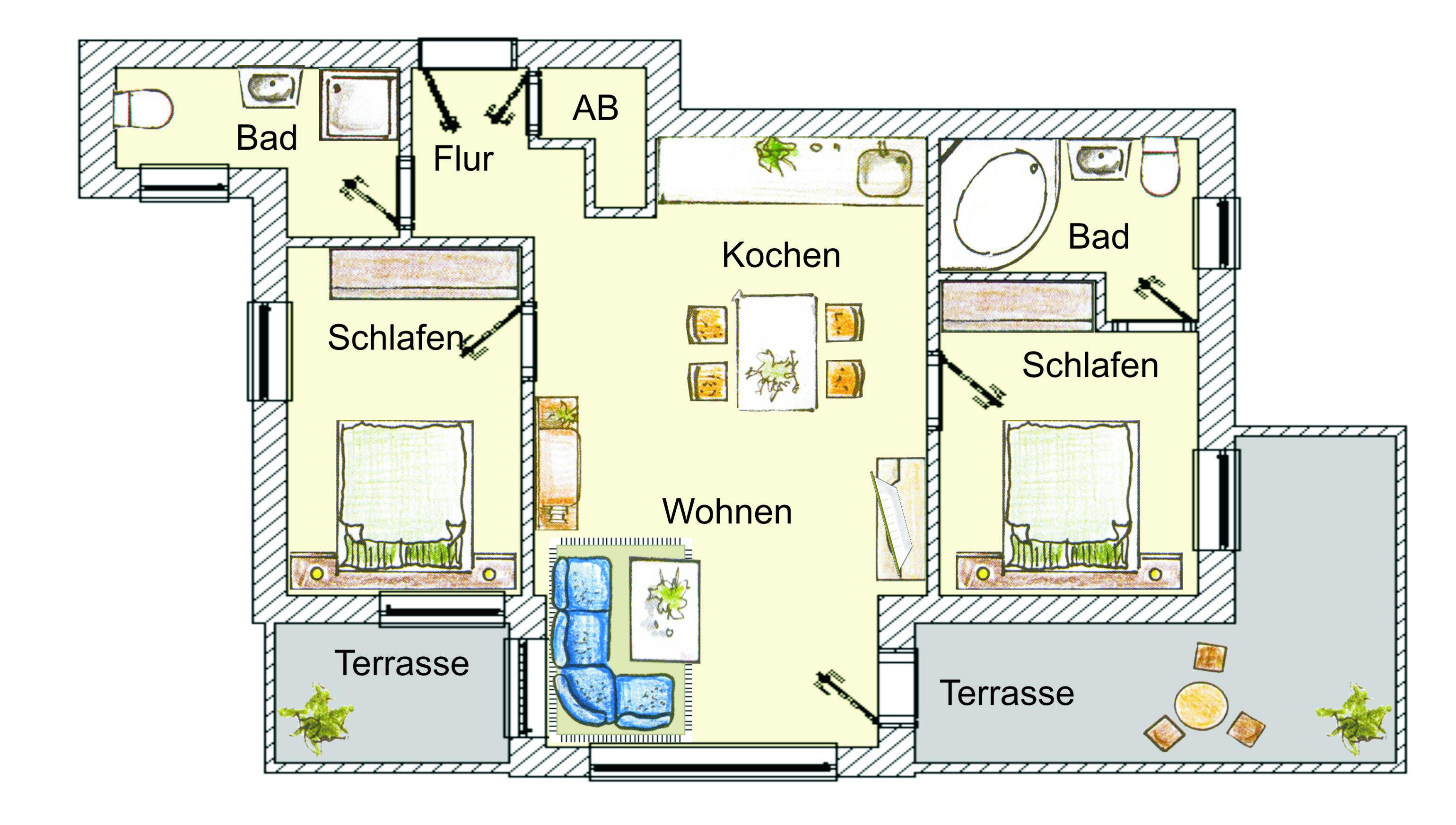 Diese 63 qm große 3-Zimmer Wohnung liegt im Erdgeschoss in südwestlicher Ausrüstung und ist für 4 Personen geeignet. Fühlen Sie sich wohl in diesem geschmackvoll eingerichteten und liebevoll dekorierten Feriendomizil. Der helle freundliche Wohnbereich vereinigt Essen, Kochen und Wohnen. Die gemütliche Wohnlandschaft in der hellen Loggia lädt zum Relaxen ein, Flat TV und Musikanlage sind selbstverständlich. Eine Vollküche, ausgestattet mit Kühlschrank, Geschirrspüler, Cerankochfeld mit Backofen, Mikrowelle etc. sowie ein großer Esstisch stehen im hinteren Wohnbereich zur Verfügung. Beide Schlafzimmer sind jeweils mit einem Doppelbett mit getrennten Matratzen (90 x 200) und ausreichend Schrankraum eingerichtet. Die zwei Bäder bieten Badewanne bzw. Dusche und Waschtisch/WC. Ein Pkw-Stellplatz befindet sich auf dem Grundstück und ist der Wohnung zugeordnet. Waschmaschine und Trockner finden Sie im Keller. Im Winterhalbjahr steht den Gästen an verschiedenen Tagen eine Sauna zur kostenfreien Nutzung bereit.
