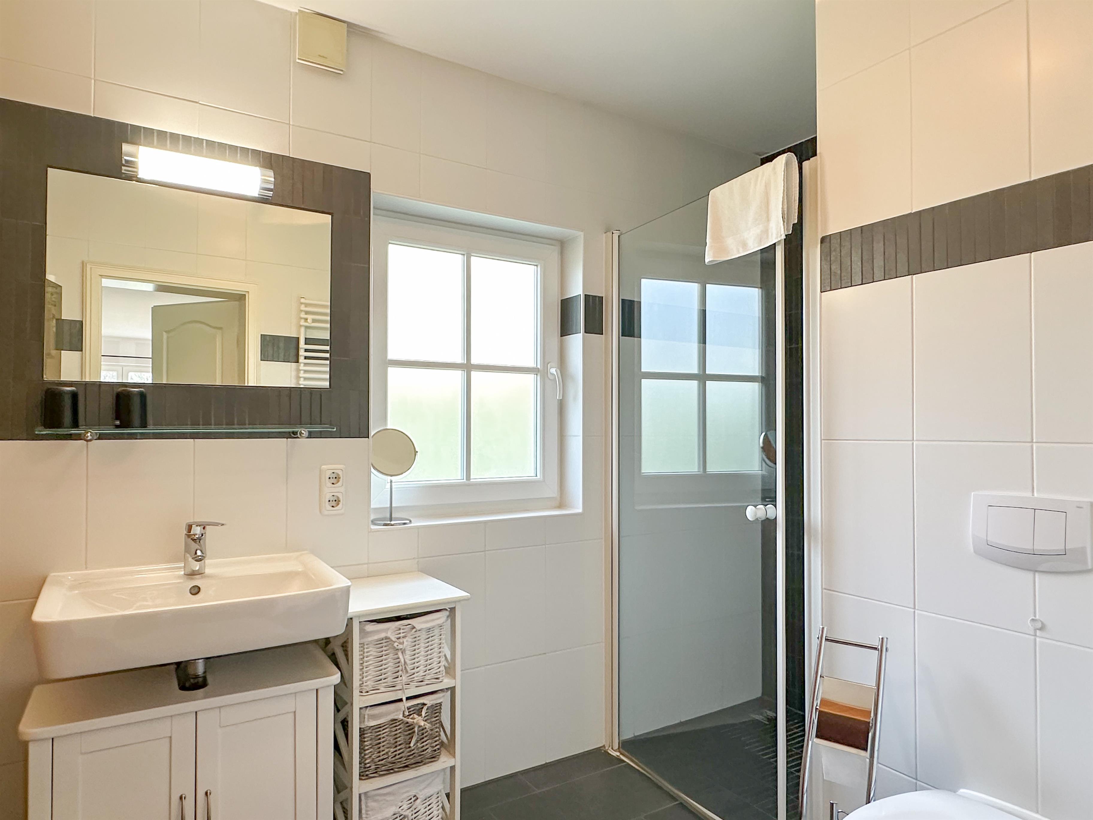 Zusätzlich befindet sich in Obergeschoß ein helles Badezimmer, das dank eines Fensters viel Tageslicht bietet. Es verfügt über eine praktische Dusche, einen modernen Waschtisch sowie ein WC, sodass auch hier für Komfort gesorgt ist. Die geschmackvolle Einrichtung des Badezimmers fügt sich nahtlos in das stimmige Gesamtkonzept des Hauses ein und sorgt dafür, dass Sie sich auch in den sanitären Räumen rundum wohlfühlen können.
