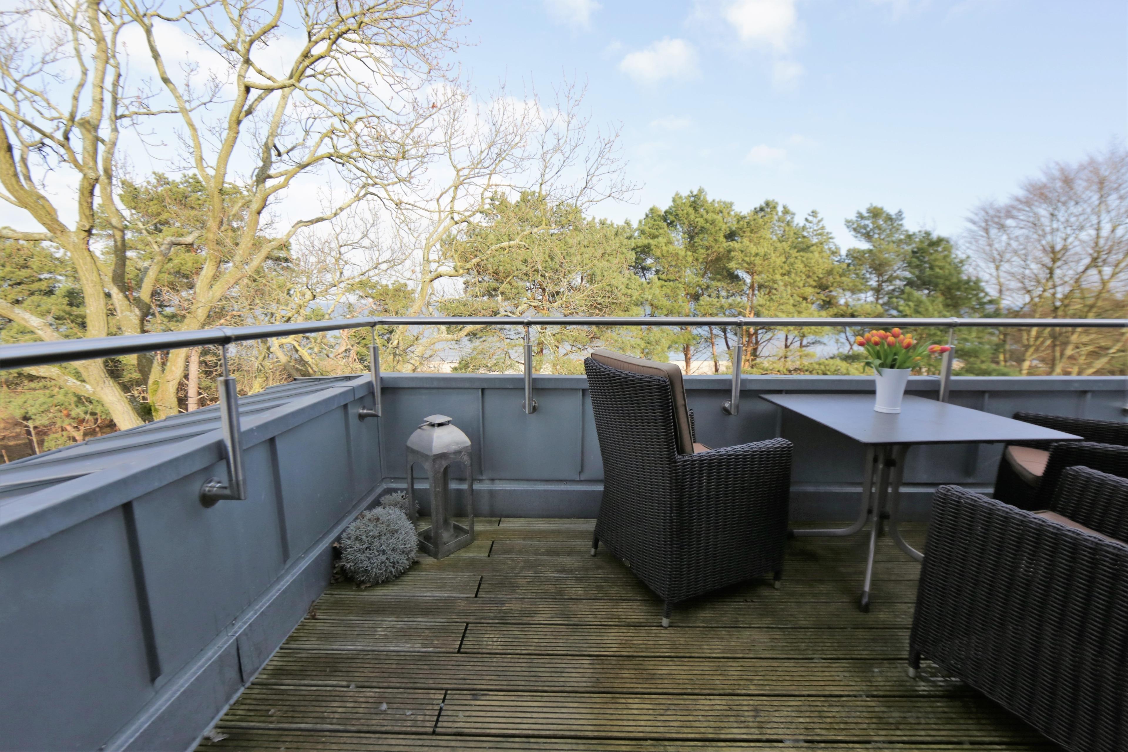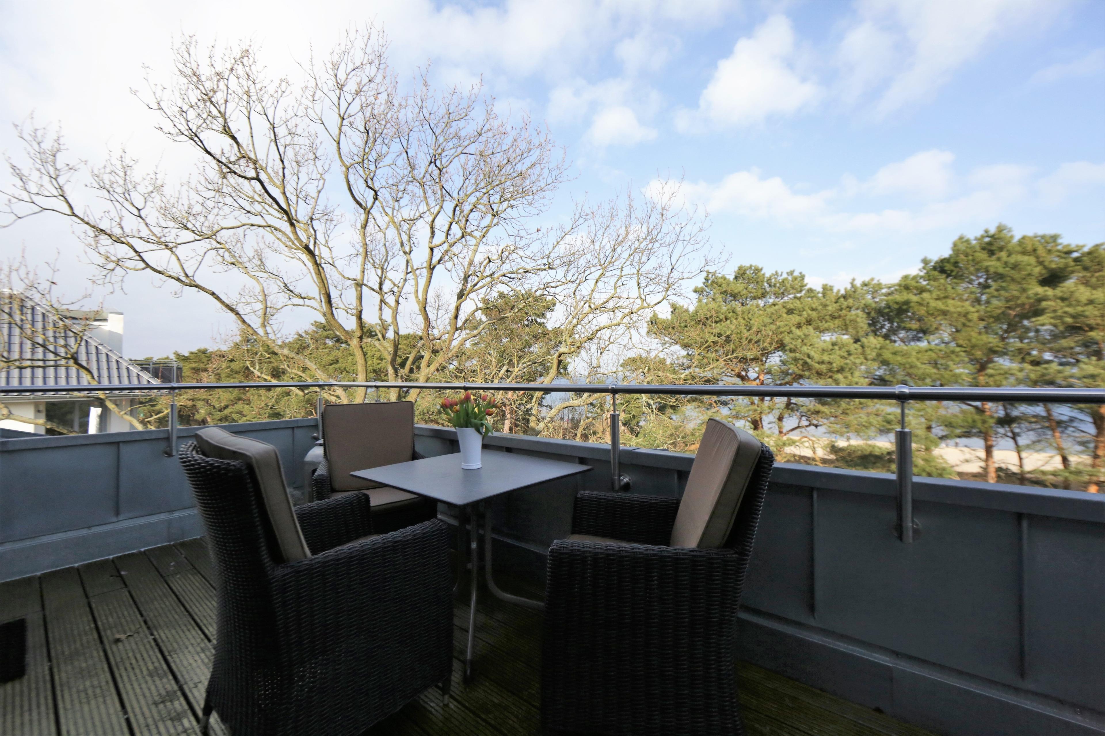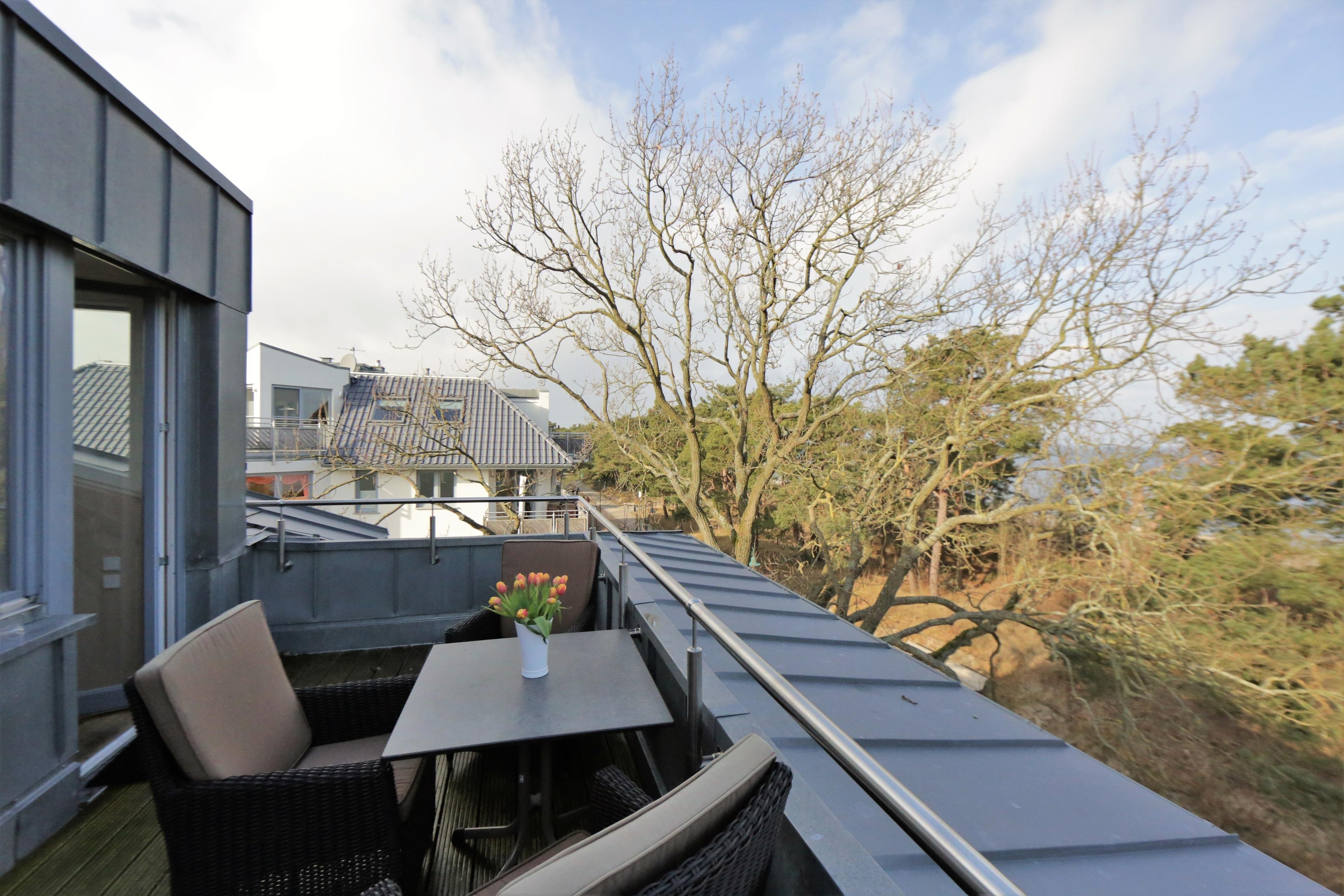 Die liebevoll und hochwertig eingerichtete 2-Zimmer-Wohnung befindet sich im Dachgeschoss. Mit ihren 71 qm bietet diese helle Wohnung für max. 4 Personen viel Platz für einen erholsamen Urlaub. Das Highlight dieser Wohnung ist der traumhafte Blick über die Promenade und teilweise den Strand und die Ostsee vom Wohnzimmer sowie von der Dachterrasse. Der Wohnbereich ist mit einer gemütlichen Couch mit Schlaffunktion (170x200), Couchtisch und Flat TV/Radio eingerichtet. Die Böden sind mit Echtholzparkett belegt. Die zur Seeseite ausgerichtete ca. 14 qm große Dachterrasse, die vom Wohnraum begehbar ist, lockt die Gäste bereits zum Frühstück ins Freie. In dem Lesesessel am westlichen Fenster schaffen Sie endlich ihr Lieblingsbuch zu lesen. Der Essplatz befindet sich ebenfalls im Wohnraum und lädt zu ausgiebigen gemeinsamen Mahlzeiten ein. Die lichtdurchflutete separate Küche ist mit einer modernen Einbauküche mit Cerankochfeld, Backofen, Kühlschrank mit Gefrierfach, Spülmaschine etc. ausgestattet. Das durch eine Schiebetür vom Wohnraum getrennte Schlafzimmer ist mit einem Doppelbett mit getrennten Matratzen und einem mehrtürigen Kleiderschrank eingerichtet. Das Bad ist mit einer Echtglasdusche, Waschtisch/ WC und Waschmaschine ausgestattet. Alle Räume sind mit Außenjalousien ausgerüstet. Ein Pkw-Stellplatz befindet sich auf dem Grundstück und ist der Wohnung zugeordnet.