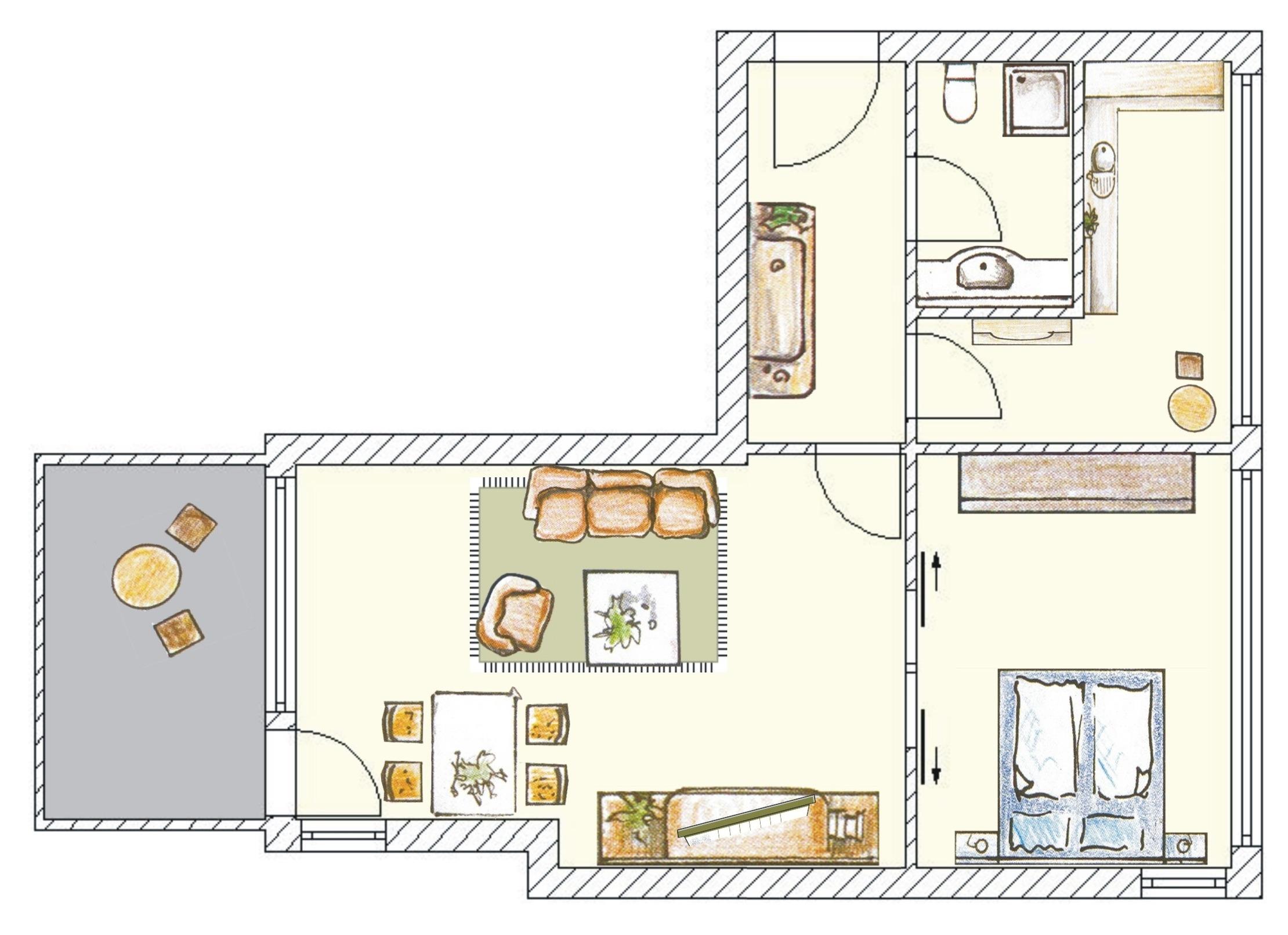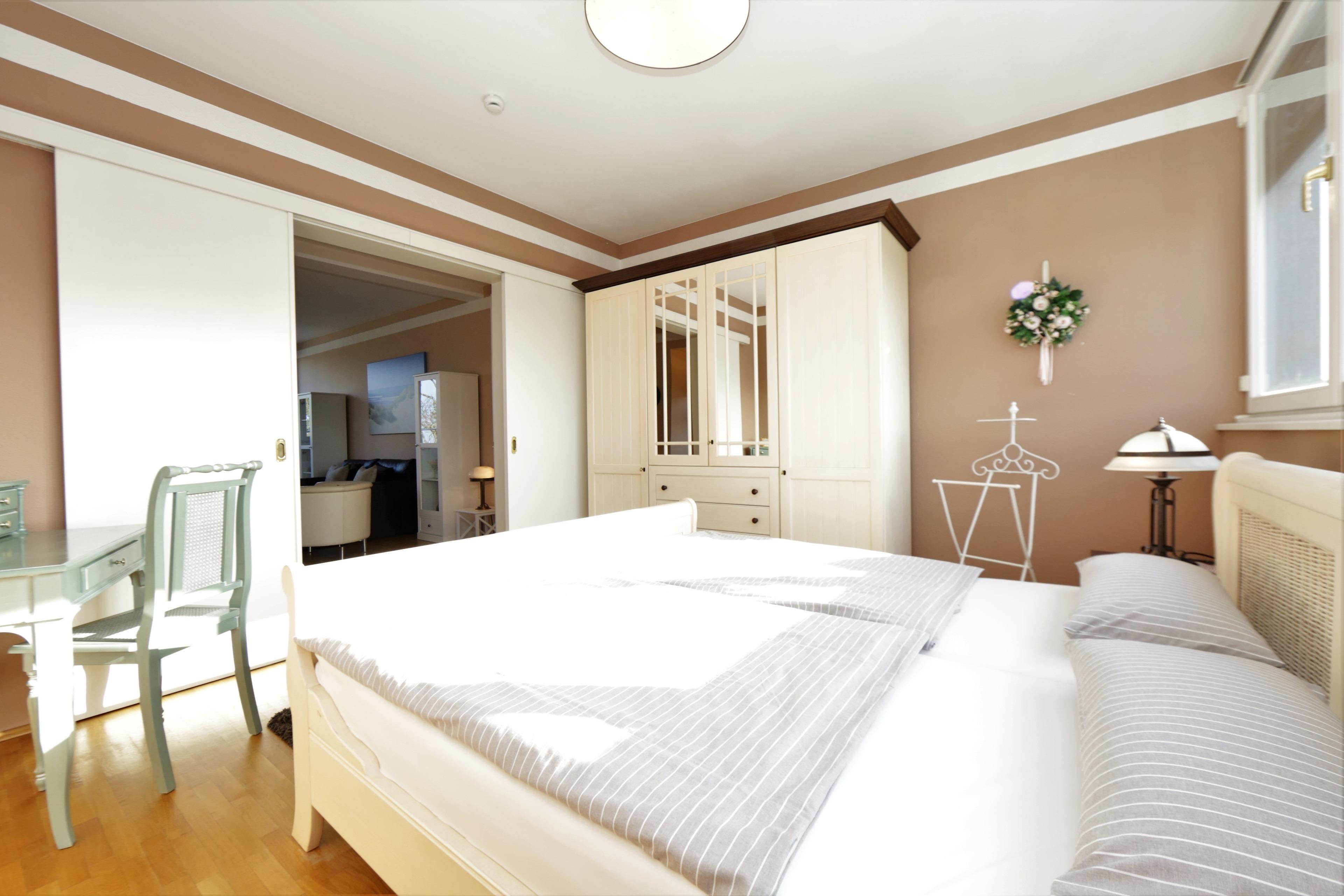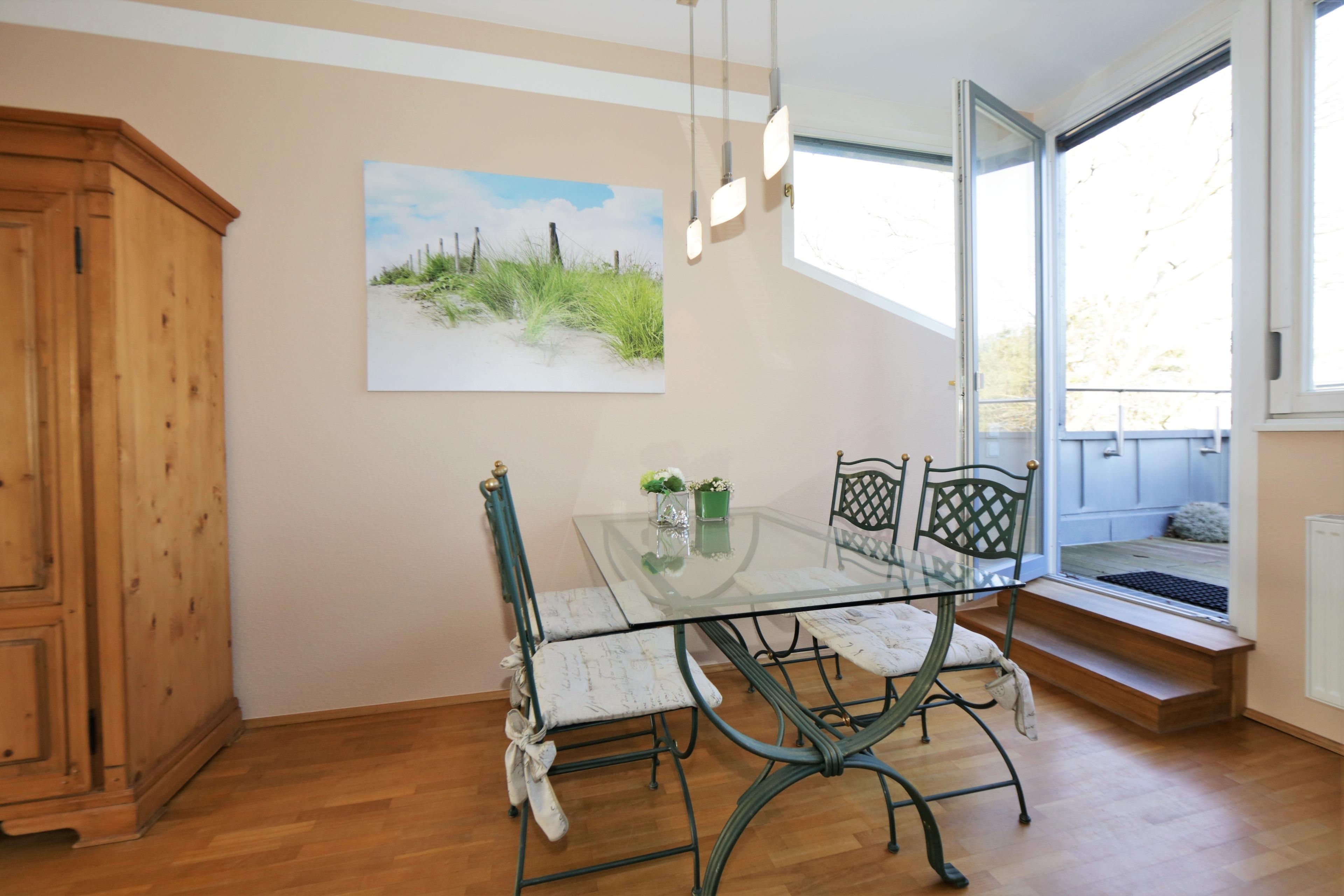 Die liebevoll und hochwertig eingerichtete 2-Zimmer-Wohnung befindet sich im Dachgeschoss. Mit ihren 71 qm bietet diese helle Wohnung für max. 4 Personen viel Platz für einen erholsamen Urlaub. Das Highlight dieser Wohnung ist der traumhafte Blick über die Promenade und teilweise den Strand und die Ostsee vom Wohnzimmer sowie von der Dachterrasse. Der Wohnbereich ist mit einer gemütlichen Couch mit Schlaffunktion (170x200), Couchtisch und Flat TV/Radio eingerichtet. Die Böden sind mit Echtholzparkett belegt. Die zur Seeseite ausgerichtete ca. 14 qm große Dachterrasse, die vom Wohnraum begehbar ist, lockt die Gäste bereits zum Frühstück ins Freie. In dem Lesesessel am westlichen Fenster schaffen Sie endlich ihr Lieblingsbuch zu lesen. Der Essplatz befindet sich ebenfalls im Wohnraum und lädt zu ausgiebigen gemeinsamen Mahlzeiten ein. Die lichtdurchflutete separate Küche ist mit einer modernen Einbauküche mit Cerankochfeld, Backofen, Kühlschrank mit Gefrierfach, Spülmaschine etc. ausgestattet. Das durch eine Schiebetür vom Wohnraum getrennte Schlafzimmer ist mit einem Doppelbett mit getrennten Matratzen und einem mehrtürigen Kleiderschrank eingerichtet. Das Bad ist mit einer Echtglasdusche, Waschtisch/ WC und Waschmaschine ausgestattet. Alle Räume sind mit Außenjalousien ausgerüstet. Ein Pkw-Stellplatz befindet sich auf dem Grundstück und ist der Wohnung zugeordnet.