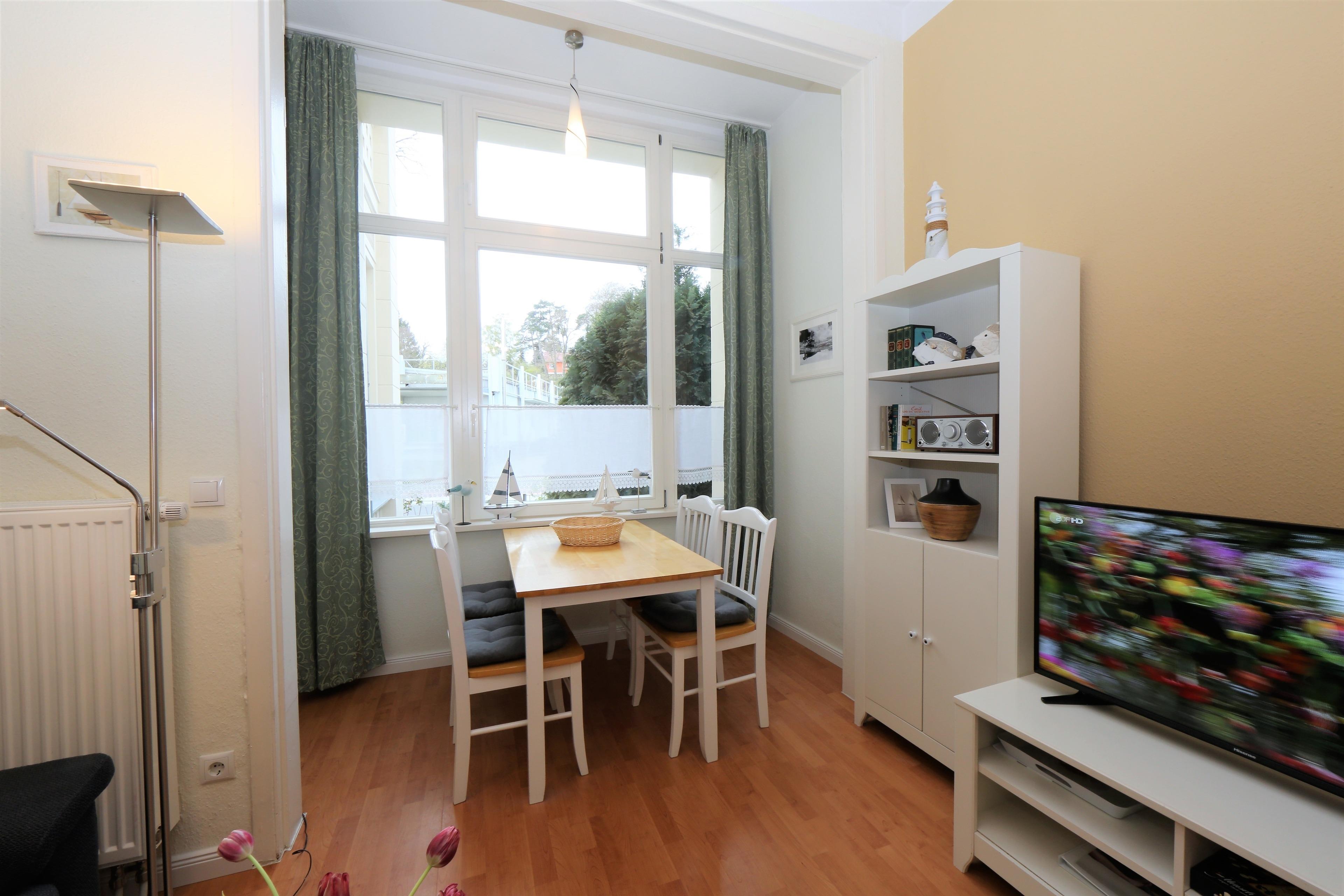 Dieses 45 qm große 2-Zimmer-Appartement im Erdgeschoss bietet 2 bis maximal 3 Personen Platz für einen erholsamen Usedom-Aufenthalt. Im Wohnraum steht den Gästen eine gemütliche Sitzgarnitur (Schlafcouch 1,20 x 2,00 m) zum Relaxen und Fernsehen zur Verfügung. Ein Flat-TV ist selbstverständlich. In der angrenzenden lichtdurchfluteten, geschlossenen Loggia (Fenster lassen sich öffnen) in südlicher Ausrichtung können an einem großen Esstisch die gemeinsamen Mahlzeiten eingenommen werden. Die Küchenzeile mit Geschirrspüler, Ceranfeld, Mikrowelle etc. ist ebenfalls offen im hinteren Wohnbereich integriert. Das großzügige Schlafzimmer ist mit einem Doppelbett mit getrennten Matratzen (90 x 200) und reichlich Schrankraum ausgestattet. Das kleine Bad bietet Dusche sowie Waschbecken/WC.
