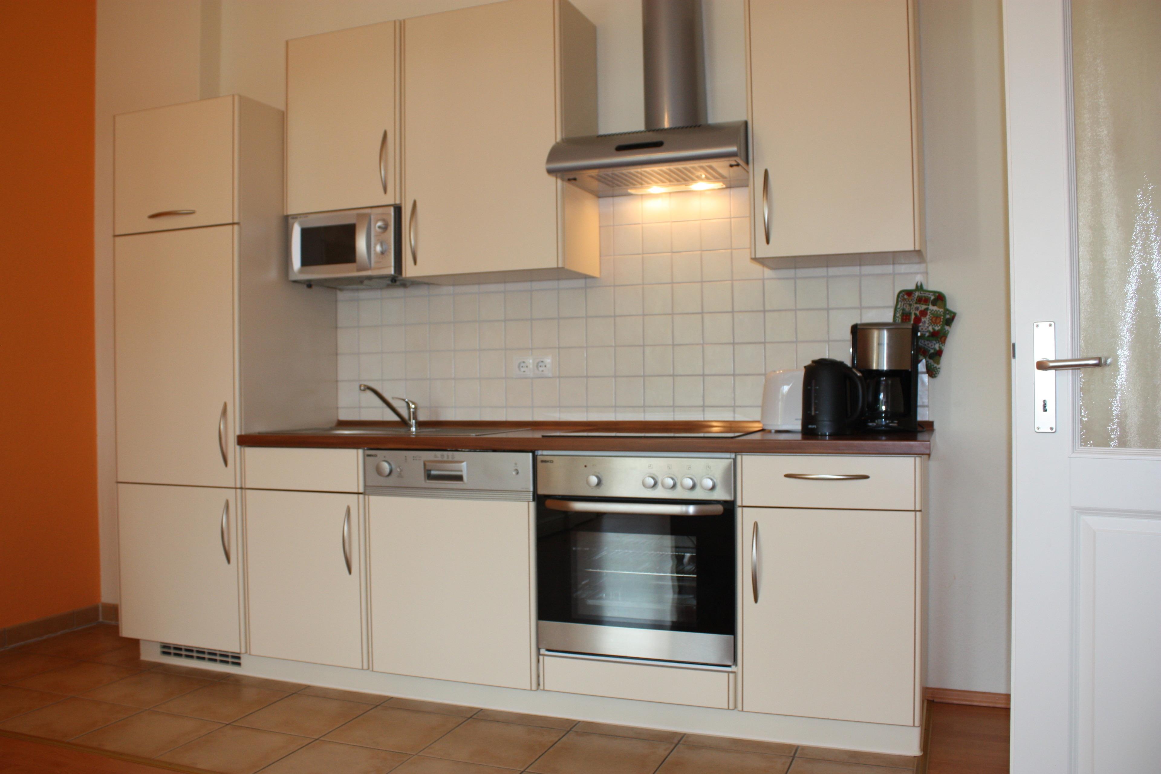 Dieses ca. 48 qm große 2-Zimmer-Appartement liegt im 1. Obergeschoss und ist für maximal 4 Personen geeignet. Im gemütlichen Wohnraum finden die Gäste eine Sitzgarnitur mit TV sowie die offene Vollküche inclusive Geschirrspüler, Cerankochfeld, Kühlschrank, Mikrowelle etc. An dem großen Esstisch in der geräumigen hellen, geschlossenen Loggia (Fenster lassen sich öffnen), die zum Süden gerichtet ist, können die Mahlzeiten eingenommen werden. Das Schlafzimmer ist mit einer Doppelliege mit getrennten Matratzen (90 x 200) und reichlich Schrankraum ausgestattet. Im Badezimmer stehen Dusche, Waschbecken/WC zur Verfügung.