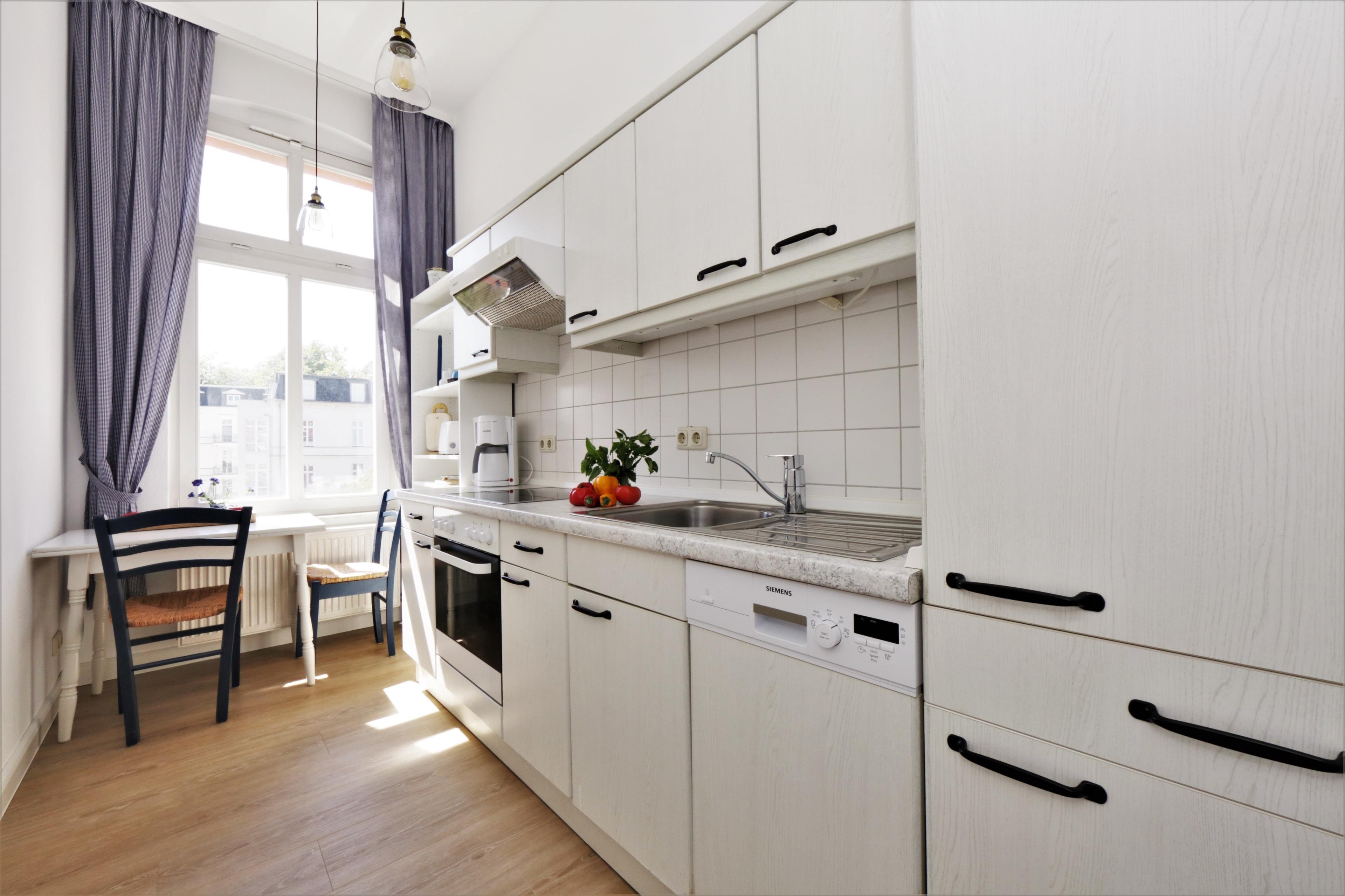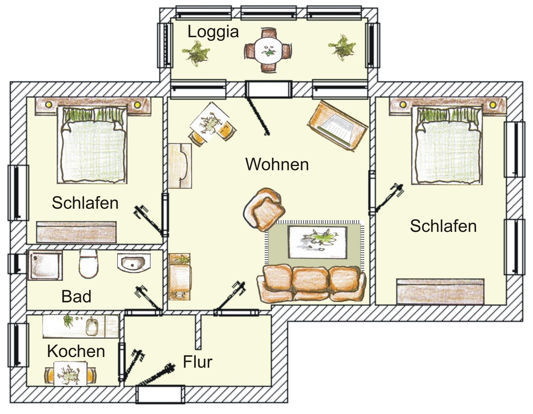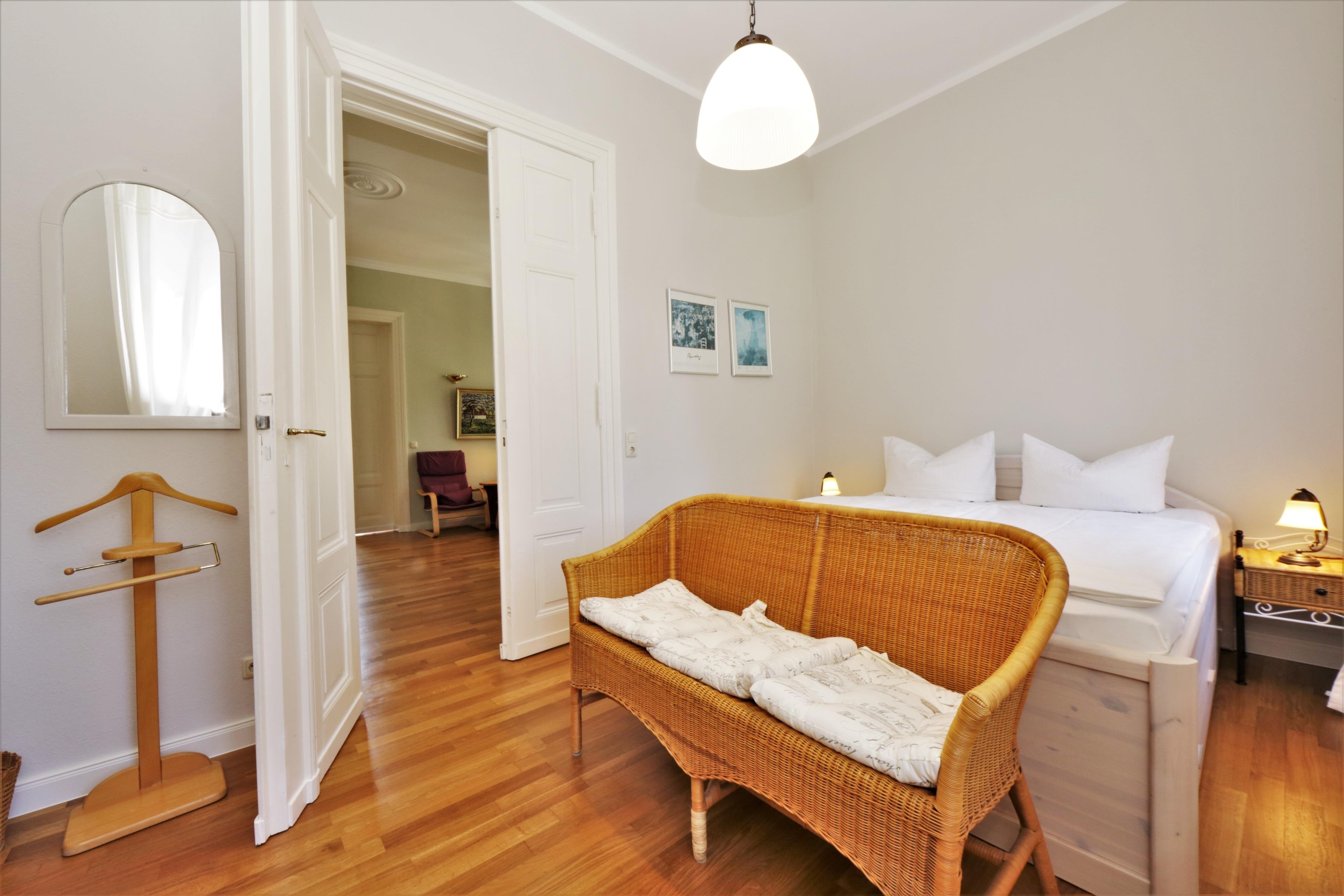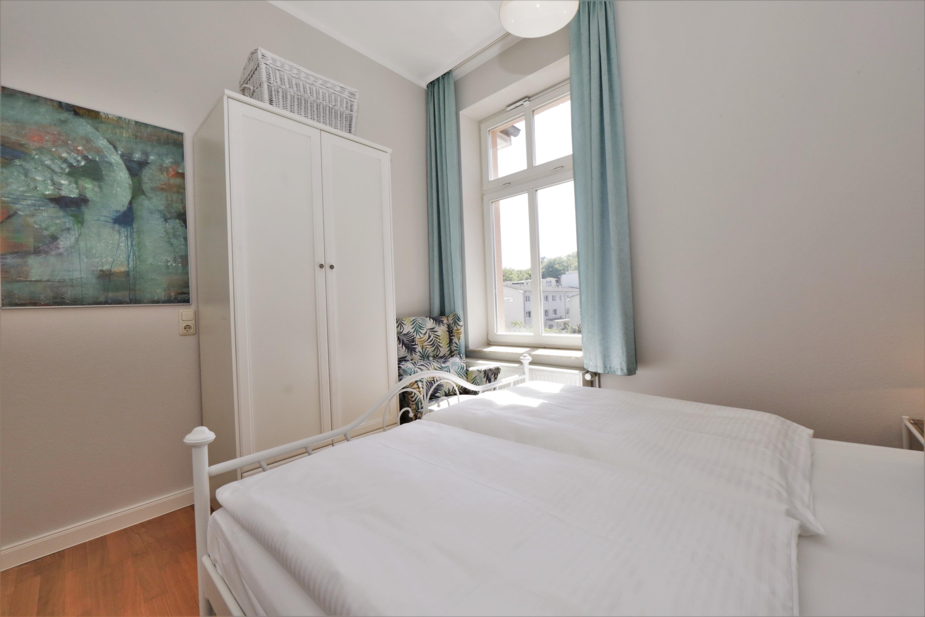 Dieses gemütliche 75 qm große 3-Zimmer-Appartement liegt im ersten Obergeschoss und eignet sich für 4-5 Personen. Der großzügige Wohnraum mit Parkettboden bietet den Gästen eine Couch mit Couchtisch sowie eine kleine Sitzgruppe und Flat-TV sowie Radio. An das Wohnzimmer schließt sich eine geräumige helle, geschlossene Loggia (Fenster lassen sich öffnen) in westlicher Ausrichtung mit teilweisem Seeblick an, in der die Mahlzeiten eingenommen werden können. Zwei Relaxsessel sowie der herrliche Blick laden zu jeder Tageszeit zum Verweilen in der Loggia ein. Von hier aus können Sie das bunte Treiben auf der Promenade beobachten und einen Blick auf die Ostsee erhaschen. Die separate Küche verfügt über eine Vollküche mit Backofen und Cerankochfeld, Geschirrspüler, Kühl- und Gefrierschrank, etc. und einen kleinen Essplatz. Ebenfalls vom Wohnraum begehbar sind die beiden Schlafzimmer, die jeweils mit einem Doppelbett mit getrennten Matratzen (90 x 200) und ausreichend Schrankraum eingerichtet sind. In dem modernen Bad mit Fenster steht Ihnen eine Dusche mit Echtglasabtrennung sowie Waschbecken/WC zur Verfügung. Waschmaschine und Trockner befinden sich im Haus, ein Pkw-Stellplatz auf dem Grundstück.