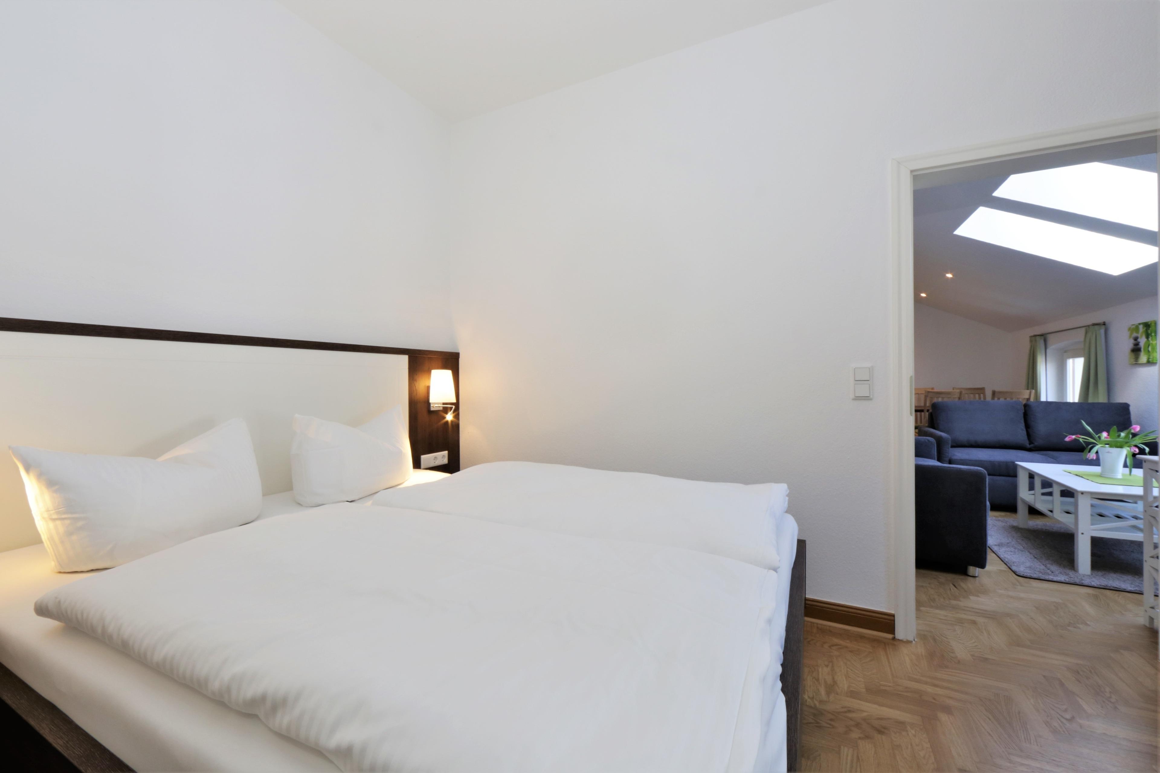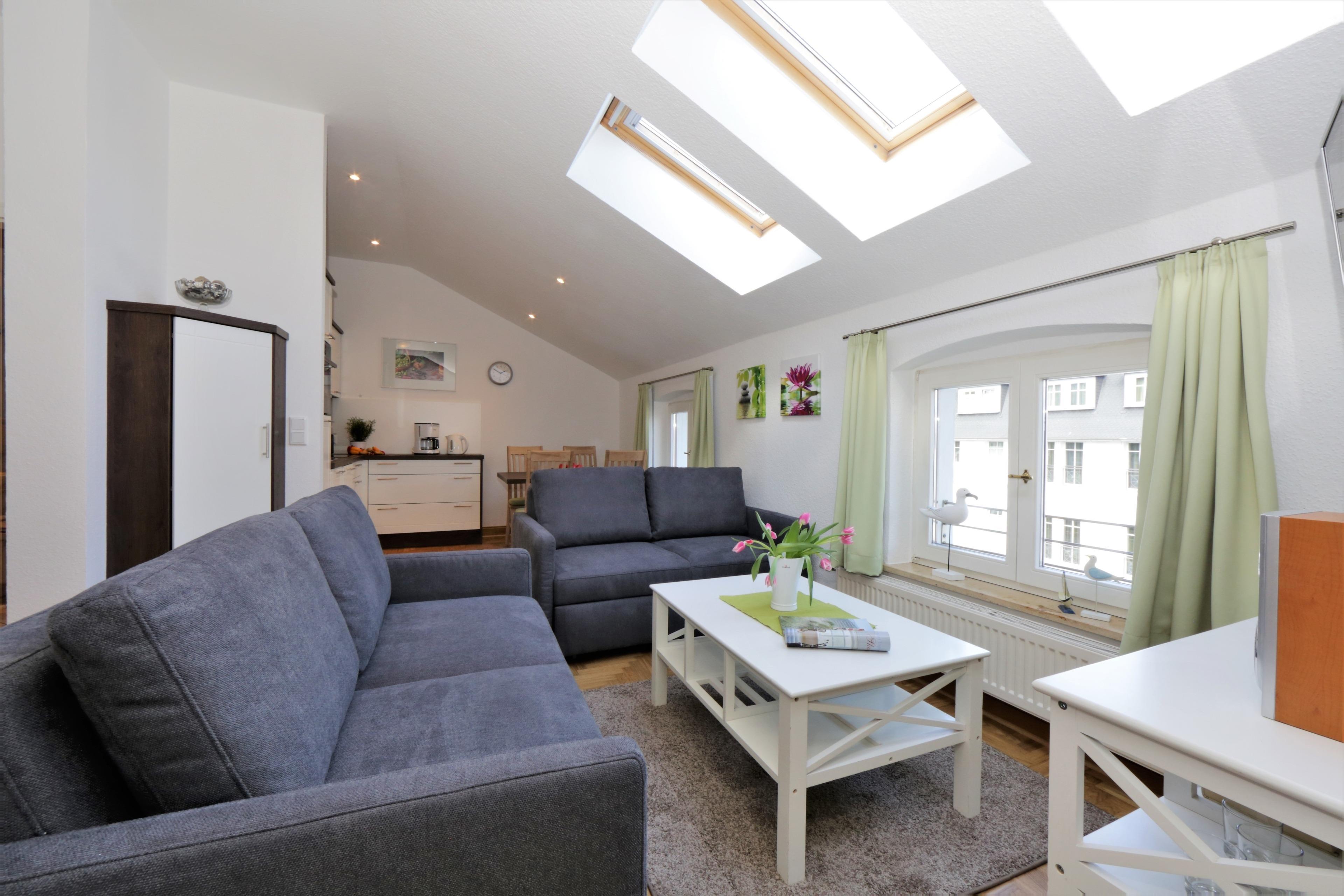 Dieses 40 qm große 2 Zimmer Appartement liegt im 2. Obergeschoss und ist für 2-4 Personen geeignet. Der gemütliche Wohnbereich bietet Ihnen 2 Sofas mit Flat-TV und einen großen Esstisch für gemeinsame Mahlzeiten. Von hier aus haben Sie einen schönen Blick auf das Treiben in der Kulmstraße. Die moderne Wohnküche mit Backofen/Mikrowelle, Ceranfeld, Spülmaschine, Kühlschrank etc. ist ebenfalls offen im Wohnraum integriert. Das großzügige Schlafzimmer ist mit einem Doppelbett mit getrennten Matratzen (80 x 200) sowie einem komfortablen Schlafsofa (Matratze 160 x 200) und reichlich Schrankraum eingerichtet. Da eine der beiden Sofas im Wohnzimmer ebenfalls mit Schlaffunktion (135 x 200) ausgestattet ist, können die 3. und 4. Person wählen, in welchem der beiden Zimmer sie schlafen möchten. Das innenliegende Bad ist mit Dusche und Waschtisch/WC ausgestattet. Außerdem steht den Gästen ein Fahrradkeller zur Verfügung.