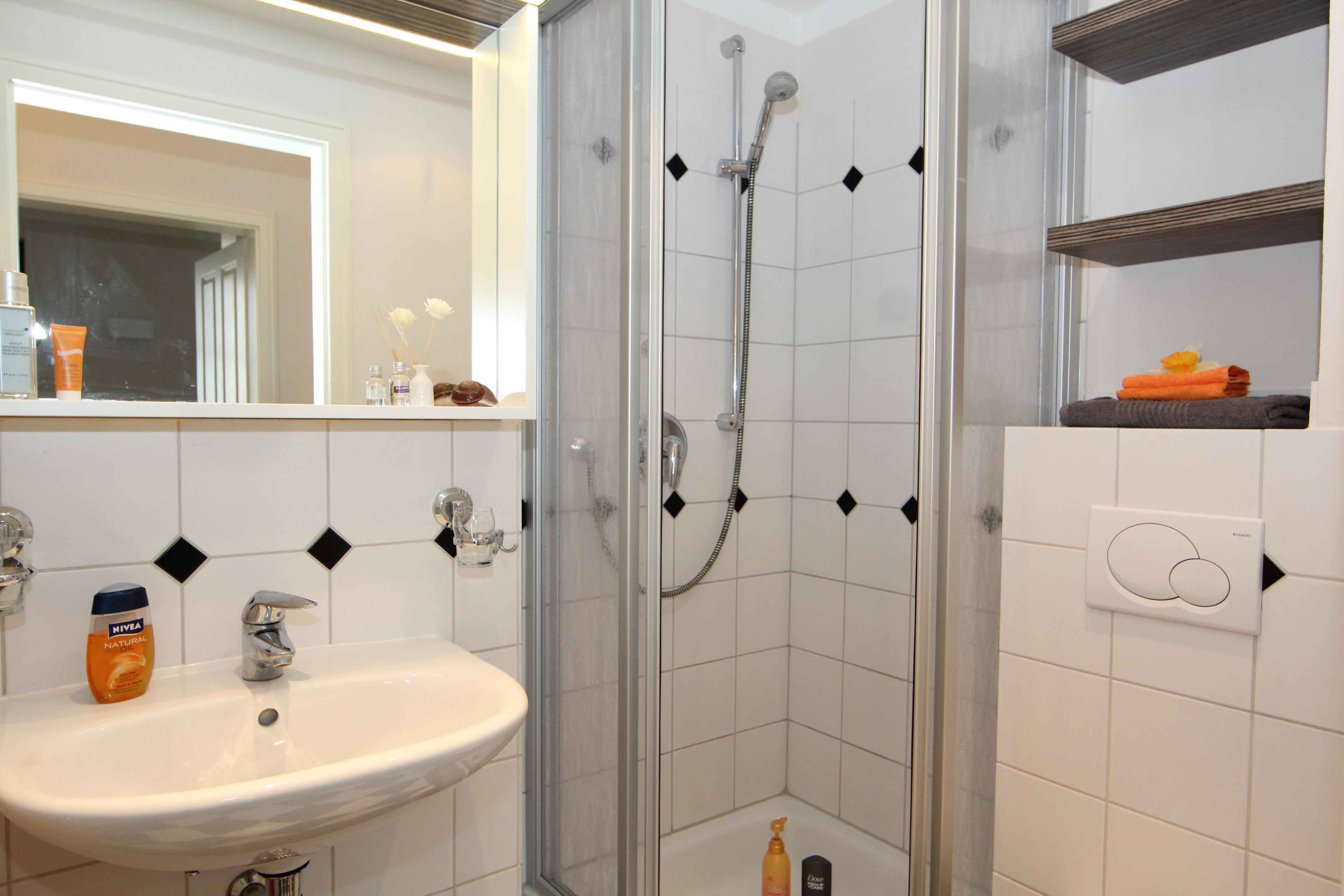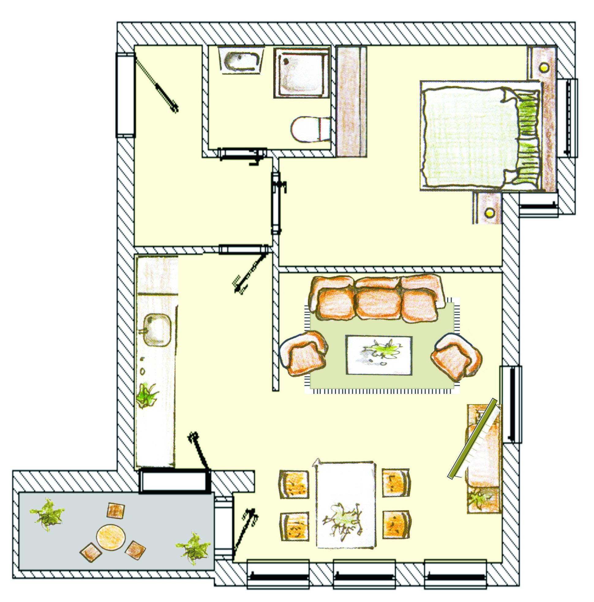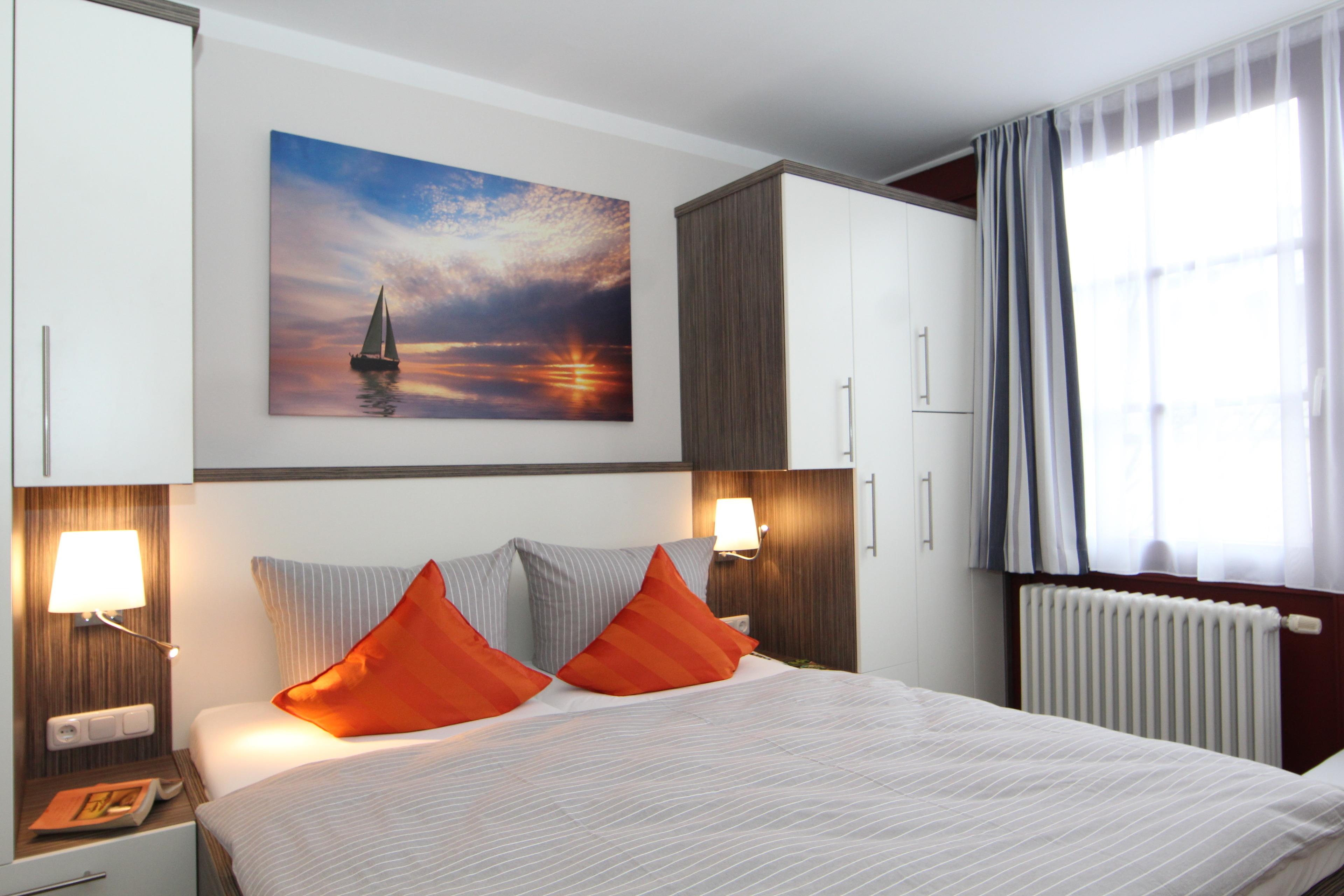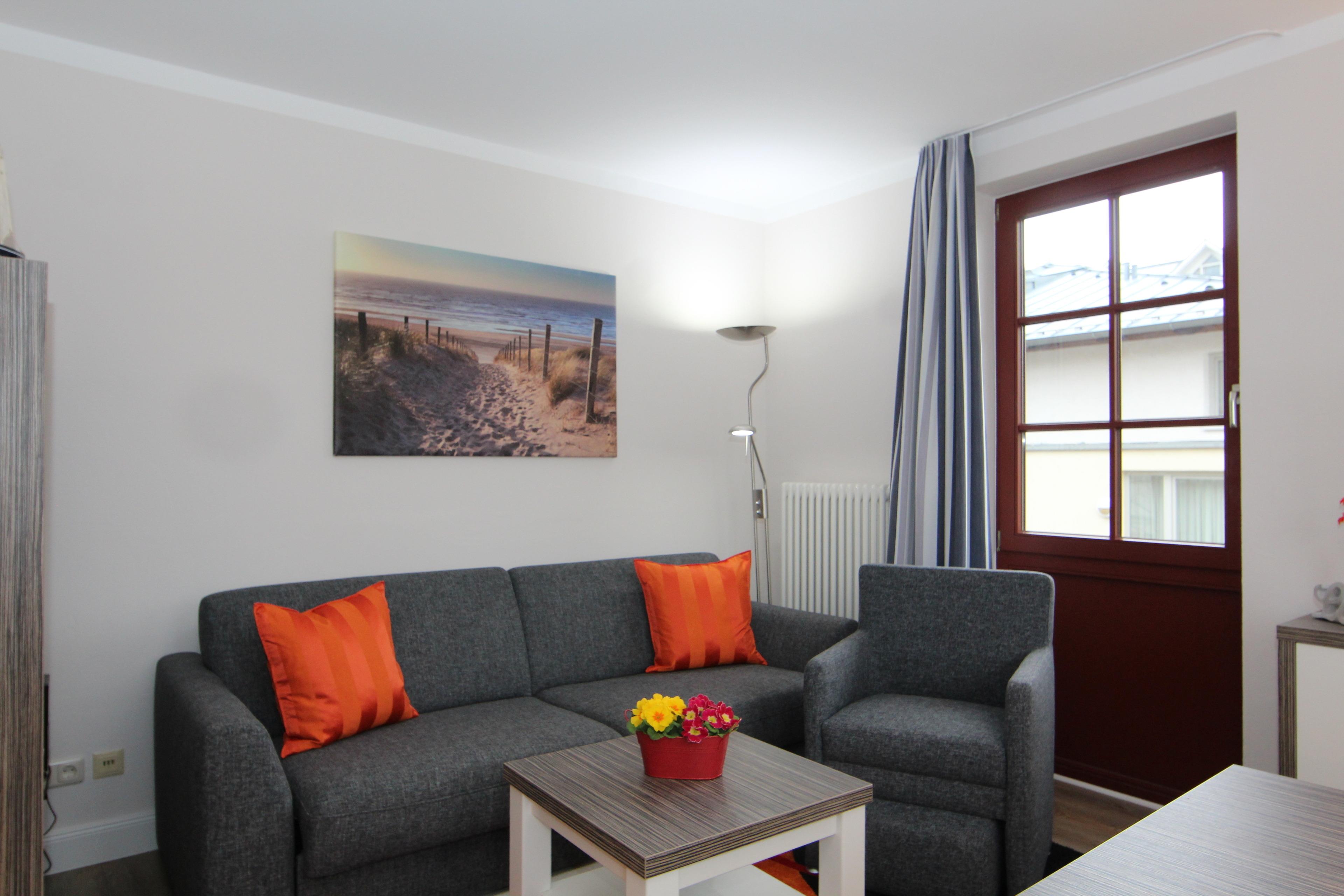 Dieses modern und hochwertig eingerichtete 45 qm große 2-Zimmer-Appartement liegt im 1. Obergeschoss und eignet sich für 2 bis 4 Personen. Der helle Wohnraum ist mit einer gemütlichen Sitzecke (mit Schlaffunktion 160 x 200), Flat TV sowie einem Essbereich für bis zu 4 Personen ausgestattet. Die ebenfalls offen im Wohnbereich integrierte Küchenzeile ist mit Geschirrspüler, Cerankochfeld, Backofen, Kühlschrank etc. ausgestattet. Der vom Wohnraum begehbare Balkon in östlicher Ausrichtung lockt die Gäste schon zum Frühstück ins Freie. Das helle Schlafzimmer verfügt über ein Doppelbett mit getrennten Matratzen (80x200) und einen Kleiderschrank mit Tresor sowie einen zweiten TV. Das Bad ist mit Dusche und Waschtisch/WC ausgestattet.